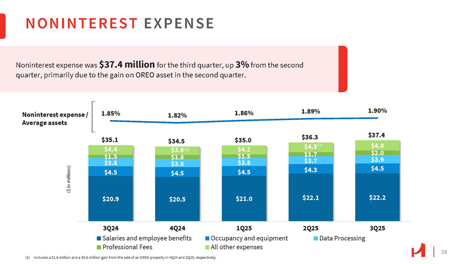 NONInterest Expense28(1)包括分别在24年第四季度和25年第二季度出售一处OREO物业的160万美元和60万美元收益。第三季度非利息支出为3740万美元,比第二季度增长3%,主要是由于第二季度OREO资产的收益。20.9美元20.5美元21.0美元22.1美元22.2美元35.1美元4.4美元1.5美元3.8美元4.5美元35.0美元4.2美元1.5美元3.8美元4.5美元37.4美元4.8美元2.0美元3.9美元4.5美元1.85% 1.82% 1.86% 1.89% 1.90% 3Q24 4Q24工资和员工福利专业费用1Q25占用和设备所有其他费用$ 34.5 $ 3.9(1)$ 1.8 $ 3.8 $ 4.5 $ 36.3 $ 4.5(1)$ 1.7 $ 3.7 $ 4.3 2Q25 3Q25数据处理非利息费用/平均资产(百万美元)