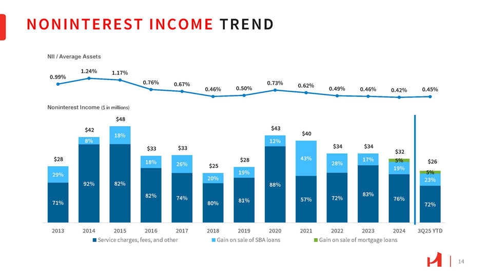 净利息收入&净息差趋势13净息差3.94%净利息收入(百万美元)160美元148美元123美元109美元177美元181美元176美元181美元195美元238美元221美元203美元1733.88% 3.90% 3.95% 3.82% 3.57% 3.37% 3.19% 3.08% 3.50% 3.08% 2.78% 3.11% 201320142015201620172018201920202021202220232024 3Q25 YTD