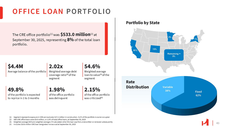 加州$ 2,600 65%德州$ 39510%伊利诺斯州$ 1003%纽约$ 2596%其他$ 66116% CRE构成按州$ 4,015 CRE投资组合地理暴露42加州$ 3854% $ 1724%州建设$ 70其他$ 1522%纽约加州其他$ 28534%业主占州$ 847加州$ 1,83469%德州6% $ 247 $ 494伊利诺斯州9% 58%德州$ 13 $ 481% 6%纽约$ 71%伊利诺斯州$ 753%纽约$ 156其他$ 34613%投资者(非业主占用)按州$ 2,658加州$ 23553% $ 10023%纽约$ 7918%德州伊利诺斯州$ 123%其他$ 143%各州多户家庭440美元(百万美元)