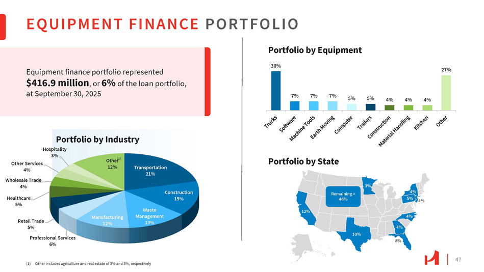 4% 4% 5%剩余= 46% 12% 10% 4% 8% 4% 3%设备融资组合47交通运输21%建筑业15% 美国废物管理 13%制造业12%专业服务6%零售贸易5%其他服务4%批发贸易4%医疗保健5%酒店业3%按行业分类的投资组合其他(1)12%(1)其他包括农业和房地产分别为3%和3%,截至2025年9月30日设备融资组合为4.169亿美元,占贷款组合的6% 30% 7% 7% 7% 5% 4% 4% 4% 27%按国家分类的设备投资组合