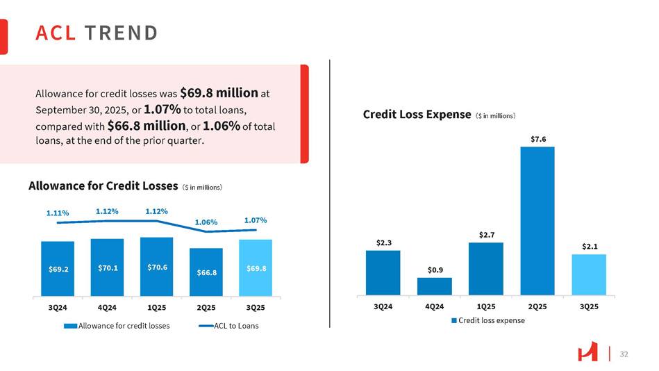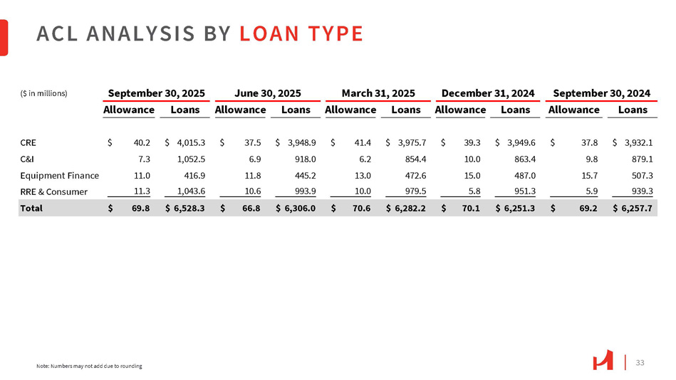 32 $ 69.2 $ 70.1 $ 70.6 $ 66.8 $ 69.8 1.11% 1.12% 1.12% 1.06% 1.07% 3Q24 4Q24 1Q25信贷损失准备金2Q25 3Q25 ACL to loans $ 2.3 $ 0.9 $ 2.7 $ 7.6 $ 2.1 3Q24 4Q24 1Q25信贷损失费用2Q25 3Q25信贷损失准备金截至2025年9月30日为6980万美元,占贷款总额的1.07%,上季度末为6680万美元,占贷款总额的1.06%。信用损失准备金数百万美元信用损失费用数百万美元ACL趋势