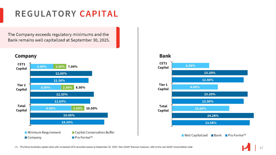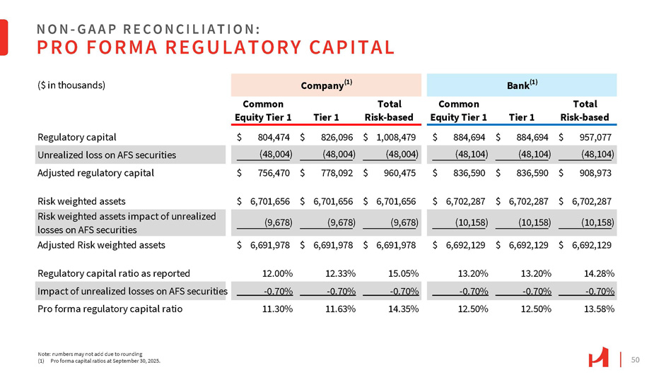 50 NON-G A A P R E C O N C I L I A T I O N:PRO FORMA监管资本银行(1)公司(1)(单位:千美元)基于风险的总一级普通股一级总风险一级普通股一级$ 957,077 $ 884,694 $ 884,694 $ 1,008,479 $ 826,096 $ 804,474监管资本(48,104)(48,104)(48,004)(48,004)(48,004)AFS证券未实现损失$ 908,973 $ 836,590 $ 836,590 $ 960,475 $ 778,092 $ 756,470调整后监管资本$6,702,287美元6,702,287美元6,702,287美元6,701,656美元6,701,656美元6,701,656美元风险加权资产(10,158)(10,158)(10,158)(9,678)(9,678)(9,678)未实现亏损对AFS证券的风险加权资产影响$ 6,692,129 $ 6,692,129 $ 6,691,978 $ 6,691,978 $ 6,691,978调整后风险加权资产14.28% 13.20% 13.20% 15.05% 12.33% 12.00%监管资本比率报告-0.70%-0.70%-0.70%-0.70%-0.70%-0.70%-0.70%未实现亏损对AFS证券的影响13.58% 12.50% 12.50% 14.35% 11.63% 11.30%备考监管资本比率注:由于四舍五入,数字可能不会相加(1)2025年9月30日的备考资本比率。