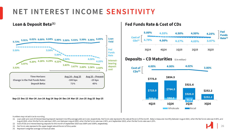265.73% 5.91% 6.02% 6.00% 6.04% 5.95% 5.90% 5.93% 5.99% 5.95% 6.05% 3.53% 3.97% 5.50% 5.50% 5.00% 4.50% 4.20% 4.28% 4.29% 4.22% 3.83% 4.50% 4.25% 3.67% 3.60% 3.58% 3.50% 9月-12月23日-3月23日-6月24日-8月24日-9月24日-12月24日-3月24日-6月25日-9月25日-25日-25日净利息收入敏感性$ 60.0 $ 90.0 $ 1.6 $ 715.0 $ 764.5 $ 520.0 $ 775.0 $ 854.5 $ 521.6 $ 252.2 $ 252.24.00% 4.00% 4.02% 3.80% 4Q25 3Q26 1Q26存款– CD到期日百万美元2Q25 3Q25联邦基金利率(3)CD成本(4)由于四舍五入,数字可能不相加(1)贷款收益率和计息存款成本分别代表月平均收益率和成本。联邦基金利率代表月底的利率。Beta是在2024年8月(联邦基金利率为5.50%)、2025年8月(联邦基金利率为4.50%)、2025年8月(联邦基金利率为4.50%)和2025年9月(联邦基金利率为4.25%)之间按月测量的。(2)CD成本和计息-2025年9月当月存款利率分别为3.93%和3.50%(3)联邦基金利率代表季度末的上限-目标利率(4)代表加权平均合同利率联邦基金利率计息存款成本贷款收益率贷款&存款贝塔(1)联邦基金利率& CDS成本CDS成本(2)时间范围:联邦基金利率变化:存款贝塔:8月24日– 8月25日-100个基点71% 8月25日–现在-25个基点45%