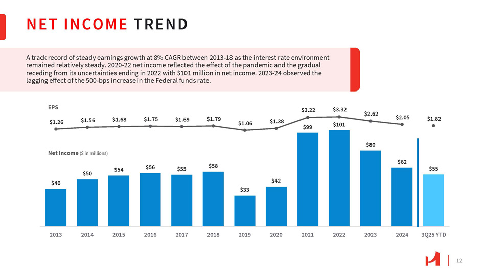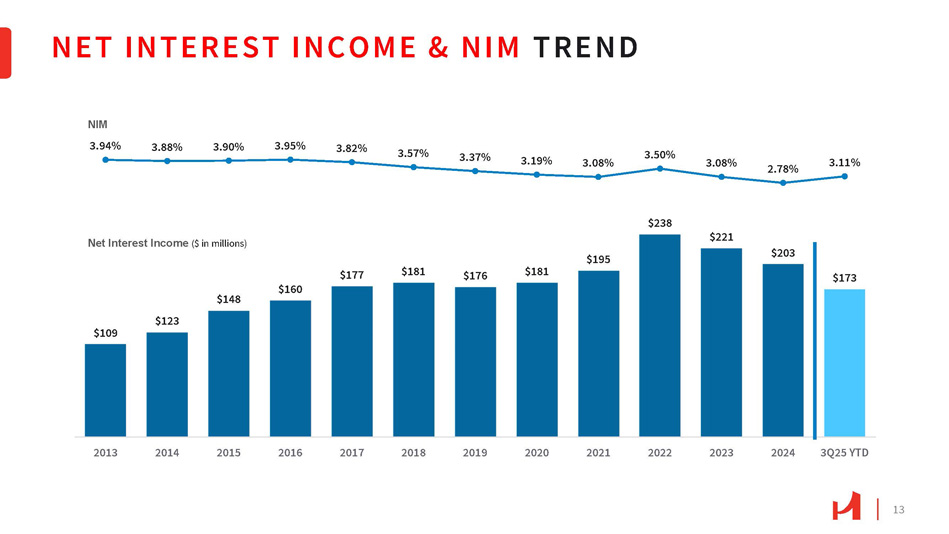40美元50美元54美元56美元55美元58美元33美元42美元99美元101美元80美元62美元55美元1.26美元1.56美元1.68美元1.75美元1.69美元1.79美元1.06美元1.38美元3.22美元3.32美元2.62美元2.05美元1.82美元201320142015201620172018201920202021202220232024 3Q25年初至今净收入趋势12 EPS净收入(百万美元)由于利率环境保持相对稳定,在2013-18年期间,盈利以8%的复合年增长率稳定增长。2022-22年净收入反映了大流行的影响以及从2022年结束的不确定因素中逐渐消退,净收入为1.01亿美元。2023-24年观察到联邦基金利率上调500-bps的滞后影响。