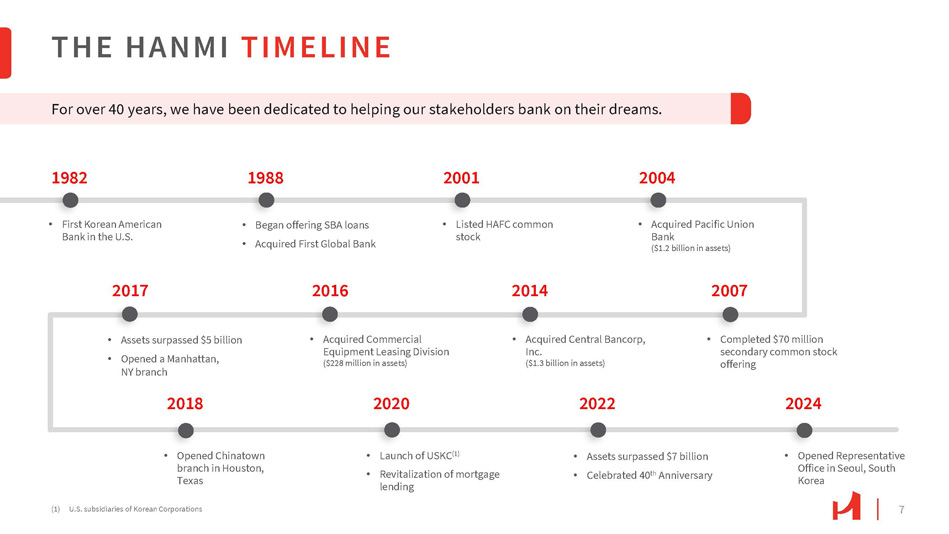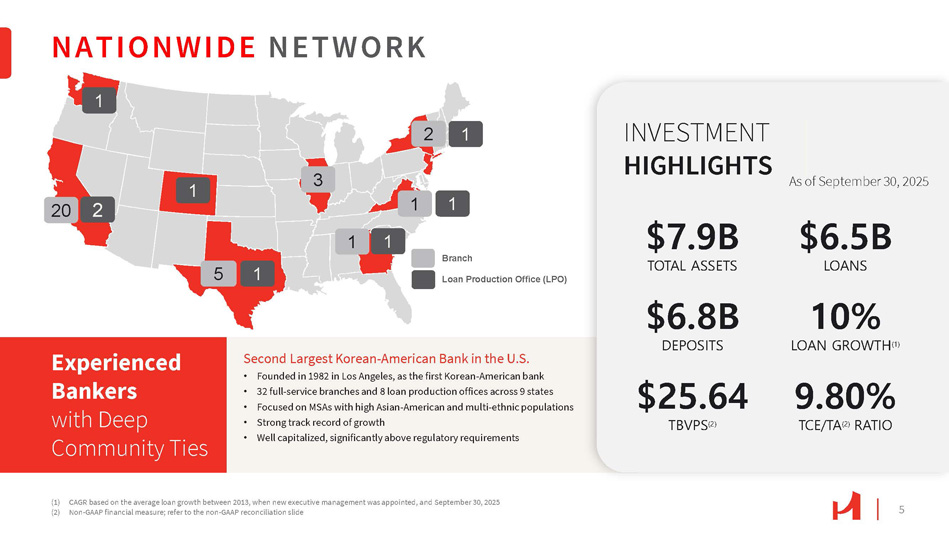 美国第二大韩美银行• 1982年在洛杉矶成立,作为第一家韩美银行•在9个州设有32个全服务分支机构和8个贷款生产办事处•专注于亚裔美国人和多族裔人口较多的MSA •强劲的增长记录•资本充足,显着高于监管要求有经验的银行家与社区关系深厚3111151全国网络12分支机构贷款生产办公室(LPO)1202总资产$ 6.5B贷款$ 6.8B存款10%贷款增长(1)9.80% TCE/TA(2)比率$ 25.64 TBVPS(2)截至2025年9月30日的投资亮点$ 7.9B(1)复合年增长率基于2013年(任命新的执行管理层时)和2025年9月30日之间的平均贷款增长(2)非公认会计准则财务指标;参考非公认会计准则调节幻灯片51