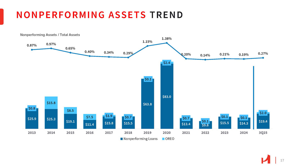 信用损失准备金趋势16信用损失准备金(百万美元)$ 58 $ 53 $ 43 $ 32 $ 31 $ 32 $ 61 $ 90 $ 73 $ 72 $ 69 $ 70 $ 700.84% 0.72% 0.72% 0.70% 1.35% 1.33% ACL/贷款总额2.58% 1.89% 1.85% 1.41% 1.20% 1.12% 1.12% 1.07% 201320142015201620172018201920202021202220232024 3Q25