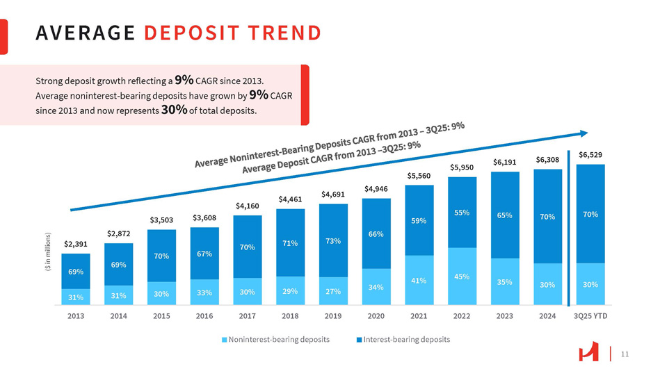 2,902美元2,441美元2,157美元4,039美元3,423美元4,456美元4,508美元4,685美元4,795美元5,597美元5,968美元6,111美元6,251201320142015201620172018201920202021202220232024 3Q25年初至今平均贷款趋势(百万美元)10强劲的平均贷款增长反映了自2013年以来10%的复合年增长率