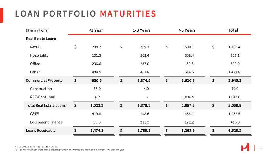 39总计> 3年1-3年< 1年(百万美元)房地产贷款1,106.4 $ 589.1 $ 309.1 $ 208.2 $零售823.13 58.4363.4 101.3招待费533.058.62 37.82 36.6办公室1,482.86 14.5463.8404.5其他3,945.3 $ 1,620.6 $ 1,374.2 $ 950.5 $商业地产70.0-4.066.0建筑1,043.61,036.9-6.7 RRE/Consumer 5,058.9 $ 2,657.5 $ 1,378.2 $ 1,0 23.2 $房地产贷款总额1,052.54 34.11 98.64 19.8 C & I(1)416.81 72.22 11.33 3.3设备财务6,528.2 $ 3,263.9 $ 1,788.1 $ 1,476.3 $应因四舍五入未加(1)3.795亿美元C & I为预计续延并维持一年以下期限的信贷额度
