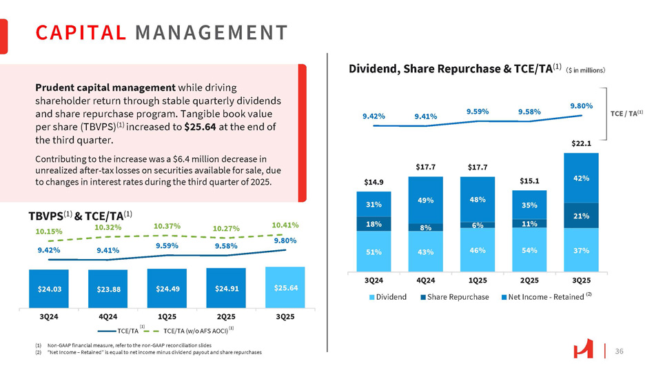 3642% $ 14.9 $ 17.7 $ 17.7 $ 15.1 $ 22.19.42% 9.41% 9.59% 9.58% 9.80% 3Q24股息4Q24 1Q25股票回购2Q25 3Q25净收益-留存(2)$ 24.03 $ 23.88 $ 24.49 $ 24.91 $ 25.64 3Q24 4Q24 3Q25(1)TCE/TA 1Q25 2Q25 TCE/TA(w/o AFS AOCI)(1)(1)Non-GAAP财务指标,参见非GAAP调节幻灯片(2)“净收入-留存”等于净收入减去股息支付和股份回购资本管理TCE/TA(1)审慎的资本管理,同时通过稳定的季度股息和股份回购计划推动股东回报。每股有形账面价值(TBVPS)(1)在第三季度末增至25.64美元。由于2025年第三季度的利率变化,可供出售证券的未实现税后亏损减少了640万美元,这是造成这一增长的原因。35% 48% 49% 31% 21% 11% 6% 8% 18% 10.41% 10.27% 10.37% TBVPS(1)& TCE/TA(1)10.15% 10.32% 37% 54% 46% 43% 51% 9.80% 9.58% 9.59% 9.42% 9.41%股息、股份回购& TCE/TA(1)百万美元