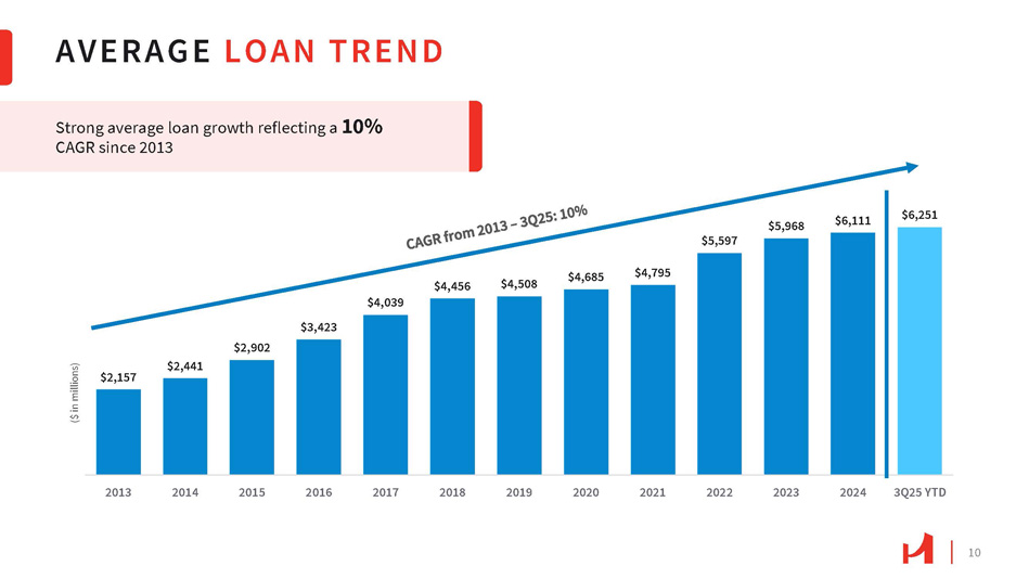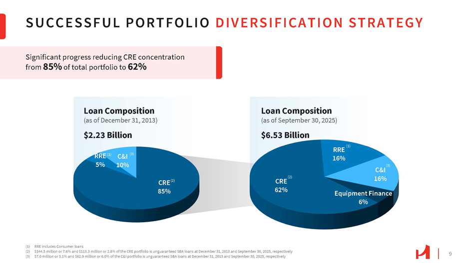 RRE(1)5% CRE(2)85% C & I(3)10% Equipment Finance 6%(2)CRE 62%(3)C & I 16%贷款构成(截至2013年12月31日)22.3亿美元贷款构成(截至2025年9月30日)65.3亿美元RRE(1)16%成功的投资组合多元化战略重大进展将CRE集中度从总投资组合的85%降至62%(1)RRE包括消费者贷款(2)1.445亿美元或7.6%和1.133亿美元或2.8%的CRE投资组合为2013年12月31日和2025年9月30日的无担保SBA贷款,分别(3)在2013年12月31日和2025年9月30日,C & I投资组合中分别有700万美元或3.1%和6290万美元或6.0%为无担保SBA贷款9