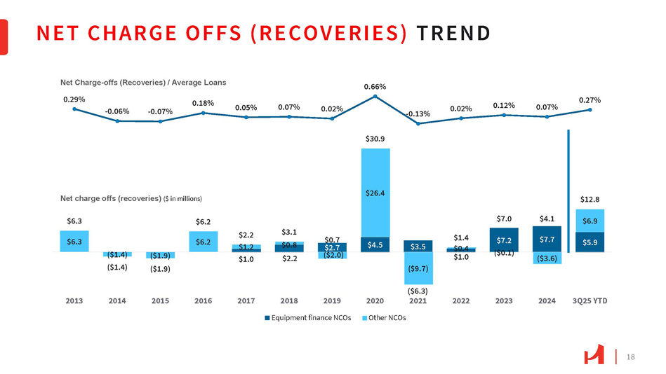 不良资产趋势17不良资产/总资产不良资产(百万美元)$ 63.8 $ 83.0 $ 9.8 $ 15.8 $ 0.1 $ 2.4 0.87% 0.97% 0.65% 0.40% 0.34% 0.29% 1.15% 1.38% 0.20% 0.14% 0.21% 0.19% 0.27% $ 2.0 $ 0.1 $ 0.1 $ 0.1 $ 15.5 $ 14.3 $ 19.4 $ 19.4 $ 0.1 $ 0.7 $ 13.4 $ 0.7 $ 15.5 $ 1.9 $ 15.8 $ 7.5 $ 11.4 $ 0.8 $ 8.5 $ 25.9 $ 25.3 $ 19.1 3Q25 2024202320222021202020202019201820172016201520142013不良贷款OREO不良资产/总资产