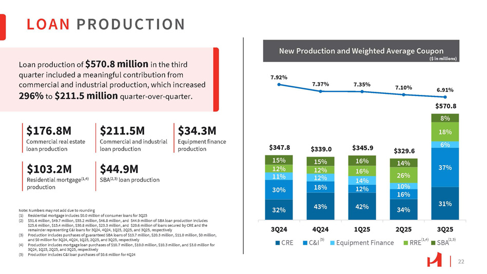 贷款生产22第三季度5.708亿美元的贷款生产包括来自商业和工业生产的有意义的贡献,该季度环比增长296%至2.115亿美元。注:由于四舍五入,数字可能不相加(1)住宅抵押贷款包括25年第三季度的0.0万美元消费者贷款(2)5160万美元、4970万美元、5520万美元、4680万美元、4490万美元的SBA贷款生产包括由CRE担保的2560万美元、1540万美元、3080万美元、2330万美元和2060万美元贷款,其余分别为24年第三季度、24年第四季度、25年第一季度、25年第二季度和25年第三季度的C & I贷款(3)生产包括购买24年第四季度、24年第四季度、25年第一季度、25年第二季度和25年第三季度的1370万美元、2030万美元、1100万美元、0万美元和0万美元的担保SBA贷款,分别(4)生产包括抵押贷款采购1070万美元、1000万美元、1030万美元、以及3Q24、1Q25、2Q25和3Q25的300万美元,分别(5)生产包括60万美元的C & I贷款购买,用于Q4 1.768亿美元的商业房地产贷款生产2.115亿美元的商业和工业贷款生产3430万美元的设备融资生产1.032亿美元的住宅抵押贷款(1,4)生产4490万美元的SBA(2,3)贷款生产32% 43% 42% 31% 37% 6% $ 347.8 15% 12% 11% 30% $ 339.015% 12% 12% 18% $ 345.9 16% 16% 14% 12% $ 329.614% 26% 10% 16% 34% $ 570.88% 18% 7.92% 7.37% 7.35% 7.10% 6.91% 4Q24 C & I(5)3Q25 SBA(2,3)3Q24 CRE 1Q25设备金融2Q25 RRE(1,4)新产量和加权平均CouN