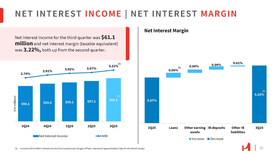 25 $ 50.1 $ 53.4 $ 55.1 $ 57.1 2.74% 2.91% 3.02% 3.07% 3.22% 3Q24 4Q24 1Q25净利息收入2Q25 3Q25 NIM净利息收入|净利率(百万美元)(1)$ 61.1 3.07%(1)3.22% 0.06% 0.04% 0.04% 0.01% 2Q25贷款其他IB负债3Q25其他收益IB-存款资产增加减少第三季度净利息收入为6110万美元,净息差(应税等值)为3.22%,均比第二季度有所上升。净利息收益率(1)包括从先前冲销的贷款中收回的60万美元利息;代表约3个基点的净利息收益率(1)(1)