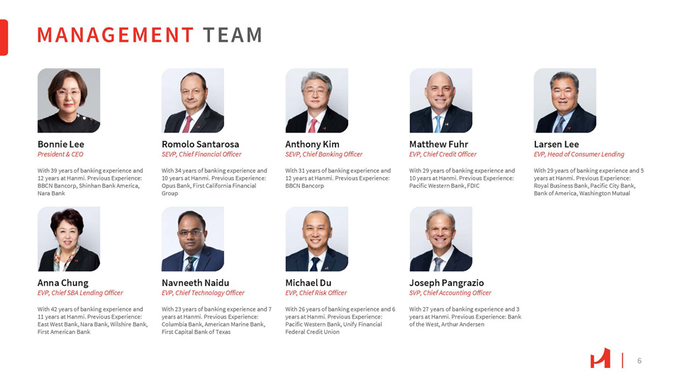 管理团队6 Bonnie Lee总裁兼首席执行官,拥有39年银行经验,曾在Hanmi任职12年。曾任职经历:BBCN Bancorp,Shinhan Bank America,Nara Bank Romolo Santarosa SEVP,首席财务官,拥有34年银行从业经验,在Hanmi任职10年。历任经验:Opus Bank,First California Financial Group Anthony Kim SEVP,首席银行官,31年银行从业经验,曾在Hanmi任职12年。曾任职经历:BBCN Bancorp Matthew Fuhr执行副总裁,首席信贷官,29年银行从业经验,曾在Hanmi任职10年。历任经历:Pacific Western Bank,FDIC执行副总裁Larsen Lee,消费贷款主管,29年银行从业经验,在Hanmi任职5年。曾任职经历:皇家商业银行、太平洋城市银行、美国银行、Washington Mutual Anna Chung执行副总裁、SBA首席贷款官,拥有42年银行从业经验,曾在Hanmi任职11年。曾任职经历:华美银行、奈良银行、威尔夏银行、第一美国银行Navneeth Naidu执行副总裁,拥有23年银行从业经验的首席技术官,曾在Hanmi任职7年。历任经历:哥伦比亚银行、美国海洋银行、第一资本德州银行Michael Du执行副总裁、首席风险官拥有26年银行从业经验,曾在Hanmi任职6年。历任经历:太平洋西部银行,统一金融联邦信用合作社Joseph Pangrazio高级副总裁,首席财务官拥有27年银行从业经验,在Hanmi任职3年。既往经历:西部银行、安达信