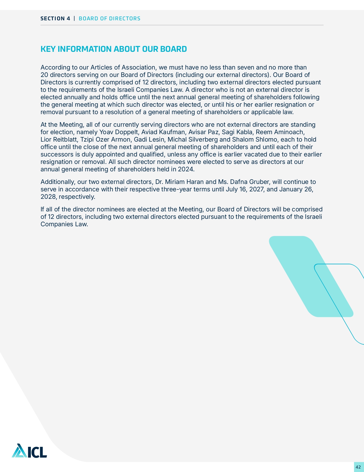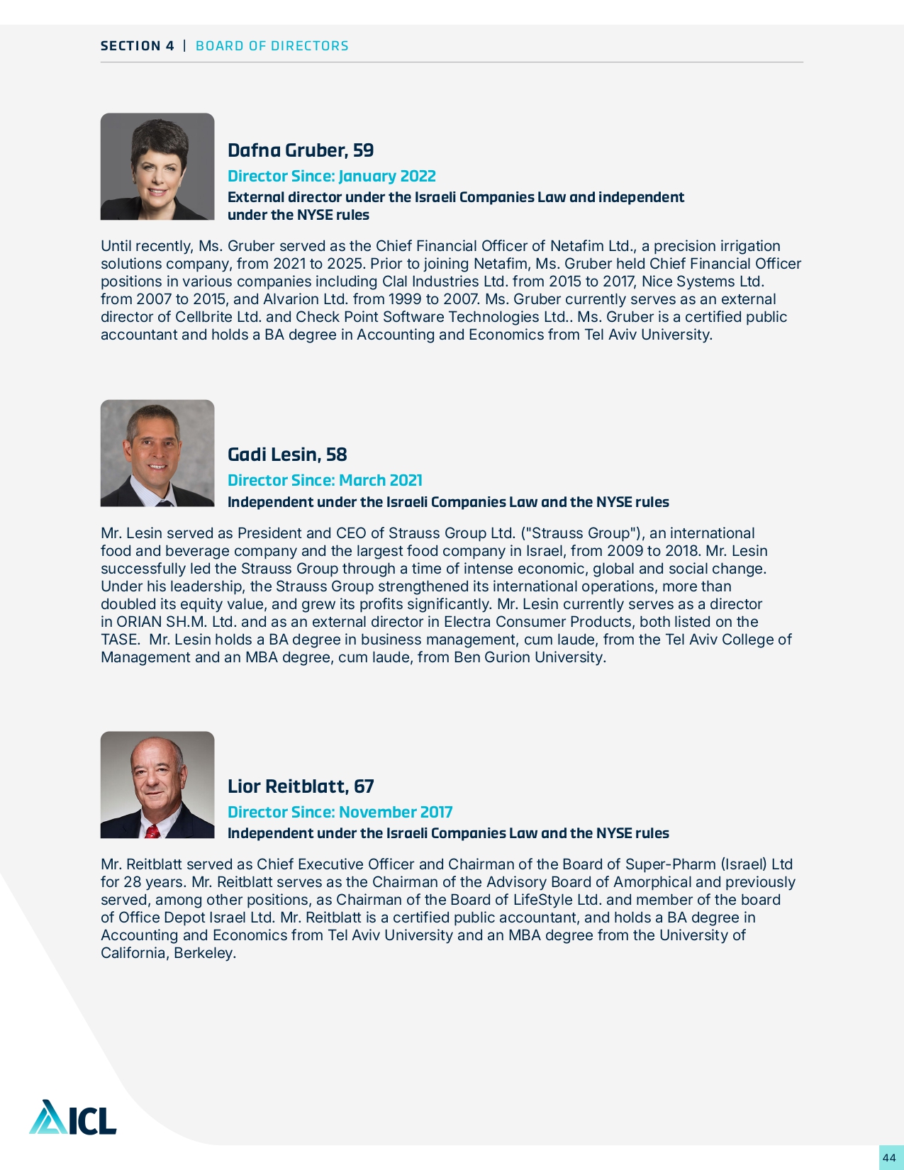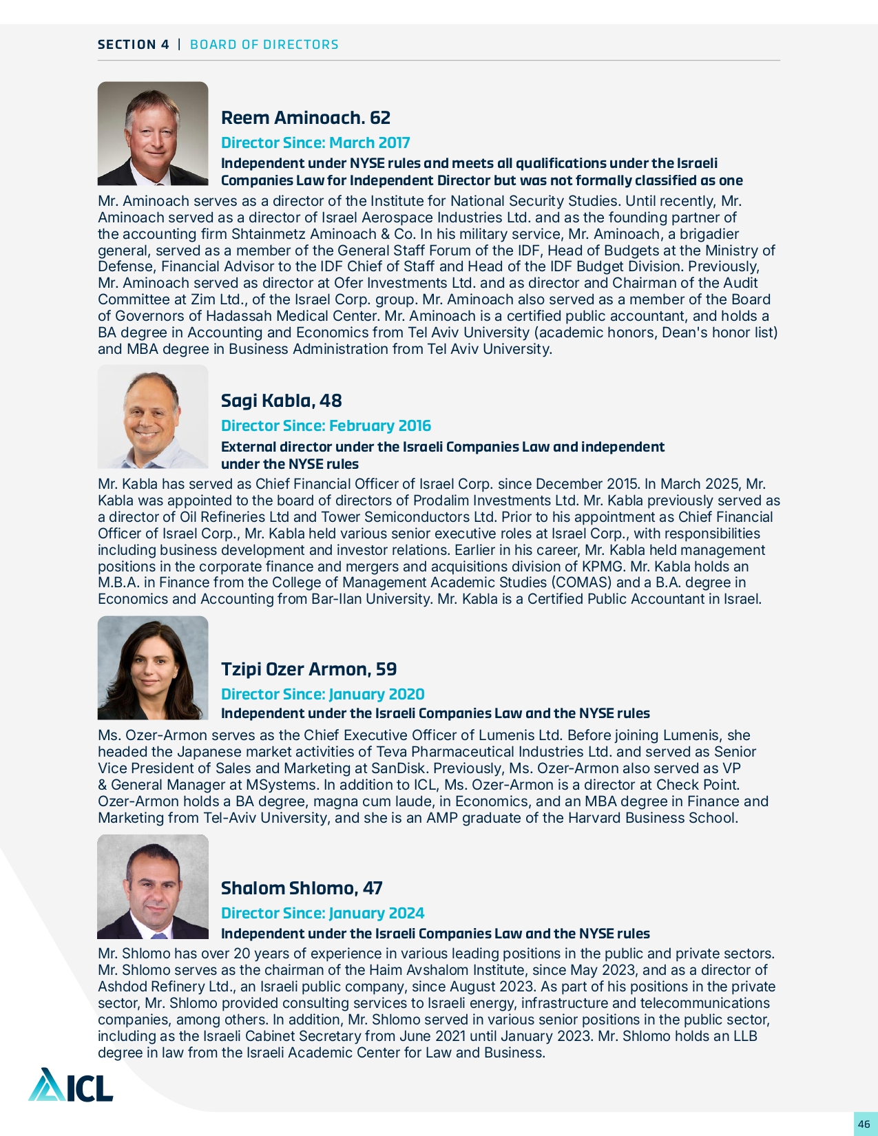 SE C TI O N 4 | B OA R D O F D I R E C T O R S Reem Aminoach。62董事自:2017年3月根据纽约证券交易所规则独立,符合以色列公司法规定的独立董事的所有资格,但未被正式归类为一名Aminoach先生担任国家安全研究所所长。直到最近,Aminoach先生还担任以色列航空航天工业有限公司的董事和会计公司Shtainmetz Aminoach & Co的创始合伙人。在服兵役期间,身为准将的Aminoach先生曾担任以色列国防军总参谋部论坛成员、国防部预算负责人、以色列国防军参谋长财务顾问和以色列国防军预算司负责人。此前,Aminoach先生曾担任Ofer Investments Ltd.的董事,以及以色列公司集团Zim Ltd.的董事和审计委员会主席。Aminoach先生还担任哈达萨医疗中心理事会成员。Aminoach先生是一名注册会计师,拥有特拉维夫大学会计和经济学学士学位(学术荣誉、院长荣誉名单)和特拉维夫大学工商管理MBA学位。Sagi Kabla,48岁董事自:2016年2月根据以色列公司法担任外部董事,根据纽约证券交易所规则担任独立董事Kabla先生自2015年12月起担任Israel Corp.的首席财务官。2025年3月,Kabla先生被任命为Prodalim Investments Ltd.的董事会成员。Kabla先生此前曾担任Oil Refineries Ltd和Tower Semiconductors Ltd.的董事。在被任命为Israel Corp.的首席财务官之前,Kabla先生曾在Israel Corp.担任多个高级管理职务,职责包括业务发展和投资者关系。在其职业生涯的早期,Kabla先生曾在毕马威的企业融资和并购部门担任管理职务。Kabla先生拥有管理学术研究学院(COMAS)的金融硕士学位和Bar-Ilan大学的经济和会计学士学位。Kabla先生是以色列的注册会计师。Tzipi Ozer Armon,59岁董事,自:2020年1月根据以色列公司法和纽约证券交易所规则独立,Ozer-Armon女士担任Lumenis Ltd.的首席执行官。在加入Lumenis之前,她领导梯瓦制药 Ltd.的日本市场活动,并在闪迪担任销售和营销高级副总裁。此前,Ozer-Armon女士还曾在MSystems担任副总裁兼总经理。除了ICL外,Ozer-Armon女士还是Check Point的董事。Ozer-Armon以优异成绩获得经济学学士学位,并获得特拉维夫大学金融和市场营销MBA学位,她是哈佛商学院的AMP毕业生。Shalom Shlomo,47岁董事,自:2024年1月根据以色列公司法和纽约证券交易所规则独立Shlomo先生在公共和私营部门的各种领导职位上拥有超过20年的经验。Shlomo先生自2023年5月起担任Haim Avshalom研究所主席,并自2023年8月起担任以色列上市公司Ashdod Refinery Ltd.的董事。作为在私营部门任职的一部分,什洛莫先生向以色列能源、基础设施和电信公司等提供咨询服务。此外,什洛莫先生还担任过公共部门的多个高级职位,包括从2021年6月至2023年1月担任以色列内阁秘书。Shlomo先生拥有以色列法律和商业学术中心的法学学士学位。46