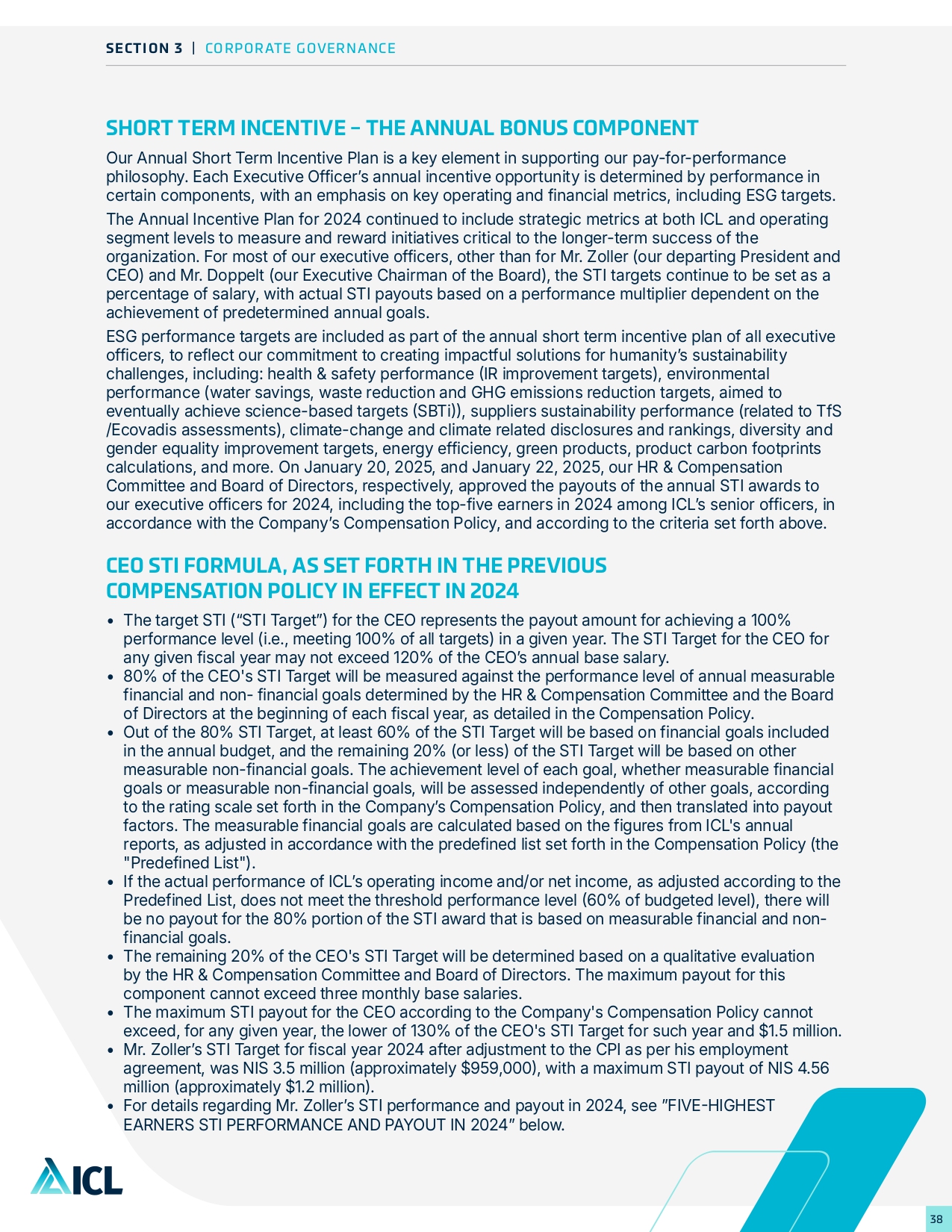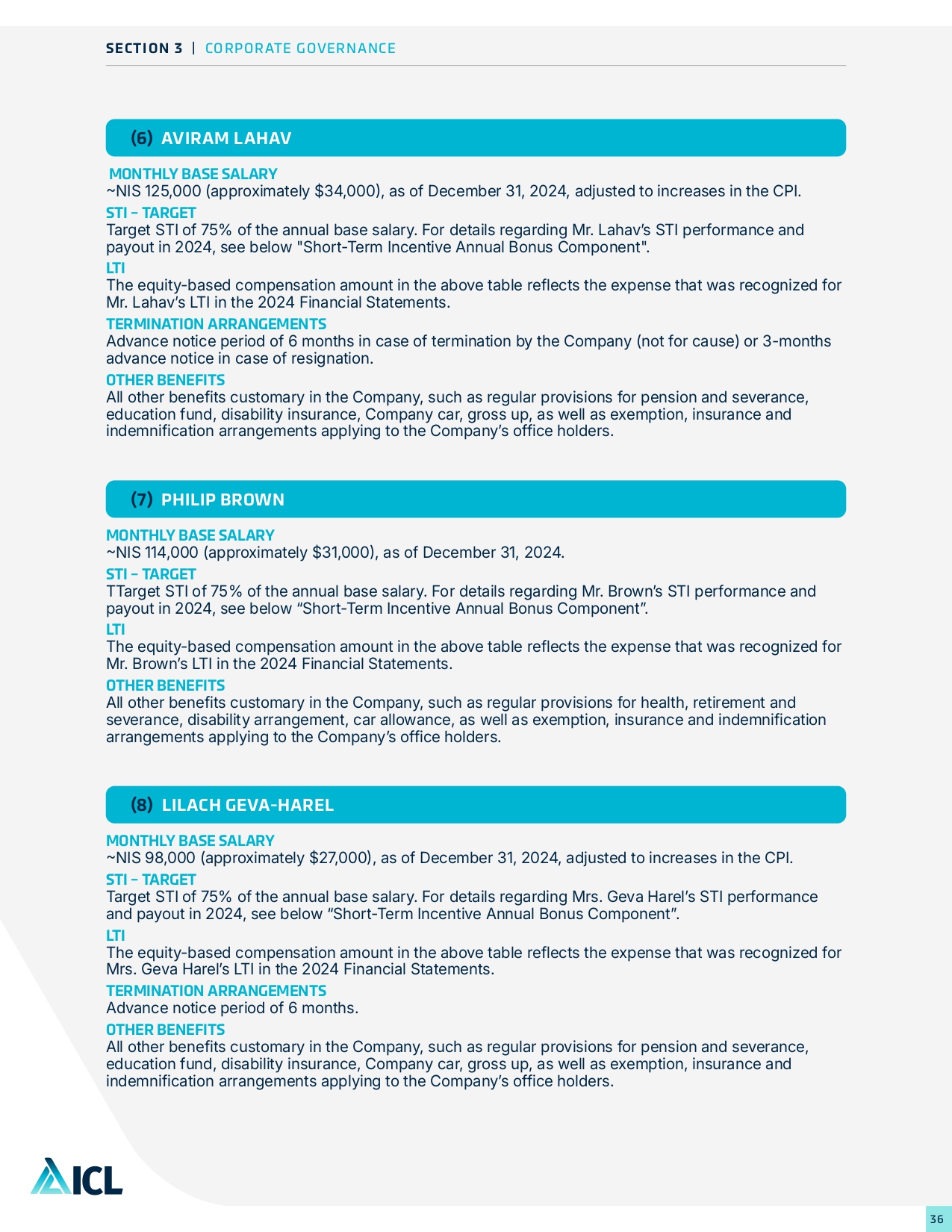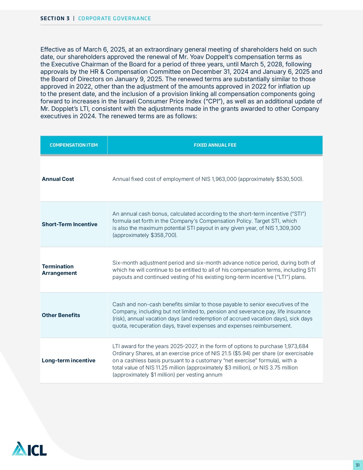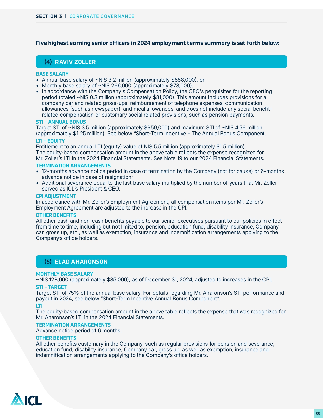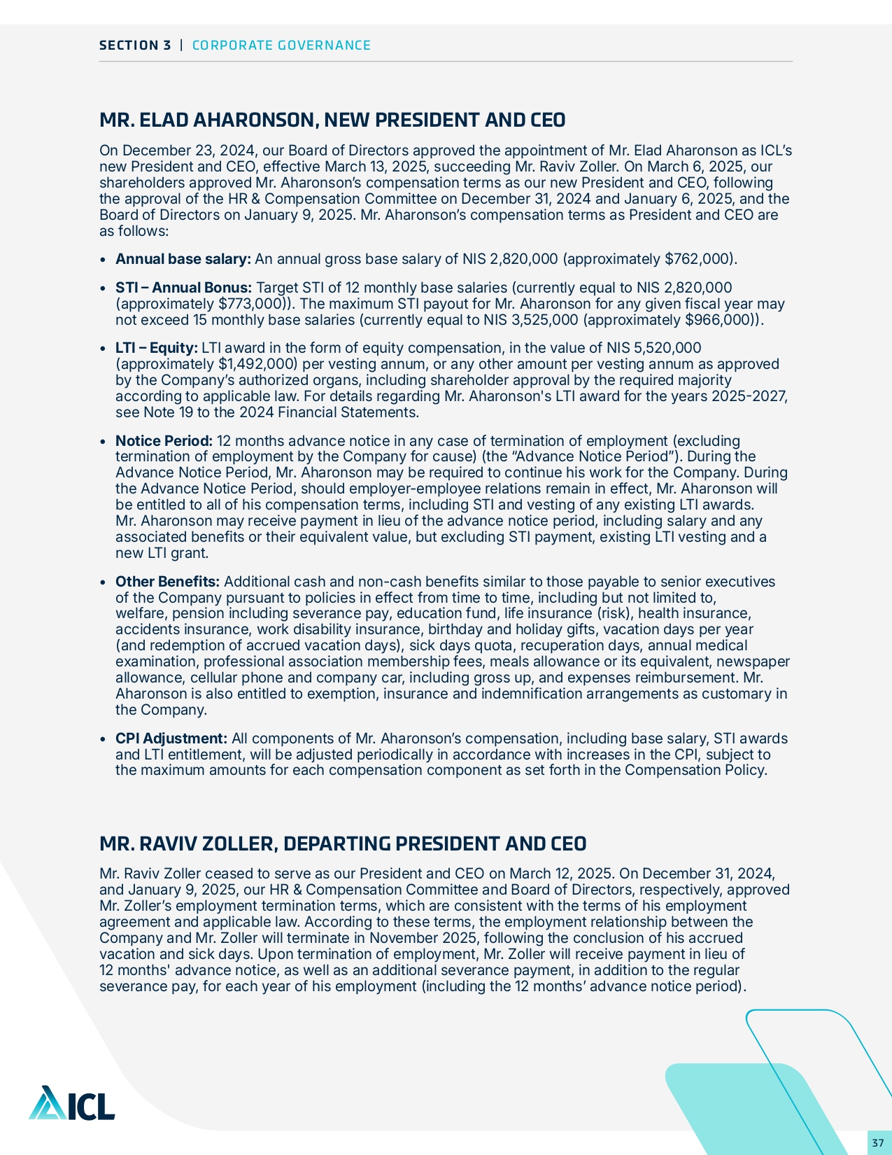 SE C TI O N3 | C O R P O R at E GOV E R N A N C E ELad Aharonson先生,新任总裁兼首席执行官2024年12月23日,我们的董事会批准任命Elad Aharonson先生为ICL的新任总裁兼首席执行官,自2025年3月13日起生效,接替Raviv Zoller先生。2025年3月6日,我们的股东批准了Aharonson先生作为我们新任总裁兼首席执行官的薪酬条款,此前人力资源与薪酬委员会于2024年12月31日和2025年1月6日批准了该条款,董事会于2025年1月9日批准了该条款。Aharonson先生作为总裁兼首席执行官的薪酬条款如下:•年度基薪:年度基薪毛额为2,820,000新谢克尔(约合762,000美元)。• STI –年度奖金:目标STI为12个月基薪(目前相当于2,820,000新谢克尔(约合773,000美元))。Aharonson先生在任何特定财政年度的最高STI支出不得超过15个月的基本工资(目前相当于3,525,000新谢克尔(约合966,000美元))。• LTI –股权:以股权补偿形式的LTI奖励,价值为每归属年度5,520,000新谢克尔(约合1,492,000美元),或公司授权机构批准的每归属年度的任何其他金额,包括根据适用法律获得必要多数股东批准。有关Aharonson先生2025-2027年LTI奖励的详细信息,见2024年财务报表附注19。•通知期限:在任何终止雇佣(不包括公司因故终止雇佣)的情况下提前12个月通知(“提前通知期限”)。在提前通知期间,Aharonson先生可能需要继续为公司工作。在预先通知期间,如果雇主-雇员关系仍然有效,Aharonson先生将有权获得其所有补偿条款,包括STI和任何现有LTI裁决的归属。Aharonson先生可能会收到代替提前通知期的付款,包括工资和任何相关福利或其等值,但不包括STI付款、现有LTI归属和新的LTI赠款。•其他福利:与根据不时生效的政策向公司高级管理人员支付的类似的额外现金和非现金福利,包括但不限于福利、养老金包括遣散费、教育金、人寿保险(风险)、健康保险、意外伤害保险、工作残疾保险、生日和节日礼物、每年的休假天数(以及赎回累积的休假天数)、病假额度、休养日、年度体检、专业协会会员费、膳食津贴或其等值、报纸津贴、手机和公司汽车,包括毛额上涨,以及费用报销。Aharonson先生还有权按照公司惯例获得豁免、保险和赔偿安排。• CPI调整:Aharonson先生薪酬的所有组成部分,包括基本工资、STI奖励和LTI权利,将根据CPI的涨幅定期调整,但以薪酬政策中规定的每个薪酬组成部分的最高金额为准。RAVIV Zoller先生,离任总裁兼首席执行官Raviv Zoller先生于2025年3月12日不再担任本公司总裁兼首席执行官。2024年12月31日和2025年1月9日,我们的人力资源与薪酬委员会和董事会分别批准了Zoller先生的终止雇佣条款,这些条款与其雇佣协议和适用法律的条款一致。根据这些条款,公司与Zoller先生之间的雇佣关系将于2025年11月在其累积假期和病假结束后终止。终止雇佣关系后,Zoller先生将收到代替提前12个月通知的付款,以及除常规遣散费外的额外遣散费,用于其雇佣的每一年(包括提前12个月的通知期)。37