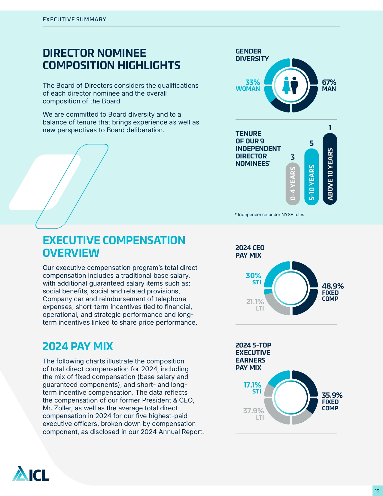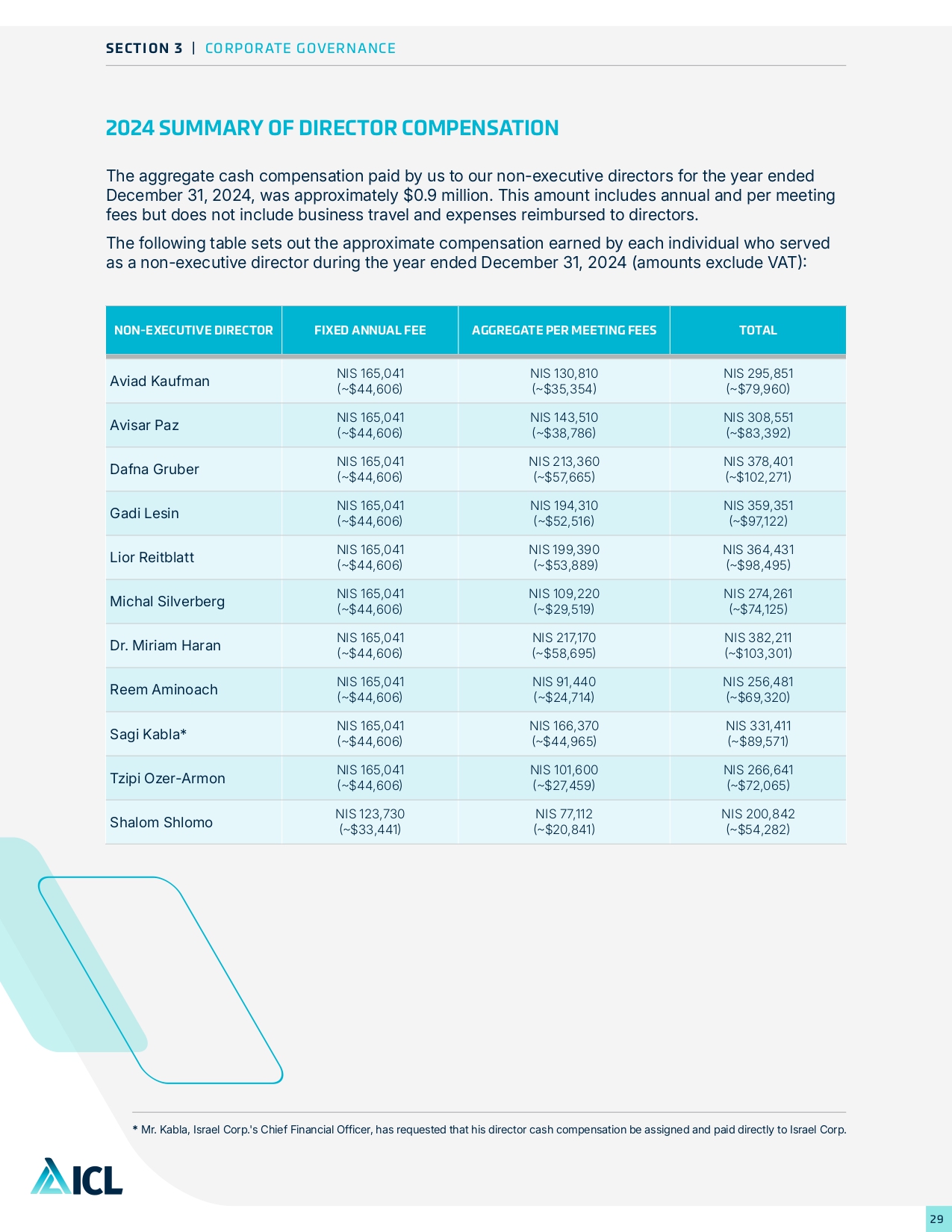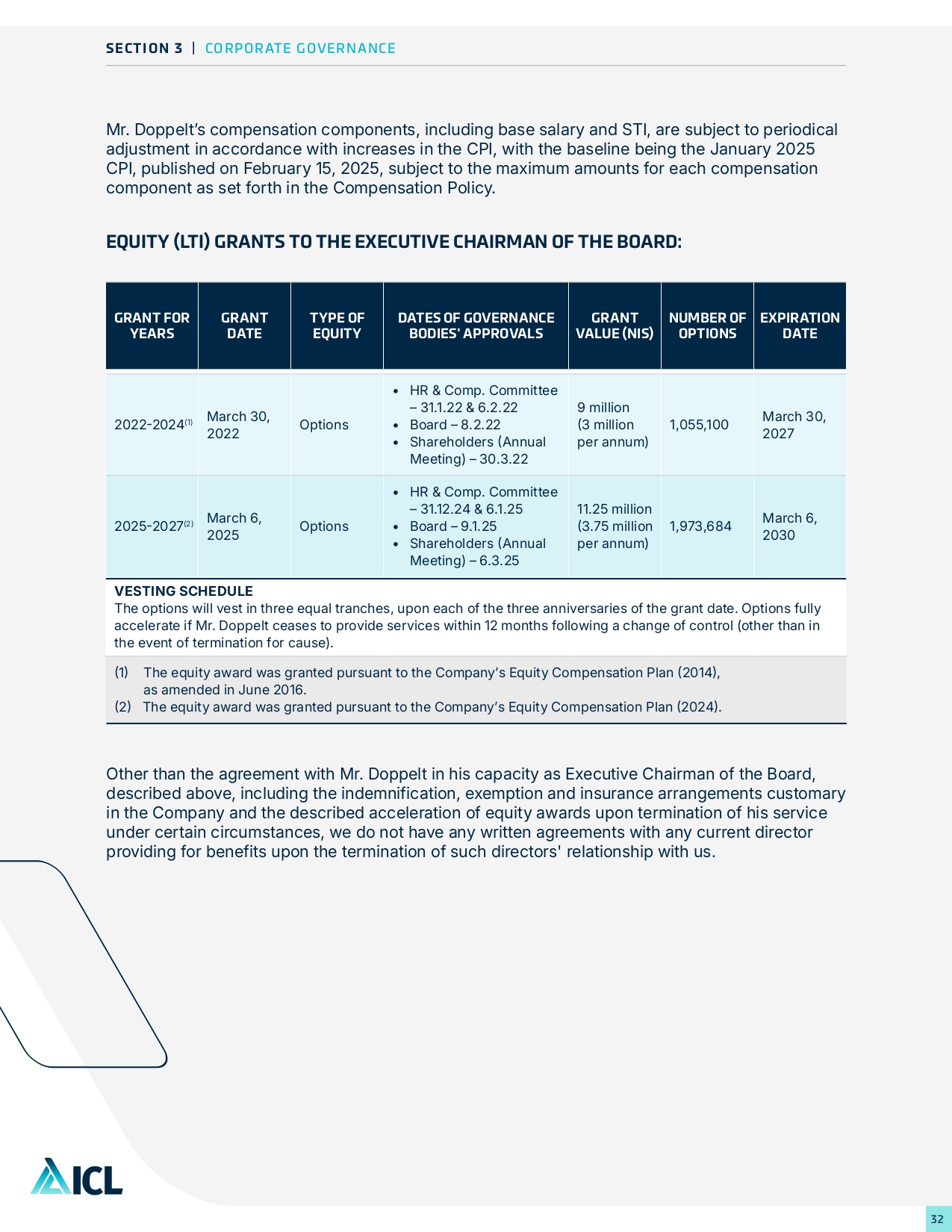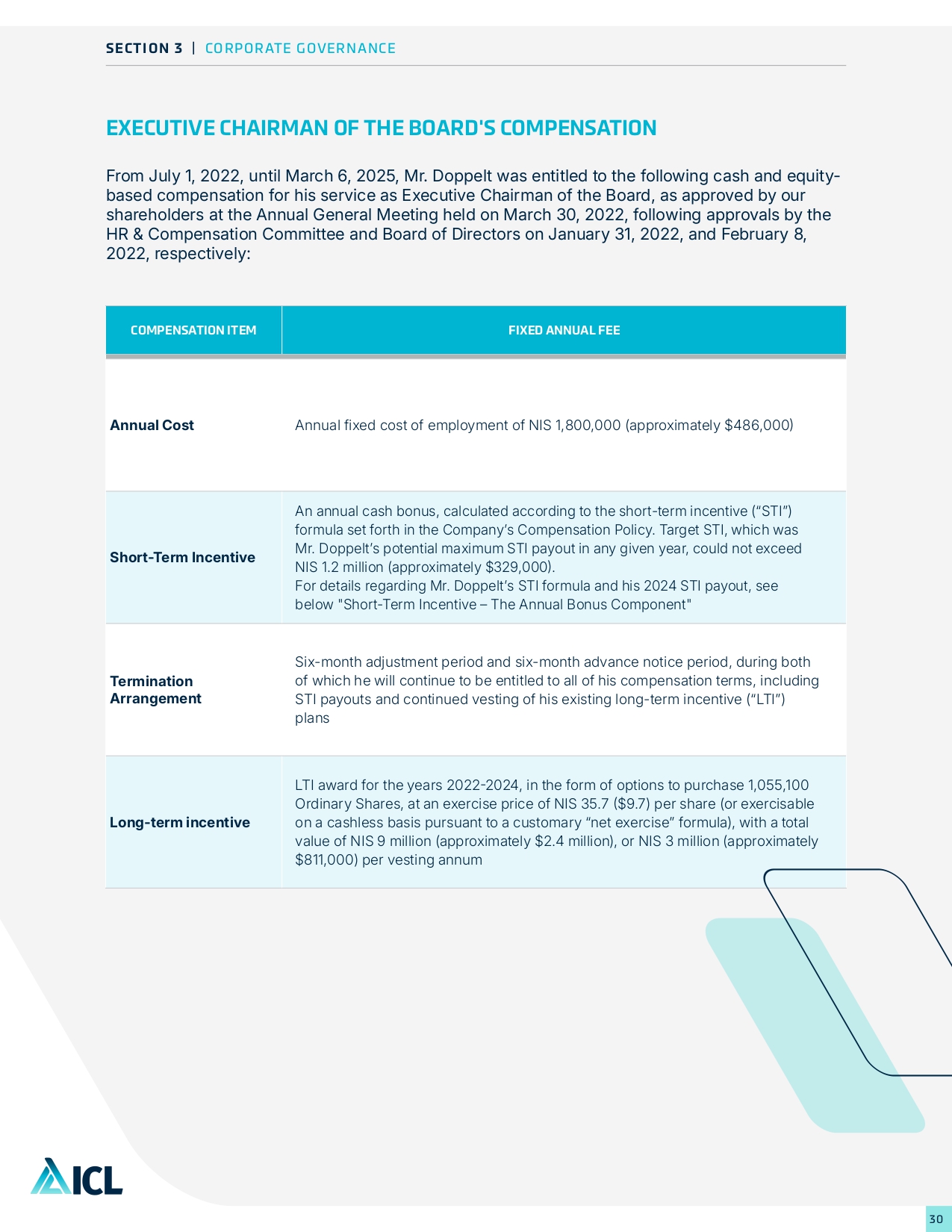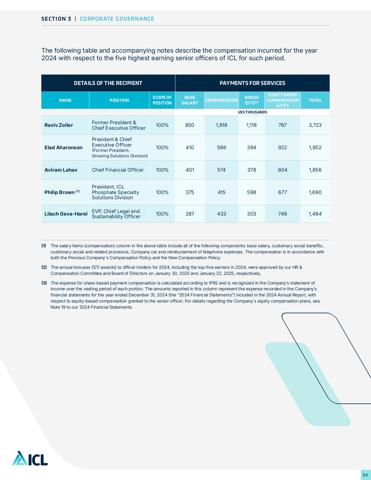 SE C TI O N3 | C O R P O R at E GOV E R N A N C E ELad Aharonson先生,新任总裁兼首席执行官2024年12月23日,我们的董事会批准任命Elad Aharonson先生为ICL的新任总裁兼首席执行官,自2025年3月13日起生效,接替Raviv Zoller先生。2025年3月6日,我们的股东批准了Aharonson先生作为我们新任总裁兼首席执行官的薪酬条款,此前人力资源与薪酬委员会于2024年12月31日和2025年1月6日批准了该条款,董事会于2025年1月9日批准了该条款。Aharonson先生作为总裁兼首席执行官的薪酬条款如下:•年度基薪:年度基薪毛额为2,820,000新谢克尔(约合762,000美元)。• STI –年度奖金:目标STI为12个月基薪(目前相当于2,820,000新谢克尔(约合773,000美元))。Aharonson先生在任何特定财政年度的最高STI支出不得超过15个月的基本工资(目前相当于3,525,000新谢克尔(约合966,000美元))。• LTI –股权:以股权补偿形式的LTI奖励,价值为每归属年度5,520,000新谢克尔(约合1,492,000美元),或公司授权机构批准的每归属年度的任何其他金额,包括根据适用法律获得必要多数股东批准。有关Aharonson先生2025-2027年LTI奖励的详细信息,见2024年财务报表附注19。•通知期限:在任何终止雇佣(不包括公司因故终止雇佣)的情况下提前12个月通知(“提前通知期限”)。在提前通知期间,Aharonson先生可能需要继续为公司工作。在预先通知期间,如果雇主-雇员关系仍然有效,Aharonson先生将有权获得其所有补偿条款,包括STI和任何现有LTI裁决的归属。Aharonson先生可能会收到代替提前通知期的付款,包括工资和任何相关福利或其等值,但不包括STI付款、现有LTI归属和新的LTI赠款。•其他福利:与根据不时生效的政策向公司高级管理人员支付的类似的额外现金和非现金福利,包括但不限于福利、养老金包括遣散费、教育金、人寿保险(风险)、健康保险、意外伤害保险、工作残疾保险、生日和节日礼物、每年的休假天数(以及赎回累积的休假天数)、病假额度、休养日、年度体检、专业协会会员费、膳食津贴或其等值、报纸津贴、手机和公司汽车,包括毛额上涨,以及费用报销。Aharonson先生还有权按照公司惯例获得豁免、保险和赔偿安排。• CPI调整:Aharonson先生薪酬的所有组成部分,包括基本工资、STI奖励和LTI权利,将根据CPI的涨幅定期调整,但以薪酬政策中规定的每个薪酬组成部分的最高金额为准。RAVIV Zoller先生,离任总裁兼首席执行官Raviv Zoller先生于2025年3月12日不再担任本公司总裁兼首席执行官。2024年12月31日和2025年1月9日,我们的人力资源与薪酬委员会和董事会分别批准了Zoller先生的终止雇佣条款,这些条款与其雇佣协议和适用法律的条款一致。根据这些条款,公司与Zoller先生之间的雇佣关系将于2025年11月在其累积假期和病假结束后终止。终止雇佣关系后,Zoller先生将收到代替提前12个月通知的付款,以及除常规遣散费外的额外遣散费,用于其雇佣的每一年(包括提前12个月的通知期)。37