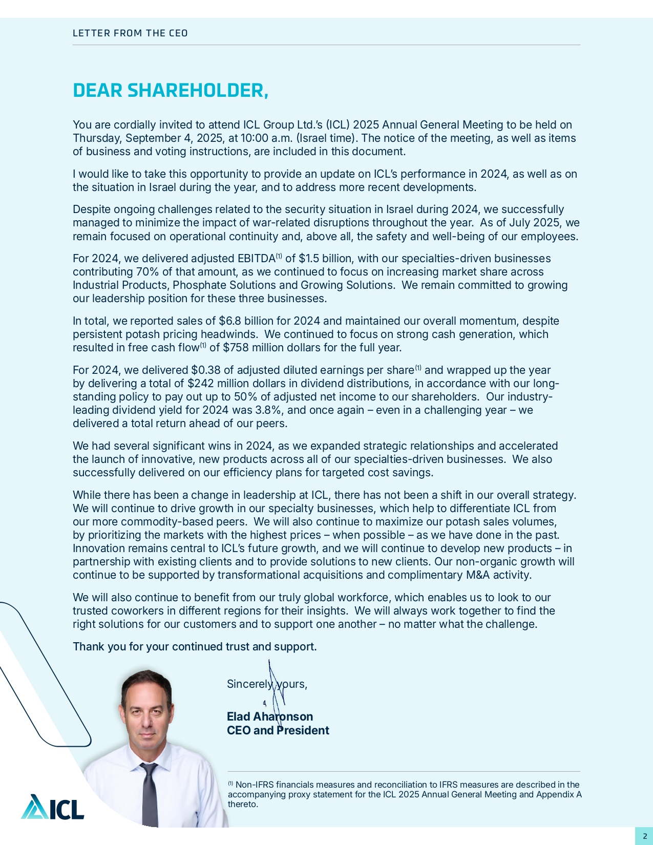 LETER F R O M T H E C E O尊敬的股东您好,敬请您参加将于2025年9月4日(星期四)上午10:00(以色列时间)举行的ICL Group集团股份有限公司(ICL)2025年度股东大会。会议通知,以及事务项目和投票指示,均包含在本文件中。借此机会,我想就ICL在2024年的表现以及这一年中的以色列局势提供最新信息,并谈谈最近的事态发展。尽管与2024年以色列安全局势相关的挑战持续存在,但我们成功地将全年与战争相关的中断的影响降至最低。截至2025年7月,我们仍然专注于运营连续性,尤其是员工的安全和福祉。对于2024年,我们实现了15亿美元的调整后EBITDA(1),我们的专业驱动业务贡献了该金额的70%,因为我们继续专注于增加工业产品、磷酸盐解决方案和增长解决方案的市场份额。我们将继续致力于提高我们在这三项业务中的领导地位。总的来说,我们报告的2024年销售额为68亿美元,并保持了我们的整体势头,尽管钾肥定价逆风持续存在。我们继续关注强劲的现金生成,这导致全年自由现金流(1)为7.58亿美元。对于2024年,我们交付了0.38美元的调整后稀释后每股收益(1),并根据我们向股东支付高达50%的调整后净收入的长期政策,通过交付总计2.42亿美元的股息分配结束了这一年。我们2024年的股息收益率达到行业领先水平,为3.8%,我们再次——即使在充满挑战的一年——实现了领先于同行的总回报率。我们在2024年取得了几项重大胜利,因为我们扩大了战略关系,并加速在我们所有专业驱动的业务中推出创新的新产品。我们还成功地实现了我们的效率计划,以实现有针对性的成本节约。虽然ICL的领导层发生了变化,但我们的整体战略并没有发生转变。我们将继续推动特种业务的增长,这有助于将ICL与更多以商品为基础的同行区分开来。我们还将继续最大限度地提高我们的钾肥销量,通过优先考虑价格最高的市场——如果可能的话——就像我们过去所做的那样。创新仍然是ICL未来增长的核心,我们将继续开发新产品——与现有客户合作,并为新客户提供解决方案。我们的非有机增长将继续得到转型收购和互补并购活动的支持。我们还将继续受益于我们真正全球化的员工队伍,这使我们能够向不同地区值得信赖的同事寻求他们的见解。我们将始终共同努力,为我们的客户找到正确的解决方案,并相互支持——无论面临何种挑战。感谢您一直以来的信任与支持。真诚的您,Elad Aharonson首席执行官兼总裁非国际财务报告准则财务措施以及与国际财务报告准则措施的对账在随附的ICL 2025年度股东大会代理声明及其附录A中进行了描述。(1) 2