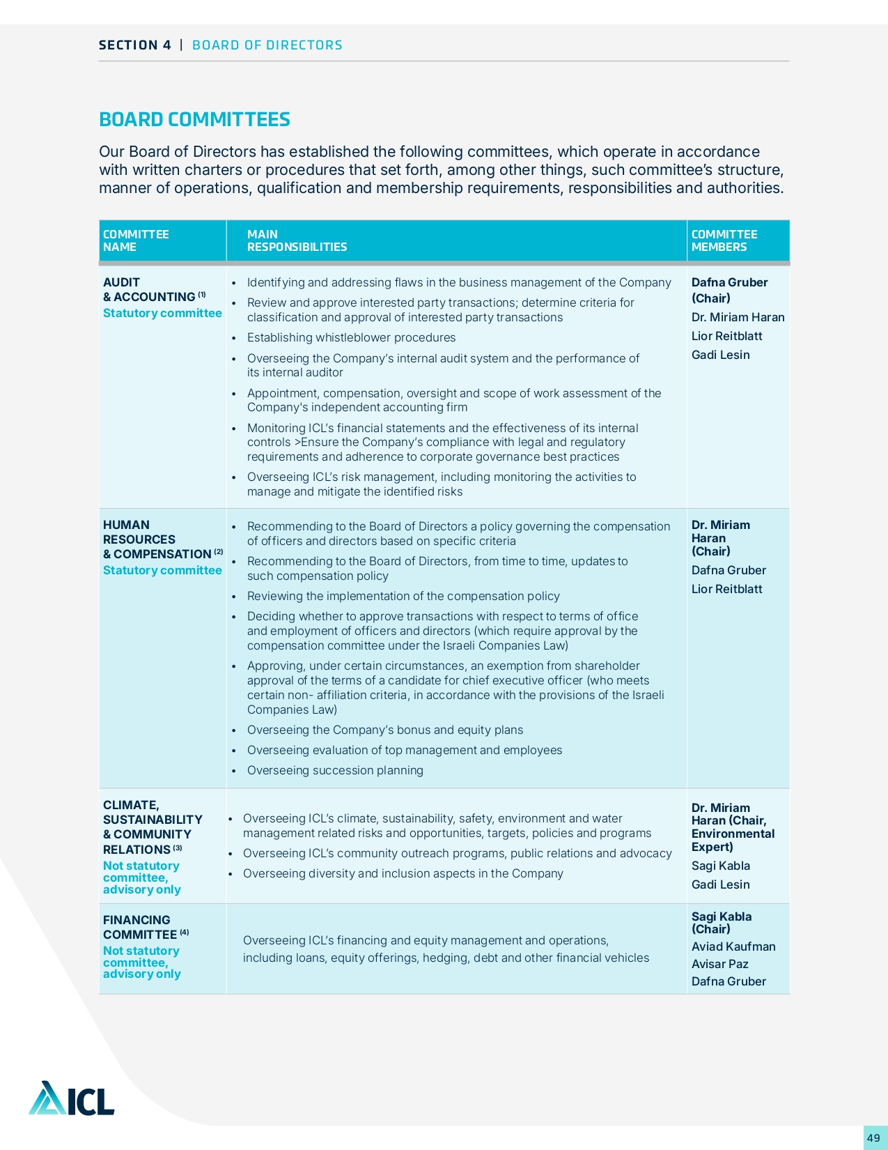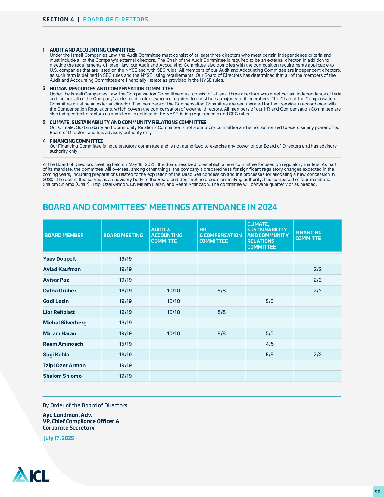 SE C TI O N 4 | B OA R D O F D I R E C T O R S 1审计和会计委员会根据以色列公司法,审计委员会必须由至少三名符合某些独立性标准的董事组成,并且必须包括公司的所有外部董事。审计委员会主席须为外部董事。除了满足以色列法律的要求外,我们的审计和会计委员会还遵守适用于在纽交所上市的美国公司的组成要求和SEC规则。我们的审计和会计委员会的所有成员都是独立董事,因为SEC规则和纽交所上市要求中定义了这个术语。我们的董事会已确定,审计和会计委员会的所有成员都具备纽约证券交易所规则规定的金融知识。2人力资源和薪酬委员会根据以色列公司法,薪酬委员会必须由至少三名符合某些独立性标准的董事组成,并包括公司所有外部董事,这些董事必须构成其成员的大多数。薪酬委员会主席必须由外部董事担任。薪酬委员会成员的服务报酬按照《薪酬条例》,该条例管辖外部董事的薪酬。我们的人力资源和薪酬委员会的所有成员也都是独立董事,因为这个词在纽交所上市要求和SEC规则中有定义。3气候、可持续性和社区关系委员会我们的气候、可持续性和社区关系委员会不是法定委员会,无权行使我们董事会的任何权力,仅具有咨询权力。4融资委员会我们的融资委员会不是法定委员会,无权行使我们董事会的任何权力,仅具有咨询权力。在2025年5月18日召开的董事会会议上,董事会决议成立一个新的委员会,专注于监管事项。作为其任务的一部分,该委员会除其他外,将监督该公司对预计在未来几年发生的重大监管变化的准备情况,包括与死海特许权到期相关的准备工作以及在2030年分配新特许权的过程。该委员会是董事会的咨询机构,不拥有决策权。该委员会由四名成员组成:Shalom Shlomo(主席)、Tzipi Ozer-Armon、Miriam Haran博士和Reem Aminoach。该委员会将每季度或根据需要召开一次会议。董事会和委员会2024年会议的出席情况董事会成员董事会会议审计和会计委员会人力资源和薪酬委员会气候、可持续性和社区关系委员会融资委员会Yoav Doppelt 19/19丨阿维亚德·考夫曼Aviad Kaufman 19/192/2 Avisar Paz 19/192/2 Dafna Gruber 18/1910/10 Gadi Lesin 19/1910/10 Lior Reitblatt 19/1910/1082025 50