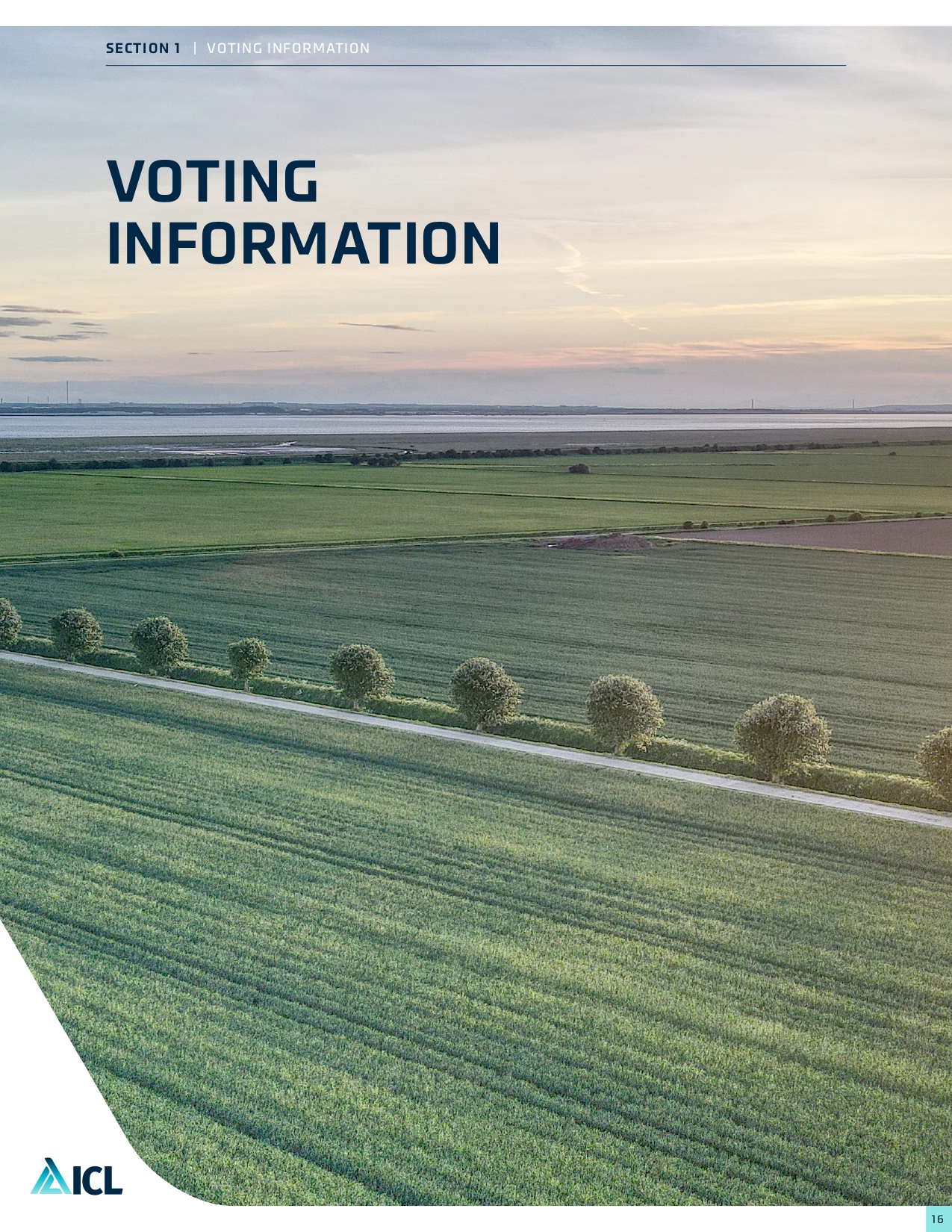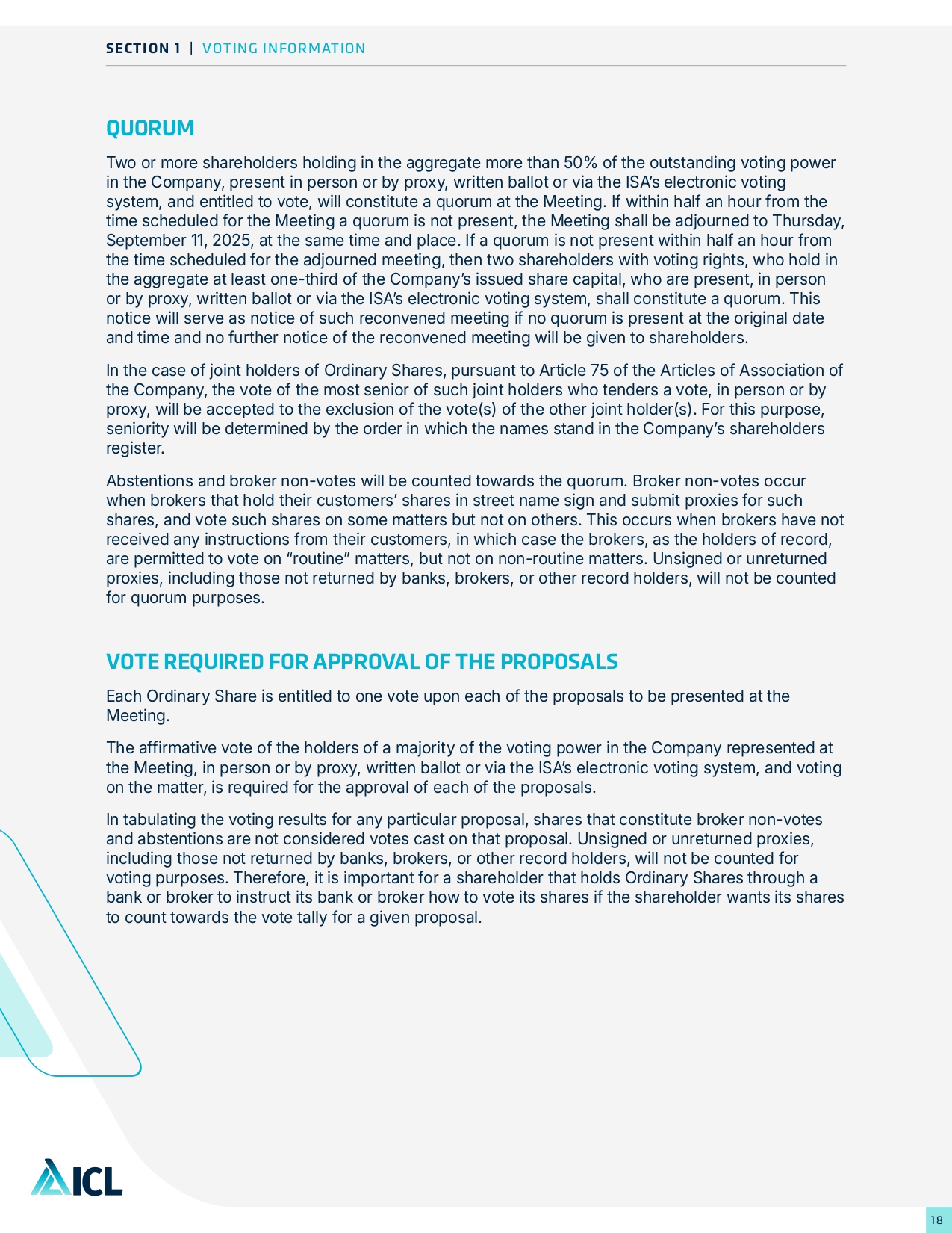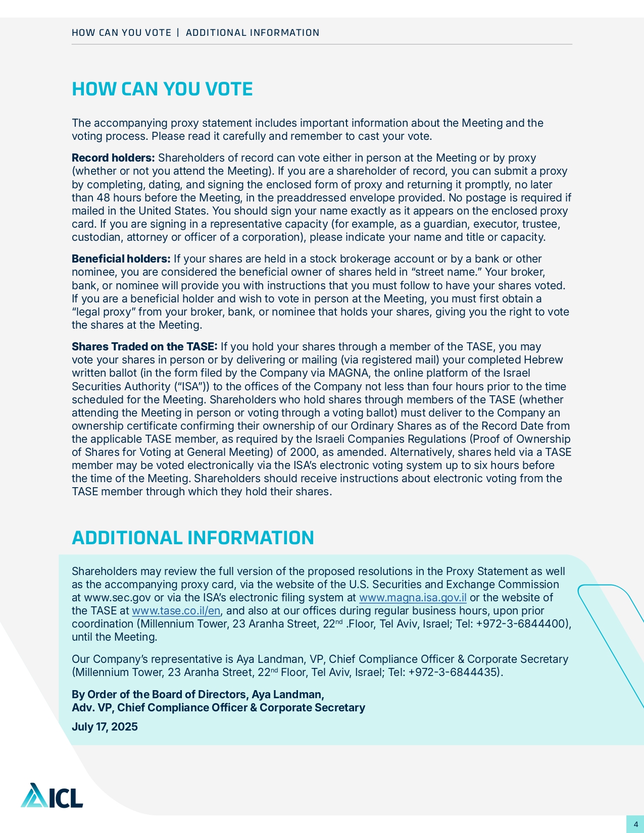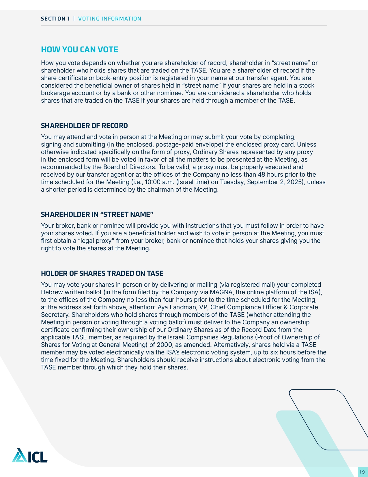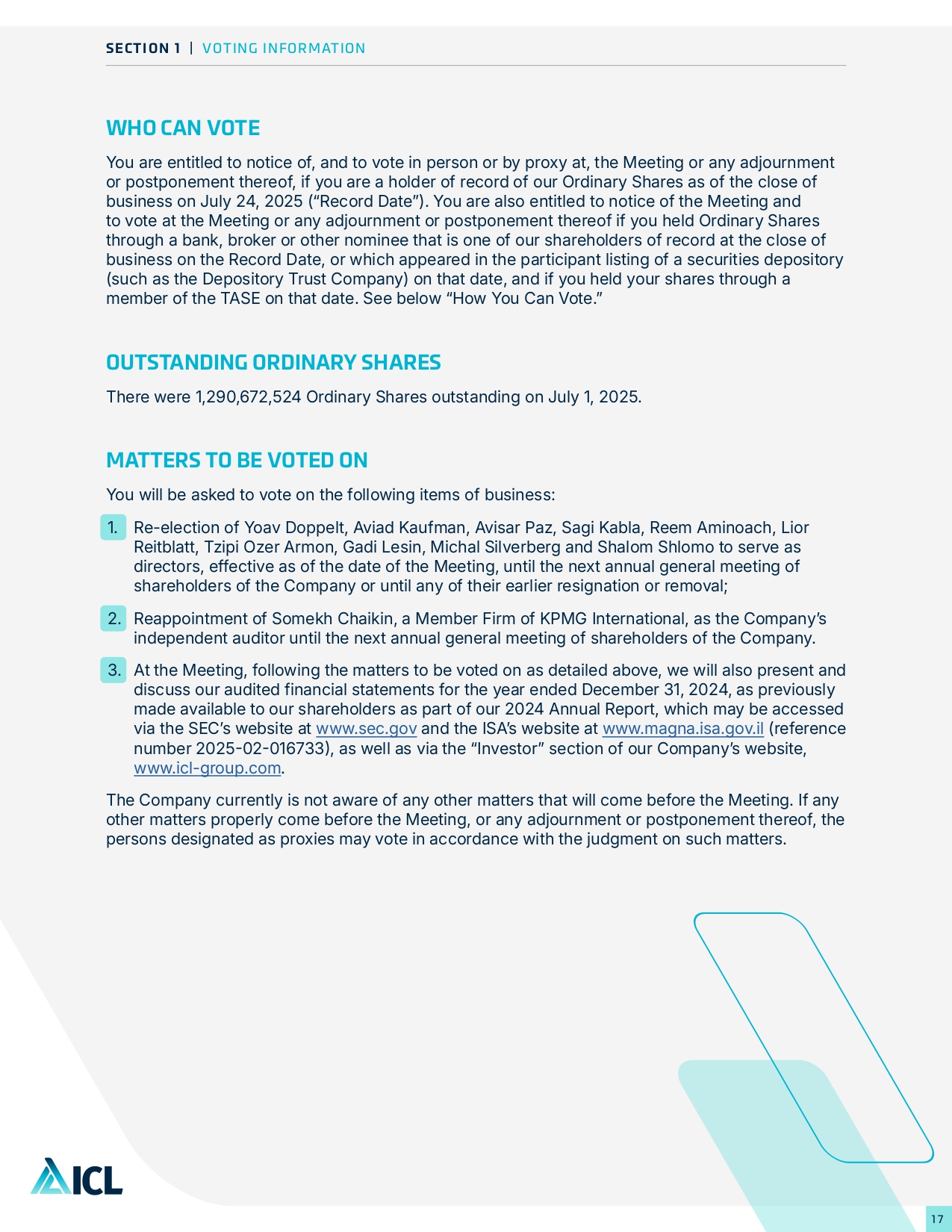 SE C TI O N1 | VO T I N G I N F O R M ATI O N谁可以投票如果您是截至2025年7月24日(“记录日期”)营业时间结束时我们普通股的记录持有人,您有权收到会议通知,并有权亲自或通过代理人在会议或会议的任何休会或延期上投票。如果您通过在记录日期营业结束时是我们的记录股东之一的银行、经纪人或其他代名人持有普通股,或在该日期出现在证券存管机构(例如存管信托公司)的参与者列表中,并且如果您在该日期通过TASE成员持有您的股票,您也有权获得会议通知并在会议或任何休会或延期会议上投票。见下文“你如何投票。”流通在外的普通股于2025年7月1日有1,290,672,524股流通在外的普通股。待表决事项请你就下列事项进行表决:1。重新选举Yoav Doppelt、Aviad Kaufman、Avisar Paz、Sagi Kabla、TERM3、Reem Aminoach、Lior Reitblatt、TERM5、Tzipi Ozer Armon、Gadi Lesin、Michal Silverberg和Shalom Shlomo担任董事,自会议召开之日起生效,直至公司下届年度股东大会或直至其任何较早辞职或免职;2。续聘毕马威国际的成员事务所Somekh Chaikin为公司独立核数师,任期至公司下届股东周年大会止。3.在会议上,继上文详述的待表决事项之后,我们还将提出并讨论我们截至2024年12月31日止年度的经审计财务报表,这些报表以前作为我们2024年年度报告的一部分提供给我们的股东,可通过SEC网站www.sec.gov和ISA网站www.magna.isa.gov.il(参考编号2025-02-016733)以及通过我们公司网站www.icl-group.com的“投资者”部分进行访问。本公司目前并不知悉将于会议前提出的任何其他事项。如有任何其他事项适当地提交会议,或任何延期或延期,指定为代理人的人可根据对该等事项的判决进行表决。17