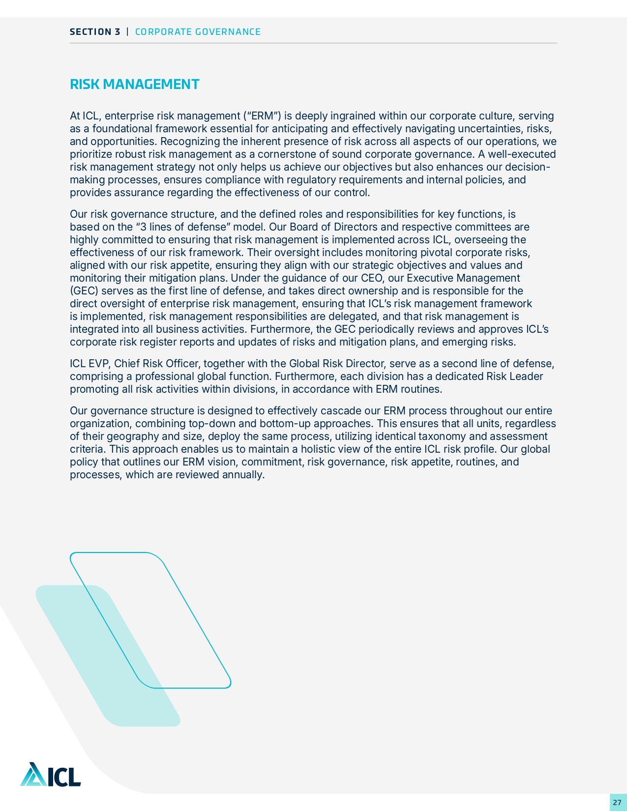 SE C TI O N3 | C O R P O R at E GOV E R N A N C E Risk Management at ICL,企业风险管理(“ERM”)在我们的企业文化中根深蒂固,是预测和有效驾驭不确定性、风险和机遇所必不可少的基础框架。认识到在我们运营的各个方面都存在固有的风险,我们优先考虑稳健的风险管理,将其作为健全公司治理的基石。执行良好的风险管理策略不仅有助于我们实现目标,还能增强我们的决策流程,确保遵守监管要求和内部政策,并为我们的控制有效性提供保证。我们的风险治理结构,以及定义的关键职能的角色和职责,都是基于“3道防线”模式。我们的董事会和各自的委员会高度致力于确保在整个ICL实施风险管理,并监督我们风险框架的有效性。他们的监督包括监测关键的企业风险,与我们的风险偏好保持一致,确保它们与我们的战略目标和价值观保持一致,并监测其缓解计划。在我们CEO的指导下,我们的执行管理层(GEC)作为第一道防线,直接拥有所有权并负责对企业风险管理的直接监督,确保了ICL的风险管理框架得到实施,风险管理职责得到下放,风险管理融入所有业务活动。此外,GEC定期审查和批准ICL的企业风险登记册报告以及风险和缓解计划的更新,以及新出现的风险。ICL执行副总裁、首席风险官与全球风险总监一起作为第二道防线,由专业的全球职能构成。并且,每个事业部都有专门的风险负责人,按照ERM套路,推动事业部内的所有风险活动。我们的治理结构旨在将我们的ERM流程有效地级联到整个组织中,结合自上而下和自下而上的方法。这确保了所有单位,无论其地理位置和大小,都采用相同的分类学和评估标准,部署相同的过程。这种方法使我们能够对整个ICL风险状况保持一个整体的看法。我们的全球政策概述了我们的ERM愿景、承诺、风险治理、风险偏好、常规和流程,这些政策每年都会进行审查。27