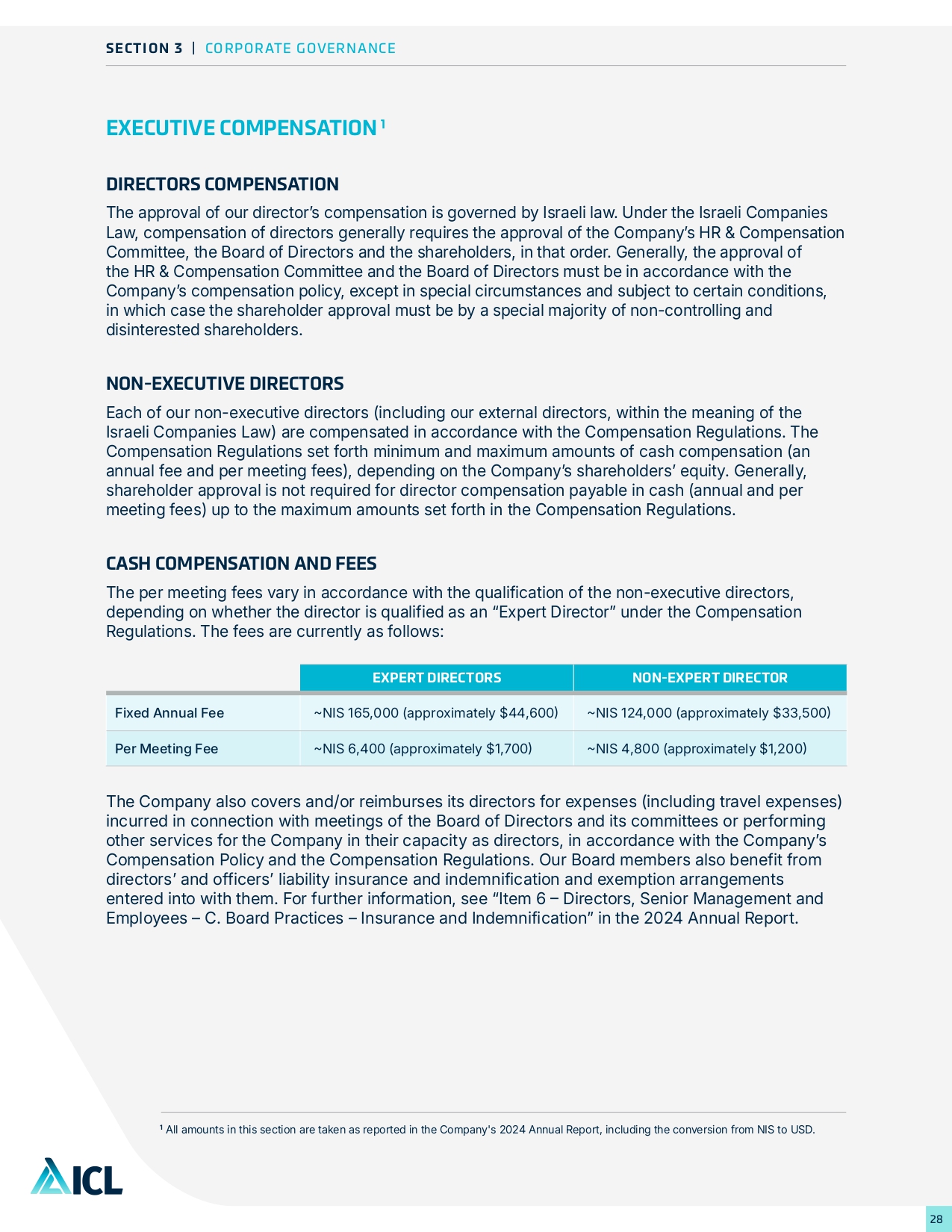 SE C TI O N 3 | C O R P O R at E GOV E R N A N C E行政补偿1董事补偿我们的董事补偿的批准受以色列法律管辖。根据以色列公司法,董事的薪酬一般需要公司人力资源与薪酬委员会、董事会和股东的批准,按此顺序。通常,人力资源与薪酬委员会和董事会的批准必须符合公司的薪酬政策,但特殊情况和特定条件除外,在这种情况下,股东批准必须由非控股和无利害关系的特别多数股东批准。非执行董事我们的每一位非执行董事(包括我们的外部董事,在以色列公司法的含义内)根据《补偿条例》获得补偿。补偿条例规定了现金补偿的最低和最高金额(年费和每次会议费用),具体取决于公司股东权益。一般来说,以现金支付的董事薪酬(年度和每次会议费用)不需要股东批准,最高可达《薪酬条例》规定的最高金额。现金补偿和费用每次会议费用根据非执行董事的资格而有所不同,取决于该董事是否符合《薪酬条例》规定的“专家董事”资格。费用目前如下:专家董事非专家董事固定年费~165000新谢克尔(约合44600美元)~124000新谢克尔(约合33500美元)每次会议费用~6400新谢克尔(约合1700美元)~4800新谢克尔(约合1200美元)公司还根据公司的薪酬政策和薪酬条例,支付和/或补偿其董事因董事会及其委员会的会议或以董事身份为公司提供其他服务而产生的费用(包括差旅费)。我们的董事会成员还受益于与他们订立的董事和高级职员责任保险以及赔偿和豁免安排。如需更多信息,请参阅2024年年度报告中的“项目6 –董事、高级管理人员和员工– C.董事会惯例–保险和赔偿”。1本节中的所有金额均按公司2024年年度报告中的报告计算,包括从NIS转换为美元。28