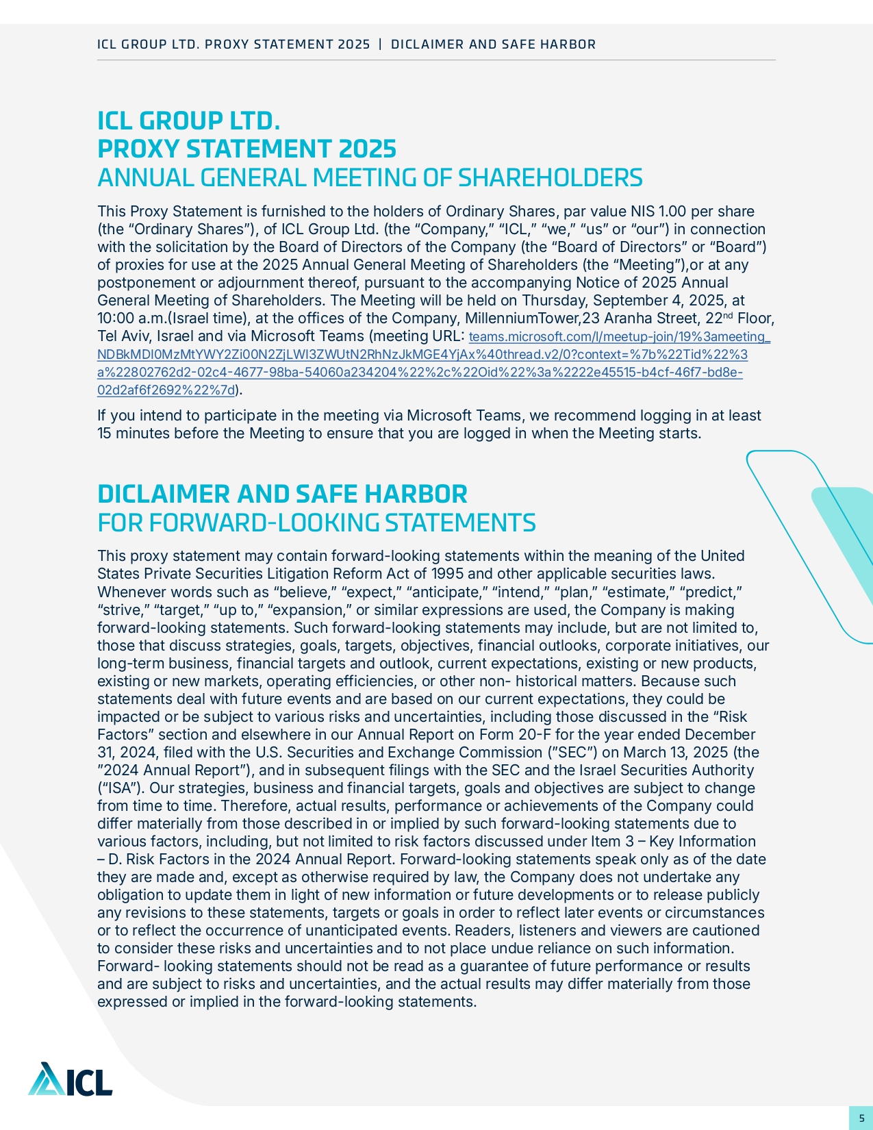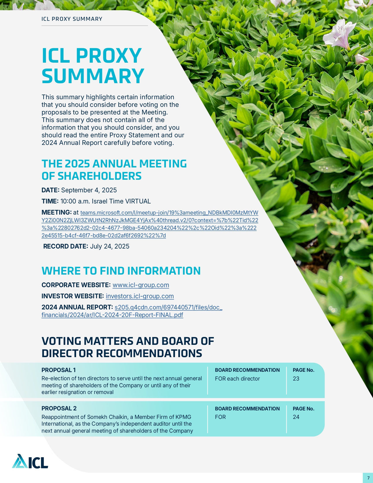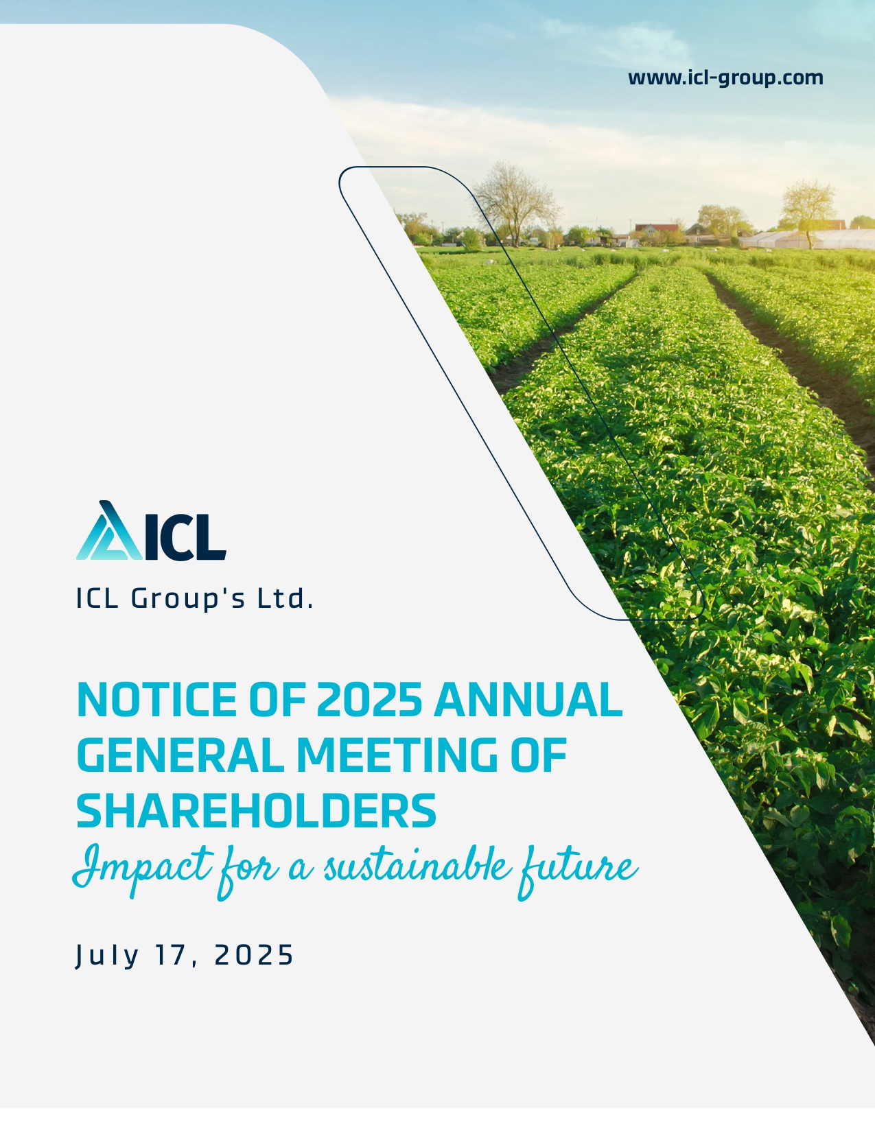 IC L G R O U P LT D. P R OXY S TATE M E N T 2025 | DI CL A I M E R A N D SA FE H A RBOR ICL集团有限公司。代理声明2025年度股东大会本代理声明乃根据随附的2025年年度股东大会通知向ICL Group有限公司(“公司”、“ICL”、“我们”、“我们”或“我们的”)的普通股(每股面值1.00新谢克尔)(“普通股”)持有人提供,涉及公司董事会(“董事会”或“董事会”)征集代理人以供2025年年度股东大会(“会议”)使用,或在其任何延期或休会时使用。会议将于2025年9月4日(星期四)上午10:00(以色列时间)在以色列特拉维夫Aranha街23号22楼MillenniumTower公司办公室并通过Microsoft Teams(会议网址:teams.microsoft.com/l/meetup-join/19% 3ameeting _ NDBKMDI0MzMTYWY2Zi00N2ZJLWI3ZWUTN2RhNzJKMGE4YJAx % 40thread.v2/0?context =% 7b % 22Tid % 22% 3 a % 22802762d2-02c4-4677-98ba-54060a234204 % 22% 2c % 22Oid % 22% 3a % 2222e45515-b4c4c4c4c4c如果您打算通过Microsoft Teams参加会议,我们建议您至少在会议开始前15分钟登录,以确保您在会议开始时登录。前瞻性陈述的DICLAIMER和SAFE HARBOR本代理陈述可能包含1995年美国私人证券诉讼改革法案和其他适用证券法含义内的前瞻性陈述。每当使用“相信”、“预期”、“预期”、“打算”、“计划”、“估计”、“预测”、“努力”、“目标”、“向上”、“扩张”等词语或类似表述时,公司都在做出前瞻性陈述。此类前瞻性陈述可能包括但不限于讨论战略、目标、目标、目标、财务前景、公司举措、我们的长期业务、财务目标和前景、当前预期、现有或新产品、现有或新市场、运营效率或其他非历史事项的陈述。由于此类声明涉及未来事件并基于我们当前的预期,它们可能会受到影响或受到各种风险和不确定性的影响,包括我们于2025年3月13日向美国证券交易委员会(“SEC”)提交的截至2024年12月31日止年度的20-F表格年度报告(“2024年年度报告”)以及随后向SEC和以色列证券管理局(“ISA”)提交的文件中“风险因素”部分和其他部分中讨论的风险和不确定性。我们的策略、业务及财务目标、目标及目标会不时更改。因此,由于各种因素,包括但不限于2024年年度报告中项目3 –关键信息– D.风险因素下讨论的风险因素,公司的实际结果、业绩或成就可能与此类前瞻性陈述中描述或暗示的存在重大差异。前瞻性陈述仅在作出之日起生效,除法律另有规定外,公司不承担任何义务根据新信息或未来发展更新这些陈述或公开发布对这些陈述、目标或目标的任何修订,以反映以后的事件或情况或反映意外事件的发生。请读者、听众和观众注意考虑这些风险和不确定性,不要过分依赖这些信息。前瞻性陈述不应被理解为对未来业绩或结果的保证,并受到风险和不确定性的影响,实际结果可能与前瞻性陈述中明示或暗示的结果存在重大差异。5