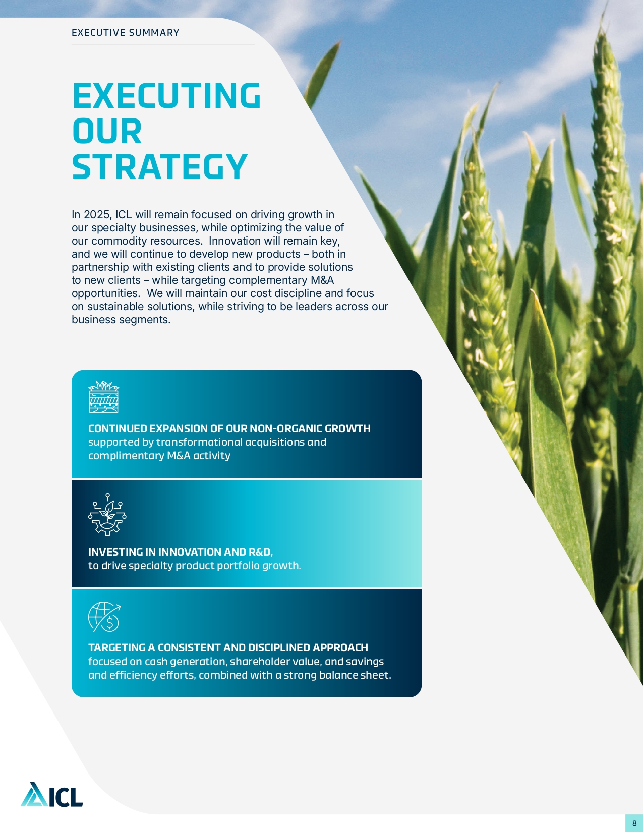 EX EC U T IVERY执行我们2025年的战略,ICL将继续专注于推动我们专业业务的增长,同时优化我们的商品资源的价值。创新仍将是关键,我们将继续开发新产品——既与现有客户合作,也为新客户提供解决方案——同时瞄准互补的并购机会。我们将保持我们的成本纪律并专注于可持续的解决方案,同时努力成为我们业务部门的领导者。继续扩大我们的非有机增长,由转型收购和投资于创新和研发的互补并购活动支持,以推动特殊产品组合增长。以一致和有纪律的方法为目标,重点关注现金产生、股东价值、储蓄和效率努力,并结合强大的资产负债表。8