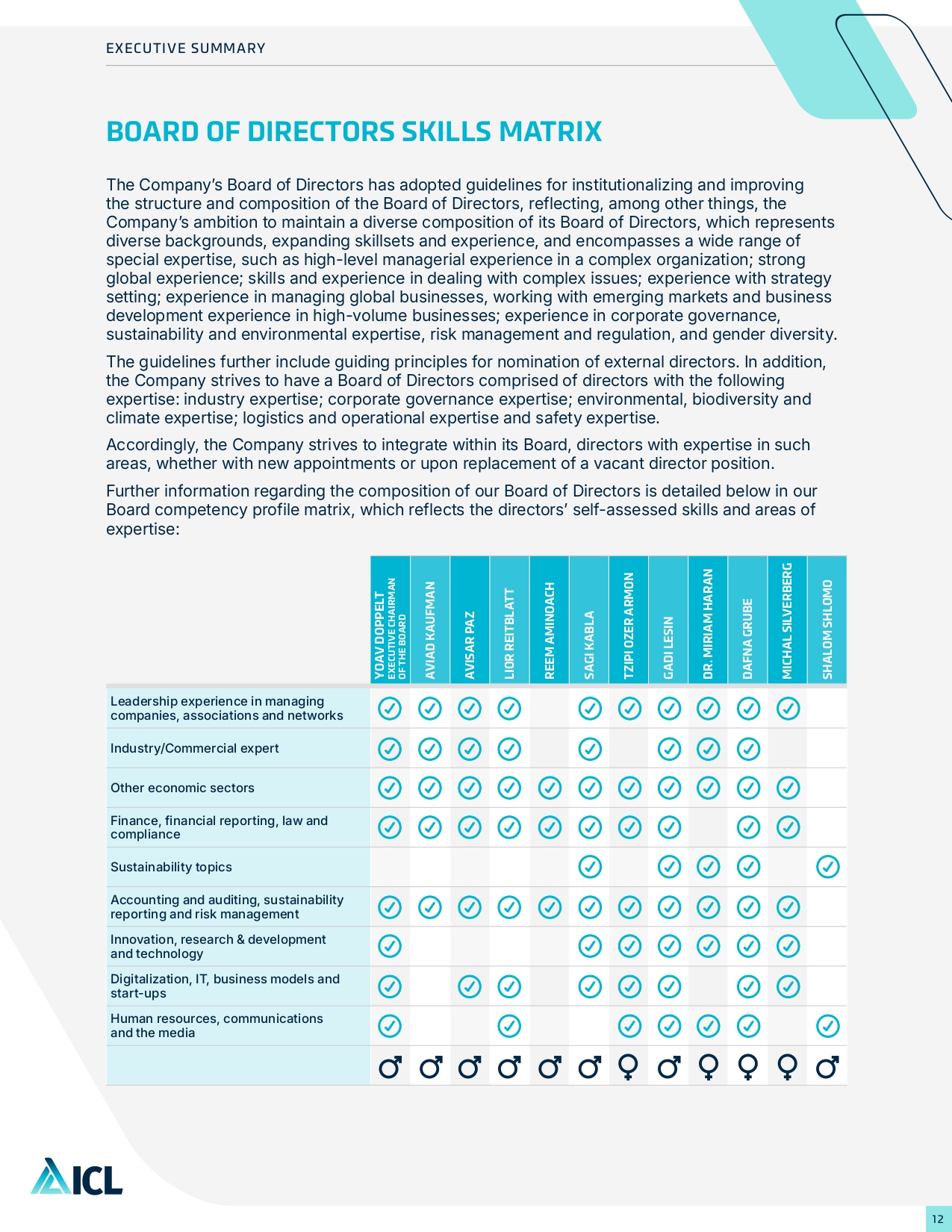 EX EC U T IVE SUM M M A RY董事会技能矩阵公司董事会已采纳将董事会的结构和组成制度化和改进的指导方针,其中反映出公司保持董事会多元化构成的雄心,这代表着不同的背景、不断扩大的技能组合和经验,并包含广泛的特殊专长,例如在复杂组织中的高级管理经验;强大的全球经验;处理复杂问题的技能和经验;战略制定经验;管理全球业务的经验,与新兴市场合作,拥有大批量业务的业务发展经验;在公司治理、可持续性和环境专业知识、风险管理和监管以及性别多样性方面的经验。指引进一步纳入外部董事提名的指导原则。此外,公司努力建立一个由具有以下专长的董事组成的董事会:行业专长;公司治理专长;环境、生物多样性和气候专长;物流和运营专长以及安全专长。因此,公司努力在其董事会内整合在这些领域具有专长的董事,无论是新任命还是在更换空缺的董事职位时。SHALOM SHLOMO MICHAL SILVERBERG DAFNA GRUBE博士MIRIAM HARAN GADI LESIN TZIPI OZER ARMON SAGI KABLA REEM AMINOACH LIOR REITs BLATT AVISAR PAZ AVIAD KAUFMAN YOAV DOPPELT董事会执行主席有关我们董事会组成的更多信息,详见我们的董事会能力概况矩阵,该矩阵反映了董事自我评估的技能和专业领域:管理公司、协会和网络的领导经验行业/商业专家其他经济领域金融、财务报告、法律和合规可持续发展主题会计和审计、可持续发展报告和风险管理创新、研发和技术数字化、IT,商业模式和初创企业人力资源、通信和媒体12