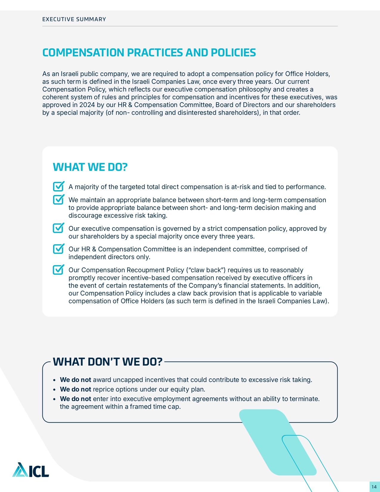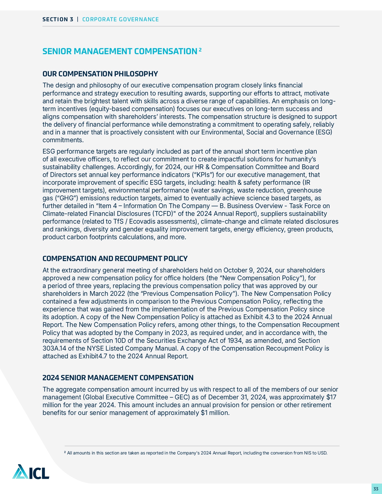 SE C TI O N 3 | C O R P O R at E GOV E R N A N C E高级管理人员薪酬2我们的薪酬理念我们的高管薪酬计划的设计和理念将财务业绩和战略执行与由此产生的奖励紧密联系在一起,支持我们努力吸引、激励和留住拥有各种能力范围内技能的最聪明的人才。强调长期激励(基于股权的薪酬)使我们的高管关注长期成功,并使薪酬与股东利益保持一致。薪酬结构旨在支持财务业绩的交付,同时表明对安全、可靠和以与我们的环境、社会和治理(ESG)承诺积极一致的方式运营的承诺。ESG绩效目标定期被纳入所有执行官年度短期激励计划的一部分,以反映我们致力于为人类的可持续性挑战创造有影响力的解决方案。因此,对于2024年,我们的人力资源与薪酬委员会和董事会为我们的执行管理层设定了年度关键绩效指标(“KPI”),其中包括特定ESG目标的改善,包括:健康与安全绩效(IR改善目标)、环境绩效(节水、减少废物、温室气体(“GHG”)减排目标,旨在最终实现基于科学的目标,详见2024年年度报告“项目4 –公司信息— B.业务概览-气候相关财务披露(TCFD)工作组”)、供应商可持续发展绩效(与TFS/ECOVADIS评估相关),气候变化和气候相关的披露和排名、多样性和性别平等改善目标、能源效率、绿色产品、产品碳足迹计算等等。补偿及追讨政策于2024年10月9日举行的股东特别大会上,我们的股东批准了一项新的公职人员补偿政策(“新补偿政策”),为期三年,以取代我们的股东于2022年3月批准的先前补偿政策(“先前补偿政策”)。新的补偿政策与之前的补偿政策相比包含了一些调整,反映了之前的补偿政策通过以来在实施过程中获得的经验。2024年年报附有一份新的补偿政策副本,作为附件 4.3。除其他外,新补偿政策指的是公司根据经修订的1934年《证券交易法》第10D条和《纽约证券交易所上市公司手册》第303A.14条的要求并根据其要求于2023年通过的补偿补偿政策。补偿补偿政策的副本作为附件4.7附在2024年年度报告中。2024年高级管理人员薪酬截至2024年12月31日,我们就高级管理人员(全球执行委员会– GEC)的所有成员产生的总薪酬金额在2024年约为1700万美元。这一数额包括我们高级管理层每年约100万美元的养老金或其他退休福利准备金。2本节中的所有金额均按公司2024年年度报告中的报告计算,包括从NIS转换为美元。33
