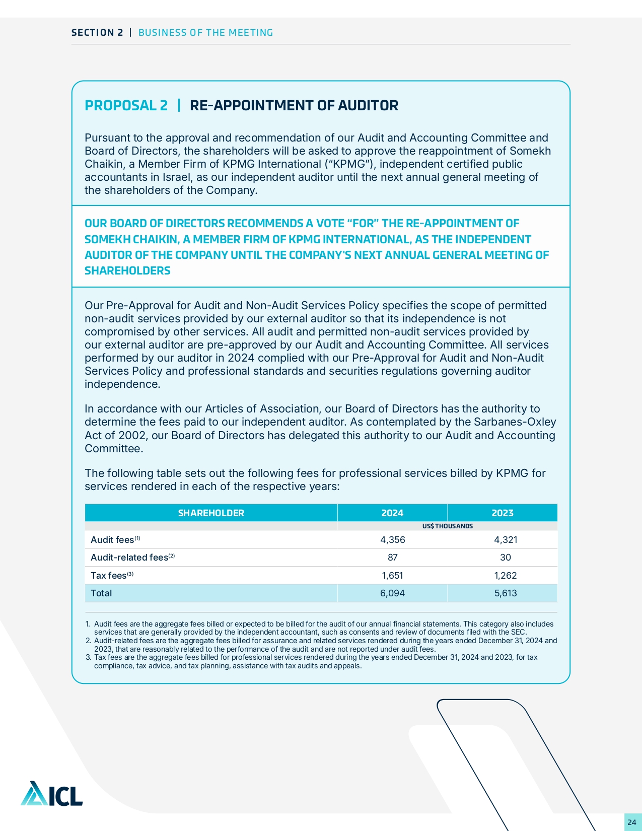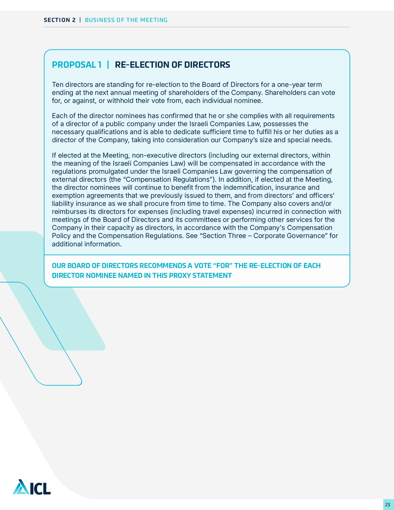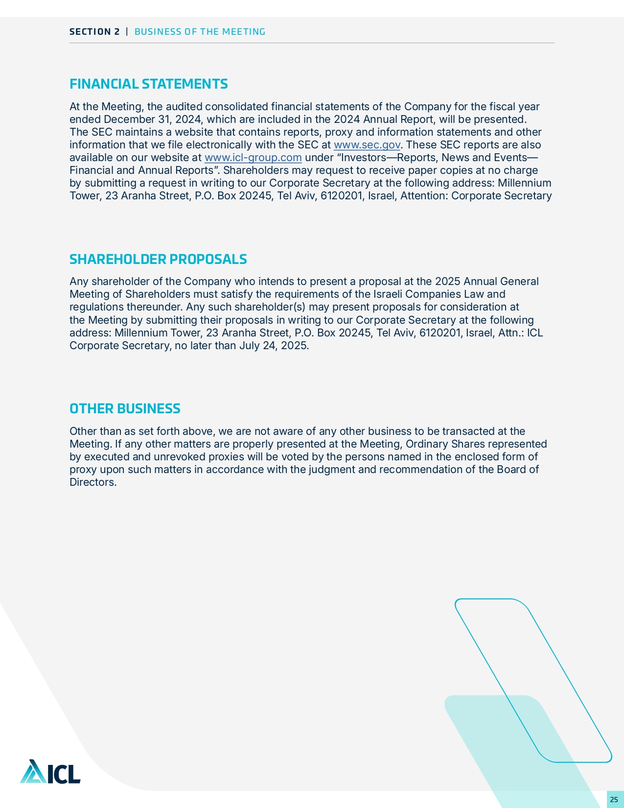 SE C TI O N 2 | BU S I N E S O F T H E M E E E T I N G财务报表在会上,将呈报公司截至2024年12月31日止财政年度的经审核综合财务报表,该报表载列于2024年年度报告内。SEC维护一个网站,其中包含报告、代理和信息声明以及我们以电子方式向SEC提交的其他信息,网址为www.sec.gov。这些SEC报告也可在我们的网站www.icl-group.com的“投资者——报告、新闻和事件——财务和年度报告”下查阅。股东可通过在以下地址向我们的公司秘书提交书面请求免费索取纸质副本:Millennium Tower,23 Aranha Street,P.O. Box 20245,Tel Aviv,6120201,Israel,注意:公司秘书股东提议公司的任何股东如拟在2025年年度股东大会上提交提案,必须满足以色列公司法及其规定的要求。任何该等股东均可将其提案以书面形式提交本公司公司秘书,地址如下:Millennium Tower,23 Aranha Street,P.O. Box 20245,Tel Aviv,6120201,Israel,ATTn.:ICL公司秘书,提交提案以供会议审议,不迟于2025年7月24日。除上文所述以外的其他业务,我们不知道有任何其他业务将在会议上进行交易。如果在会议上适当提出任何其他事项,由已执行和未撤销的代理人所代表的普通股将由随附的代理表格中指定的人根据董事会的判断和建议就此类事项进行投票。25