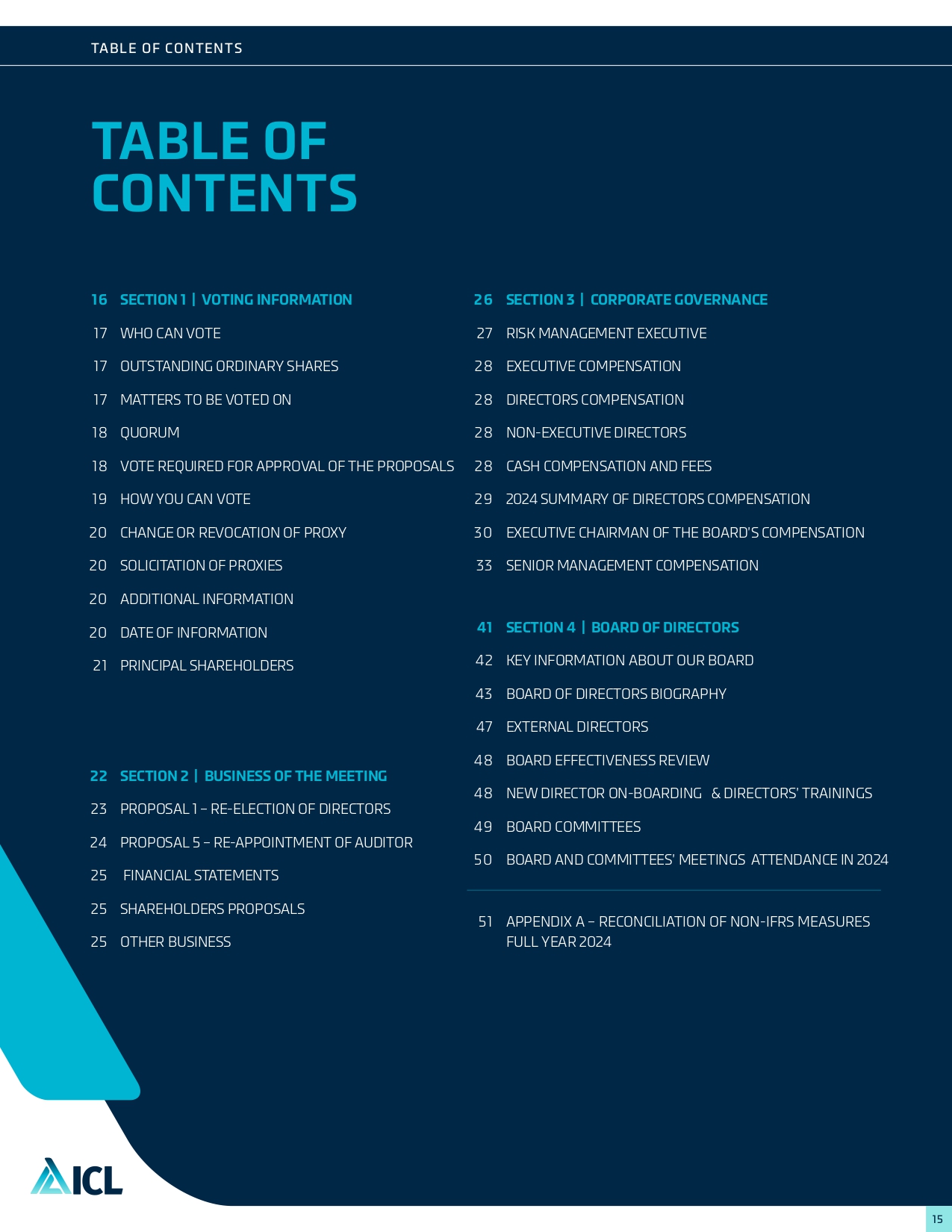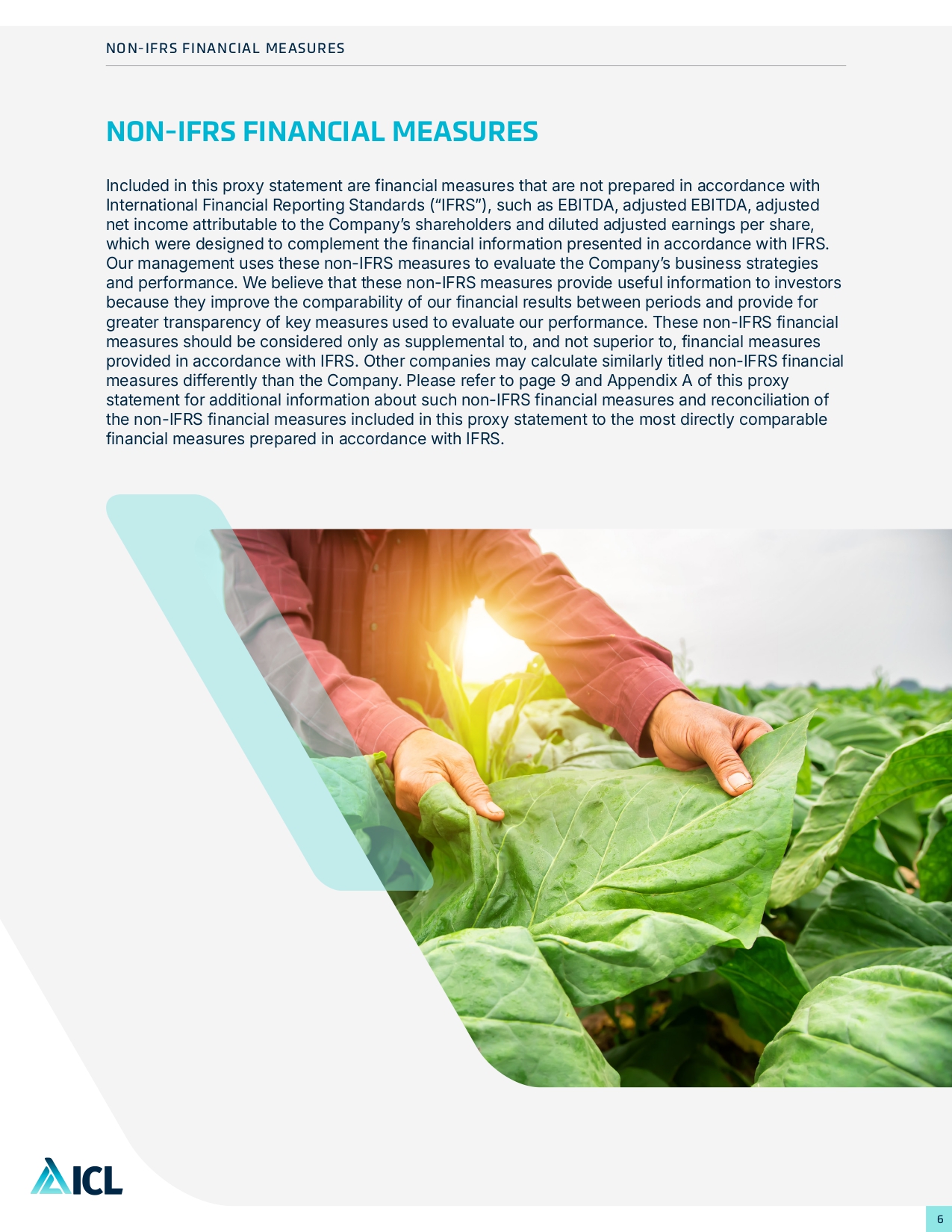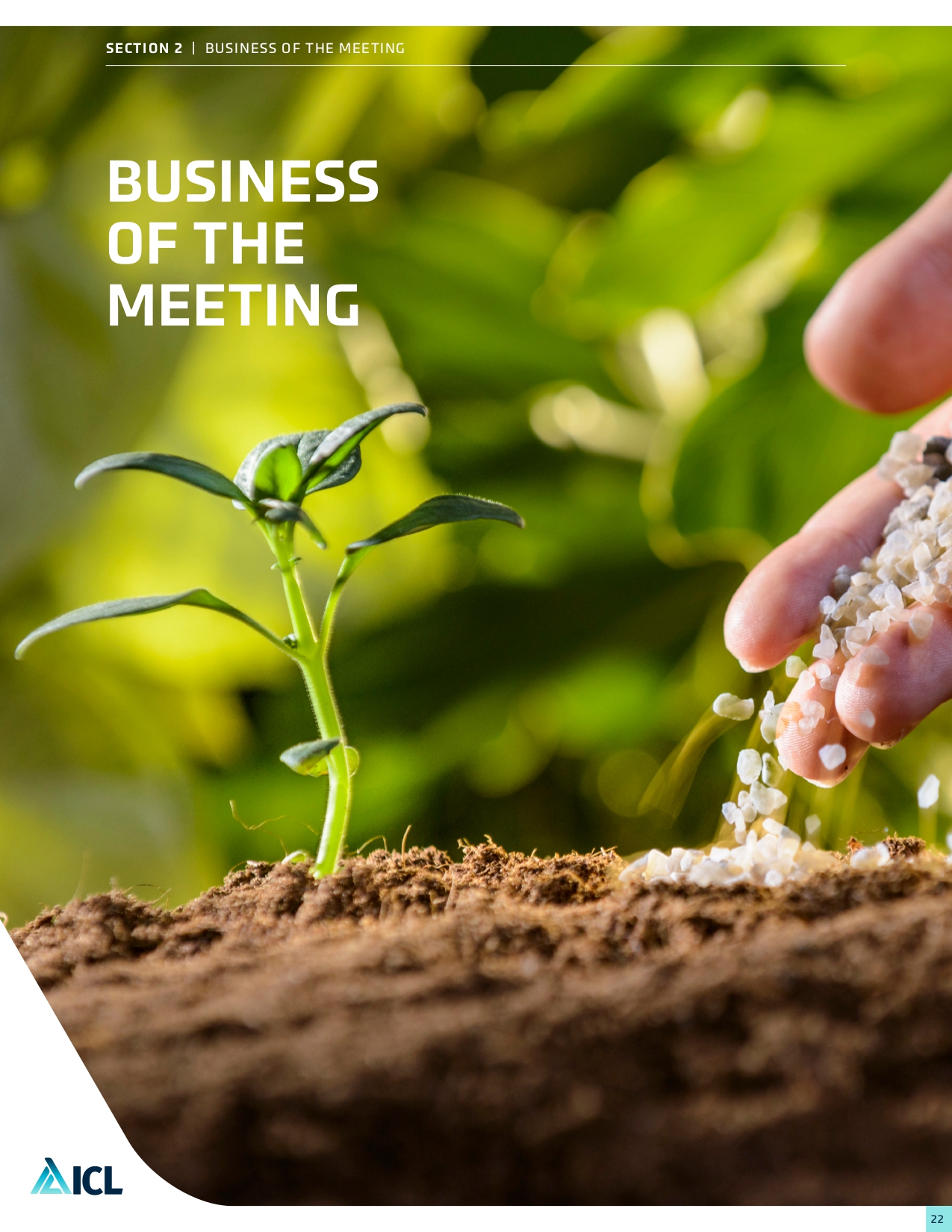 SE C TI O N 2 | BU S I N E S O F T H E M E E E T I N G财务报表在会上,将呈报公司截至2024年12月31日止财政年度的经审核综合财务报表,该报表载列于2024年年度报告内。SEC维护一个网站,其中包含报告、代理和信息声明以及我们以电子方式向SEC提交的其他信息,网址为www.sec.gov。这些SEC报告也可在我们的网站www.icl-group.com的“投资者——报告、新闻和事件——财务和年度报告”下查阅。股东可通过在以下地址向我们的公司秘书提交书面请求免费索取纸质副本:Millennium Tower,23 Aranha Street,P.O. Box 20245,Tel Aviv,6120201,Israel,注意:公司秘书股东提议公司的任何股东如拟在2025年年度股东大会上提交提案,必须满足以色列公司法及其规定的要求。任何该等股东均可将其提案以书面形式提交本公司公司秘书,地址如下:Millennium Tower,23 Aranha Street,P.O. Box 20245,Tel Aviv,6120201,Israel,ATTn.:ICL公司秘书,提交提案以供会议审议,不迟于2025年7月24日。除上文所述以外的其他业务,我们不知道有任何其他业务将在会议上进行交易。如果在会议上适当提出任何其他事项,由已执行和未撤销的代理人所代表的普通股将由随附的代理表格中指定的人根据董事会的判断和建议就此类事项进行投票。25