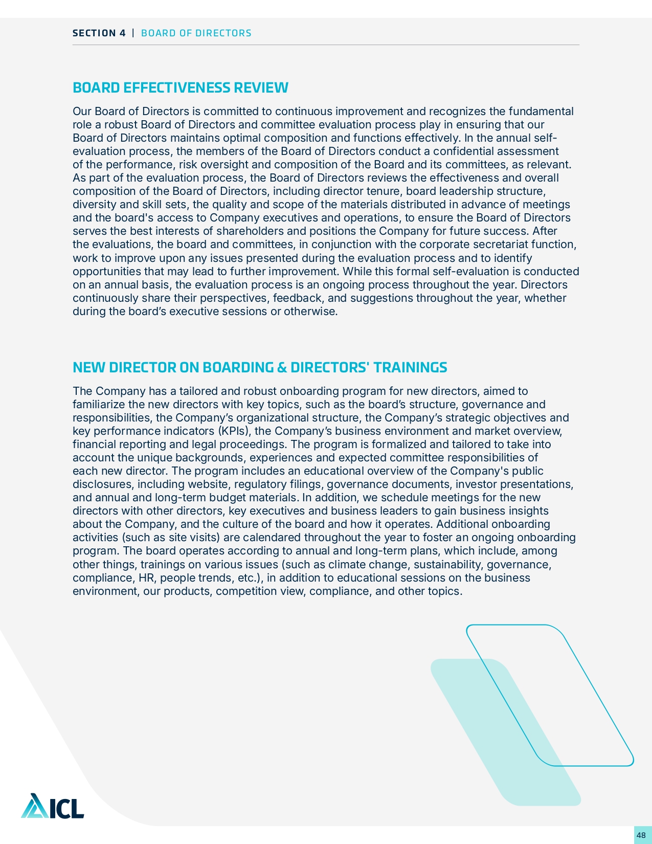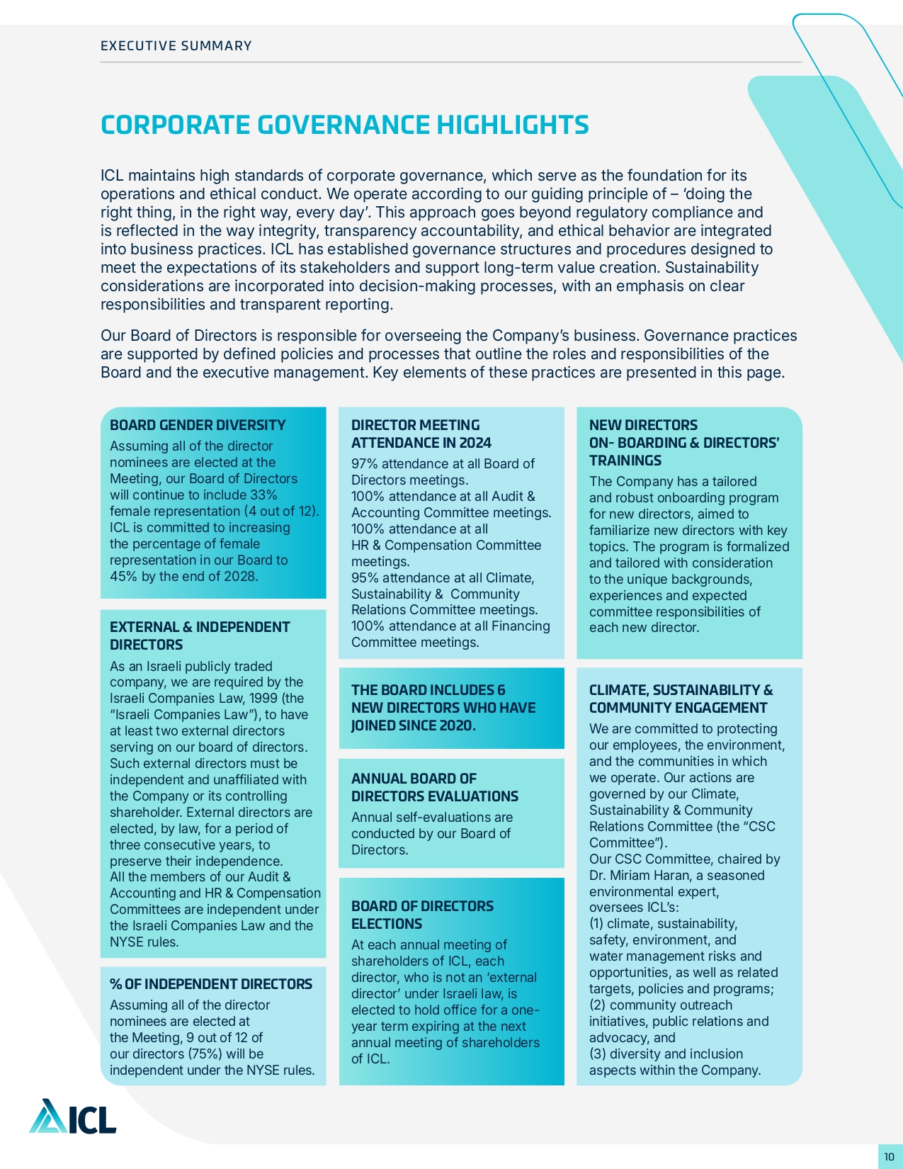 EX EC U T IVE SUM M M A RY公司治理亮点丨ICL保持高标准的公司治理,这是其运营和道德操守的基础。我们按照我们的指导原则——‘做正确的事,用正确的方式,每一天’来运作。这种方法超越了监管合规,体现在将诚信、透明度问责和道德行为融入商业实践的方式上。ICL建立了治理结构和程序,旨在满足利益相关者的期望并支持长期价值创造。可持续性考虑因素被纳入决策过程,重点是明确的责任和透明的报告。我们的董事会负责监督公司的业务。治理实践得到明确的政策和流程的支持,这些政策和流程概述了联委会和执行管理层的作用和责任。本页介绍了这些做法的关键要素。董事会性别多样性假设所有董事提名人都在会议上当选,我们的董事会将继续包括33%的女性代表(12人中有4人)。ICL致力于到2028年底将董事会中的女性代表比例提高到45%。外部&独立董事作为一家以色列上市公司,1999年《以色列公司法》(“以色列公司法”)要求我们至少有两名外部董事在我们的董事会任职。该等外部董事必须是独立的,与公司或其控股股东无关联关系。外部董事依法选举产生,任期连续三年,以保持独立性。根据以色列公司法和纽交所规则,我们审计与会计和人力资源与薪酬委员会的所有成员都是独立的。%的独立董事假设所有被提名的董事都在会议上当选,我们的12名董事中有9名(75%)将根据纽约证券交易所的规则保持独立。2024年董事会议出席率所有董事会会议出席率97%。100%出席所有审计与会计委员会会议。100%出席所有人力资源与薪酬委员会会议。95%出席所有气候、可持续发展和社区关系委员会会议。100%出席所有融资委员会会议。董事会包括6名自2020年以来加入的新董事。年度董事会评估年度自我评估由我们的董事会进行。董事会选举在ICL的每次年度股东大会上,每位董事(根据以色列法律不是‘外部董事’)均被选举产生,任期一年,至ICL的下一次年度股东大会届满。新董事入职和董事培训公司为新董事制定了量身定制的、强大的入职计划,旨在让新董事熟悉关键主题。该计划是根据每位新任董事的独特背景、经历和预期的委员会职责进行正规化和量身定制的。气候、可持续性和社区参与我们致力于保护我们的员工、环境以及我们经营所在的社区。我们的行动由我们的气候、可持续发展和社区关系委员会(“CSC委员会”)管理。我们的CSC委员会由经验丰富的环境专家Miriam Haran博士担任主席,负责监督ICL:(1)气候、可持续性、安全、环境和水管理的风险和机会,以及相关的目标、政策和计划;(2)社区外联倡议、公共关系和宣传,以及(3)公司内部的多样性和包容性方面。10