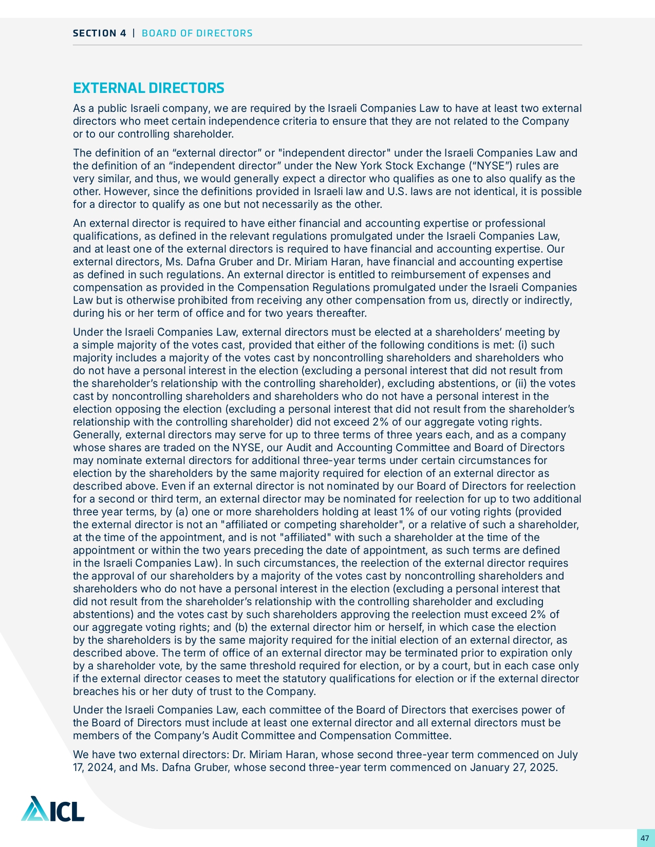 SE C TI O N 4 | B OA R D O F D I R E C T O R S外部董事作为一家以色列上市公司,以色列公司法要求我们至少有两名外部董事符合某些独立性标准,以确保他们与公司或我们的控股股东没有关联。以色列公司法对“外部董事”或“独立董事”的定义与纽约证券交易所(“NYSE”)规则对“独立董事”的定义非常相似,因此,我们通常会期望有资格成为其中一位的董事也有资格成为另一位。然而,由于以色列法律和美国法律中规定的定义并不相同,董事有可能有资格成为其中一位,但不一定是另一位。外部董事必须具备根据以色列公司法颁布的相关规定所定义的财务和会计专门知识或专业资格,并且外部董事中至少需要有一名具有财务和会计专门知识。我们的外部董事Dafna Gruber女士和Miriam Haran博士拥有该等法规中定义的财务和会计专业知识。外部董事有权获得根据以色列公司法颁布的《补偿条例》规定的费用和补偿的补偿,但在其他方面被禁止在其任期内以及其后两年内直接或间接从我们那里获得任何其他补偿。根据以色列公司法,外部董事必须在股东大会上以所投选票的简单多数选出,前提是满足以下任一条件:(i)这种多数包括非控股股东和在选举中没有个人利益的股东所投的多数票(不包括并非由于股东与控股股东的关系而产生的个人利益),不包括弃权,或(ii)非控股股东和在反对选举的选举中没有个人利益的股东(不包括不是由于股东与控股股东的关系而产生的个人利益)所投的票数不超过我们总投票权的2%。一般来说,外部董事最多可担任三届,每届任期三年。作为一家股票在纽约证券交易所交易的公司,我们的审计和会计委员会和董事会可以在某些情况下提名额外三年任期的外部董事,供股东按上述选举外部董事所需的相同多数选举。即使外部董事没有被我们的董事会提名连任二届或三届,外部董事也可以被提名连任最多两届三年,由(a)一名或多名持有至少1%我们投票权的股东(前提是该外部董事在任命时不是“关联或竞争股东”,或该股东的亲属,并且在任命时或任命日期前两年内不与此类股东“有关联”,因为这些术语在以色列公司法中有定义)。在这种情况下,外部董事的改选需要我们的股东以非控股股东和在选举中没有个人利益的股东所投的多数票(不包括不是由于股东与控股股东的关系而产生的个人利益和不包括弃权票)批准,并且这些股东批准改选的票数必须超过我们总投票权的2%;以及(b)外部董事本人,如上文所述,在这种情况下,股东以首次选举外部董事所需的相同多数进行选举。外部董事的任期可以在届满前终止,只能通过股东投票、选举所需的相同门槛或法院,但在每种情况下,只有在外部董事不再符合法定选举资格或外部董事违反其对公司的信托义务的情况下。根据以色列公司法,董事会每个行使董事会权力的委员会必须包括至少一名外部董事,所有外部董事必须是公司审计委员会和薪酬委员会的成员。我们有两名外部董事:Miriam Haran博士,其第二个三年任期于2024年7月17日开始,Dafna Gruber女士,其第二个三年任期于2025年1月27日开始。47