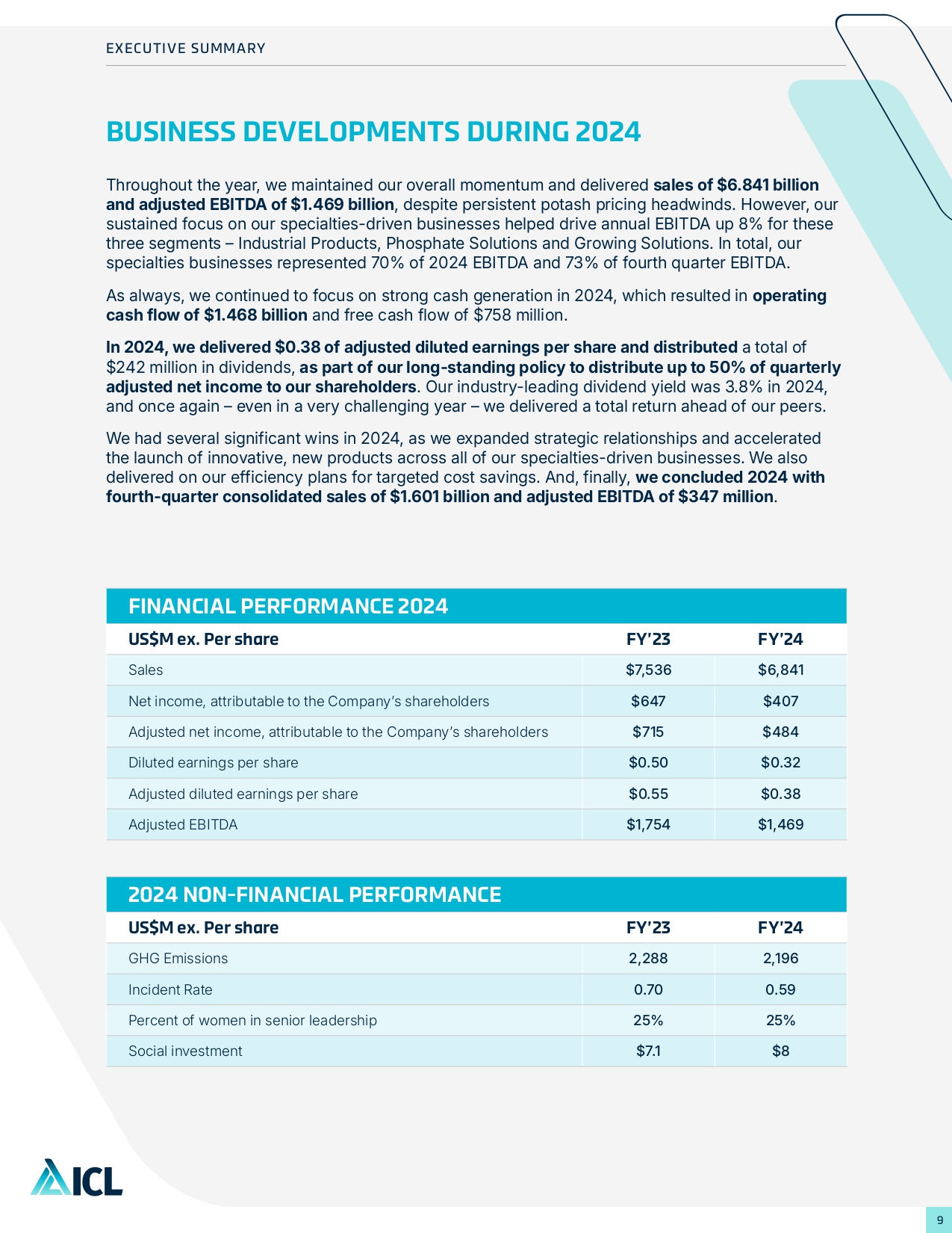 EX EC U T IVE SUM M A RY 2024年期间的业务发展在这一年中,我们保持了总体势头,实现了68.41亿美元的销售额和14.69亿美元的调整后EBITDA,尽管钾肥定价逆风持续存在。然而,我们对以专业为驱动的业务的持续关注帮助推动这三个部门的年度EBITDA增长了8% ——工业产品、磷酸盐解决方案和增长解决方案。总的来说,我们的专业业务占2024年EBITDA的70%,占第四季度EBITDA的73%。与往常一样,我们继续关注2024年强劲的现金生成,这导致运营现金流为14.68亿美元,自由现金流为7.58亿美元。2024年,我们实现了0.38美元的调整后稀释后每股收益,并分配了总计2.42亿美元的股息,这是我们向股东分配高达50%的季度调整后净收入的长期政策的一部分。2024年,我们行业领先的股息收益率为3.8%,我们再次——即使在非常具有挑战性的一年——实现了领先于同行的总回报率。我们在2024年取得了几项重大胜利,因为我们扩大了战略关系,并加速在我们所有以专业为驱动的业务中推出创新的新产品。我们还交付了我们的效率计划,以实现有针对性的成本节约。最后,我们以16.01亿美元的第四季度综合销售额和3.47亿美元的调整后EBITDA结束了2024年。2024年度财务业绩百万美元ex。每股FY‘23 FY’24销售额$ 7,536 $ 6,841净收益,归属于公司股东$ 647 $ 407调整后净收益,归属于公司股东$ 715 $ 484稀释后每股收益$ 0.50 $ 0.32调整后稀释后每股收益$ 0.55 $ 0.38调整后EBITDA $ 1,754 $ 1,469 US $ M ex。每股FY‘23 FY’24 GHG排放2,2882,196事故率0.70 0.59%女性担任高级领导层25% 25%社会投资$ 7.1 $ 82024年非金融业绩9