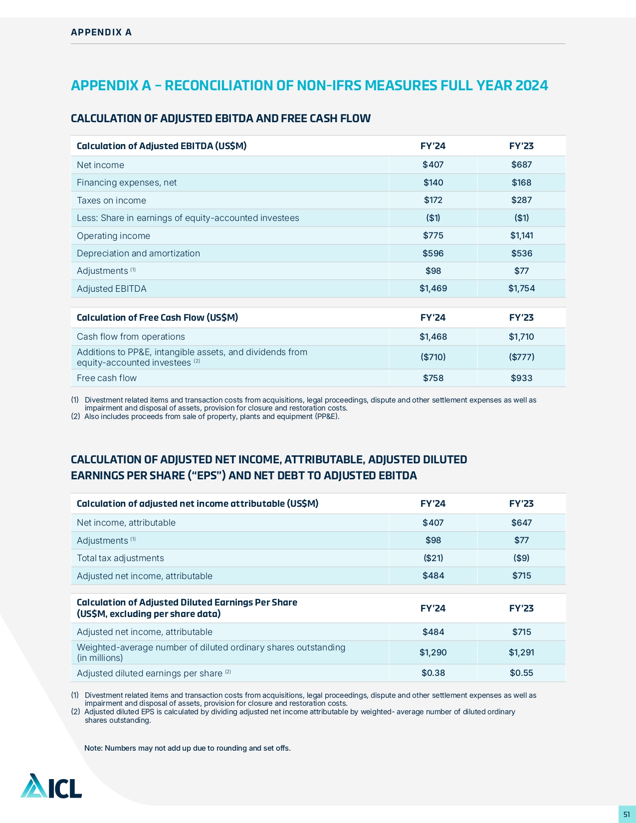 AP P E N D I X A附录A – 2024年全年非国际财务报告准则措施的调节计算调整后EBITDA和自由现金流计算调整后EBITDA(百万美元)FY‘24 FY’23净收入407美元687美元融资费用,净额140美元168收入税172美元287美元减:权益核算被投资方收益份额(1美元)(1美元)营业收入775美元1141美元折旧和摊销596美元536美元98美元77美元调整后EBITDA 1469美元1754美元自由现金流计算(百万美元)FY‘24 FY’23运营现金流1468美元1710 PP & E、无形资产、和来自权益核算被投资方的股息(2)(710美元)(777美元)自由现金流758美元933美元调整(1)(1)剥离相关项目和来自收购、法律诉讼、争议和其他和解费用的交易成本以及资产减值和处置、关闭和恢复成本拨备。(2)还包括出售物业、厂房和设备(PP & E)的收益。调整后净收入、归属、调整后稀释每股收益(“EPS”)和调整后EBITDA的债务净额的计算调整后归属净利润(百万美元)FY‘24 FY’23调整后净利润,归属于407美元647美元调整(1)$ 98 $ 77税项调整总额(21美元)(9美元)调整后净利润,归属于484美元715美元调整后稀释每股收益(百万美元,不包括每股数据)FY‘24 FY’23调整后净利润,归属于484美元715已发行稀释普通股加权平均数(百万美元)1,290美元1,291美元调整后稀释每股收益(2)0.38美元0.55美元(争议和其他和解费用以及资产减值和处置、关闭和恢复费用拨备。(2)调整后摊薄每股收益的计算方法是调整后归属净利润除以已发行稀释普通股的加权平均数。注:由于四舍五入和抵销,数字可能不相加。51