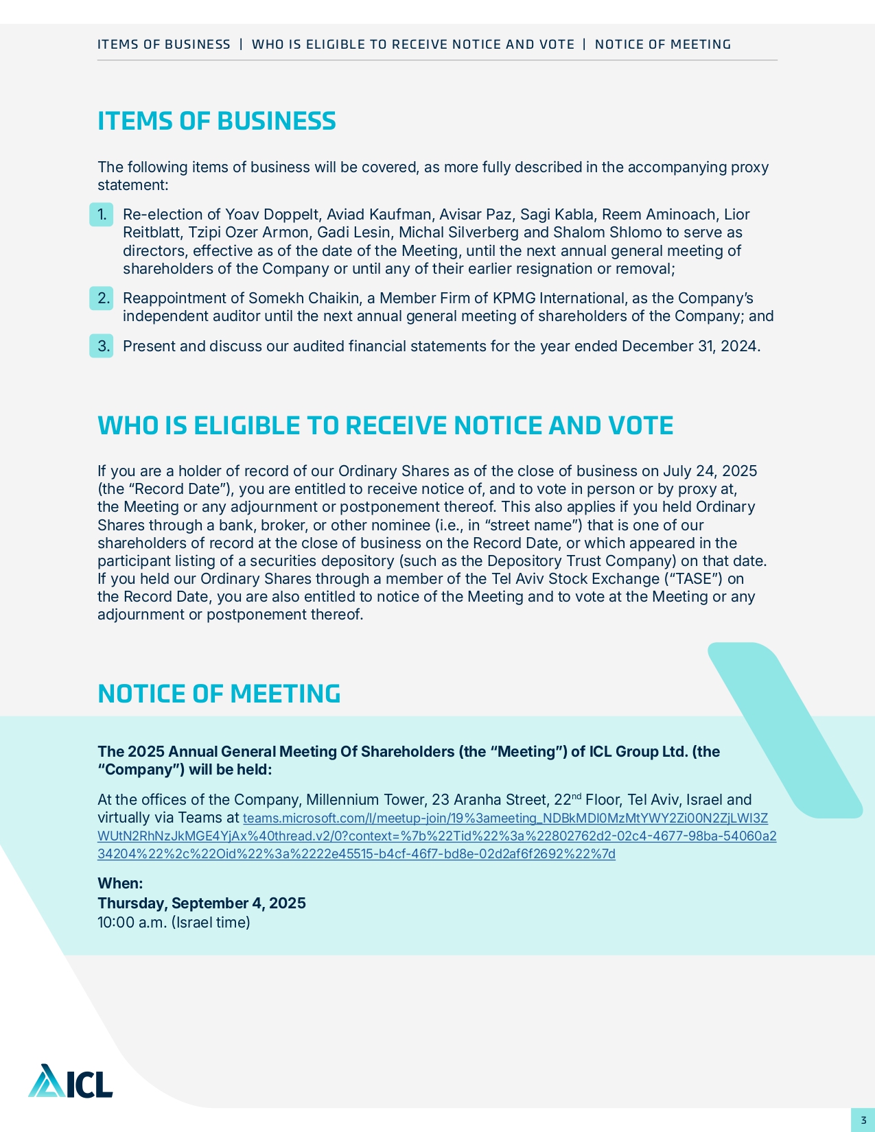 IT EMS O F B US I N E S S | WH O I S E L I GI B L E T O R E CE I V E N OT I CE A N D VOT E | N OT I CE of M E T I N G items of business将涵盖以下业务项目,详见随附的代理声明:1。重新选举Yoav Doppelt、Aviad Kaufman、Avisar Paz、Sagi Kabla、TERM3、Reem Aminoach、Lior Reitblatt、TERM5、Tzipi Ozer Armon、Gadi Lesin、Michal Silverberg和Shalom Shlomo担任董事,自会议召开之日起生效,直至公司下届年度股东大会或直至其任何较早辞职或免职;2。续聘毕马威国际成员事务所Somekh Chaikin为公司独立核数师,任期至公司下届股东周年大会止;及3。提出并讨论我们截至2024年12月31日止年度的经审计财务报表。有资格收到通知和投票的人如果您是截至2025年7月24日(“记录日期”)营业时间结束时我们普通股的记录持有人,您有权收到会议通知,并有权亲自或通过代理人在会议或其任何休会或延期会议上投票。如果您通过银行、经纪人或其他代名人(即“街道名称”)持有普通股,而这些代名人在记录日期营业结束时是我们的记录股东之一,或在该日期出现在证券存管机构(例如存管信托公司)的参与者列表中,这也适用。如果您在记录日期通过特拉维夫证券交易所(“TASE”)的成员持有我们的普通股,您也有权收到会议通知并在会议或任何休会或延期会议上投票。ICL Group股份有限公司(“公司”)2025年年度股东大会(“会议”)的召开通知:在公司办公室,Millennium Tower,23 Aranha Street,22nd Floor,Tel Aviv,Israel并通过Teams.microsoft.com/l/meetup-join/19% 3ameeting _ NDBKMDI0MzMTYWY2Zi00N2ZJLWI3Z WUTN2RhNZJKMGE4YJAx % 40thread.v2/0?context =% 7b % 22Tid % 22% 3a % 22802762d2-02c4-4677-98ba-54060a2 34204 % 22% 2c % 22Oid % 22% 3a