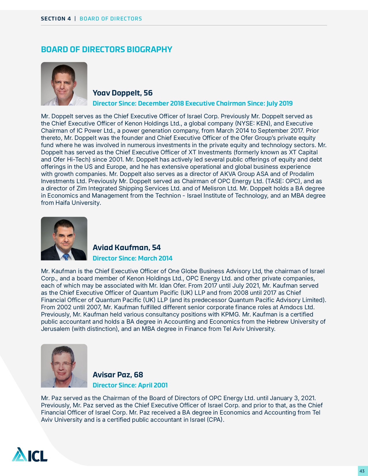 SE C TI O N4 | B OA R D O F D I R E C T O R S董事会简历Yoav Doppelt,56岁董事,自:2018年12月执行主席自:2019年7月Doppelt先生担任Israel Corp.的首席执行官。此前,Doppelt先生曾于2014年3月至2017年9月担任全球化公司建安集团有限公司(NYSE:KEN)的首席执行官,以及发电公司IC Power Ltd.的执行主席。在此之前,Doppelt先生是Ofer集团私募股权基金的创始人和首席执行官,在该基金中,他参与了私募股权和技术领域的众多投资。Doppelt先生自2001年起担任XT投资公司(前身为XT资本和Ofer Hi-Tech)的首席执行官。Doppelt先生曾在美国和欧洲积极领导过几次公开发行股票和债券,他在成长型公司方面拥有丰富的运营和全球业务经验。Doppelt先生还担任AKVA Group ASA和Prodalim Investments Ltd.的董事。此前,Doppelt先生曾担任OPC Energy Ltd.(TASE:OPC)的董事长,以及Zim Integrated Shipping Services Ltd.和Melisron Ltd.的董事。Doppelt先生拥有以色列理工学院的经济和管理学士学位,以及海法大学的MBA学位。Aviad Kaufman,54岁董事,自:2014年3月Kaufman先生是One Globe Business Advisory Ltd的首席执行官、Israel Corp.的董事长,也是建安集团有限公司、OPC Energy Ltd.和其他私营公司的董事会成员,这些公司均可能与Idan Ofer先生有关联。2017年至2021年7月,Kaufman先生担任Quantum Pacific(UK)LLP的首席执行官,并于2008年至2017年担任Quantum Pacific(UK)LLP(及其前身Quantum Pacific Advisory Limited)的首席财务官。从2002年到2007年,Kaufman先生在Amdocs Ltd担任过不同的高级企业财务职务。此前,Kaufman先生曾在毕马威会计师事务所担任过多个咨询职位。Kaufman先生是一名注册会计师,拥有耶路撒冷希伯来大学会计和经济学学士学位(优等生),以及特拉维夫大学金融学MBA学位。Avisar Paz,68岁董事自:2001年4月Paz先生担任OPC Energy Ltd.的董事会主席至2021年1月3日。在此之前,Paz先生曾担任Israel Corp.的首席执行官,在此之前,作为Israel Corp.的首席财务官,Paz先生获得特拉维夫大学经济学和会计学学士学位,并且是以色列的注册会计师(CPA)。43