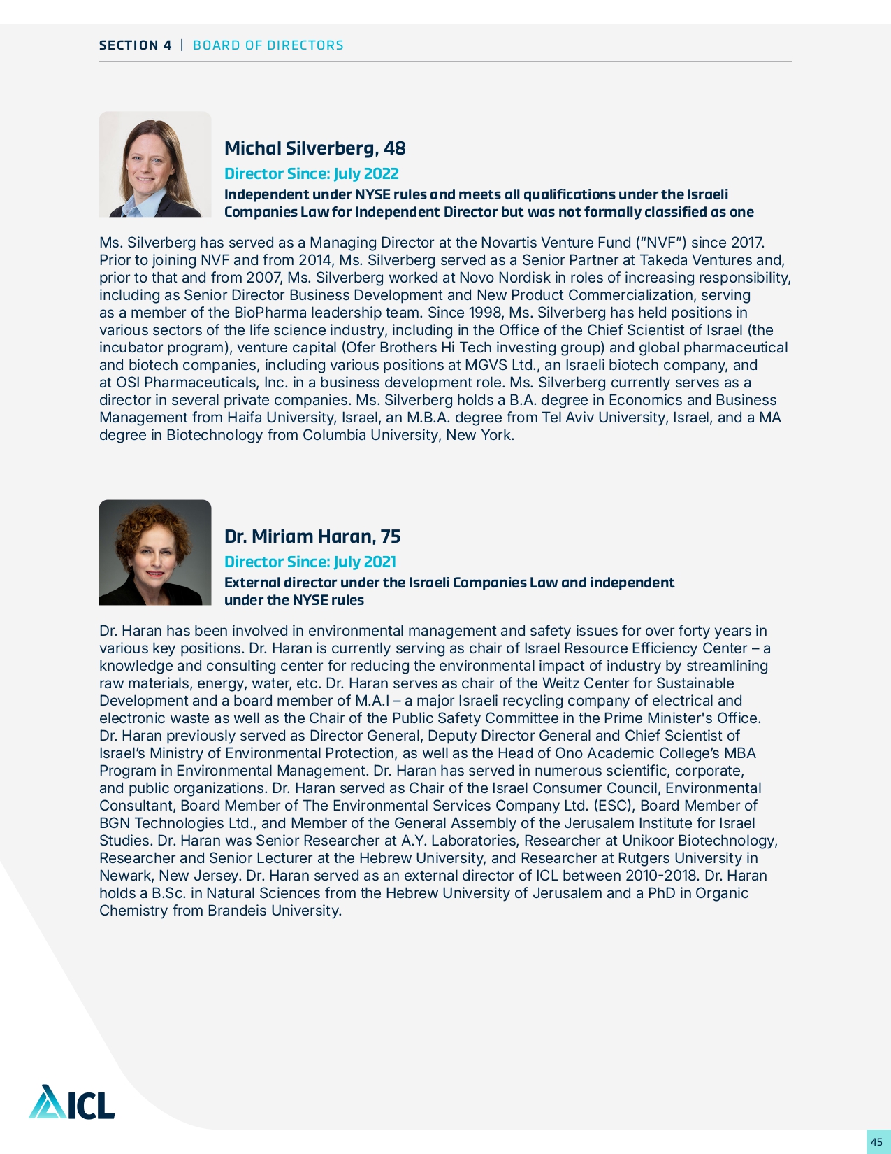 SE C TI O N4 | B OA R D O F D I R E C T O R S Michal Silverberg,48岁董事,自:2022年7月根据纽约证券交易所规则独立,并符合以色列公司法规定的独立董事的所有资格,但未被正式归类为独立董事。Silverberg女士自2017年起担任诺华风险基金(“NVF”)的董事总经理。在加入NVF之前和从2014年起,Silverberg女士担任Takeda Ventures的高级合伙人,在此之前和从2007年起,Silverberg女士在诺和诺德担任越来越重要的职务,包括担任业务发展和新产品商业化高级总监,并担任BioPharma领导团队的成员。自1998年以来,Silverberg女士曾在生命科学行业的各个部门任职,包括在以色列首席科学家办公室(孵化器计划)、风险投资(Ofer Brothers Hi Tech Investment Group)以及全球制药和生物技术公司任职,包括在以色列生物技术公司MGVS Ltd.的多个职位,以及在OSI Pharmaceuticals,Inc.担任业务发展职务。Silverberg女士目前在几家私营公司担任董事。Silverberg女士拥有以色列海法大学经济学和商业管理学士学位、以色列特拉维夫大学工商管理硕士学位和纽约哥伦比亚大学生物技术硕士学位。Miriam Haran博士,75岁董事自:2021年7月以色列公司法下的外部董事和纽约证券交易所规则下的独立董事Haran博士在多个关键职位上涉及环境管理和安全问题超过四十年。Haran博士目前担任以色列资源效率中心的主席——这是一个知识和咨询中心,通过精简原材料、能源、水等来减少工业对环境的影响。Haran博士担任Weitz可持续发展中心主席和M.A.I的董事会成员—— M.A.I是以色列一家主要的电子电气废物回收公司,也是总理办公室公共安全委员会主席。Haran博士此前曾担任以色列环境保护部总干事、副总干事和首席科学家,以及小野学术学院环境管理MBA项目负责人。Haran博士曾在众多科学、企业和公共组织任职。Haran博士曾担任以色列消费者委员会主席、环境顾问、环境服务公司(ESC)董事会成员、BGN Technologies Ltd.董事会成员、耶路撒冷以色列研究所大会成员。Haran博士曾任A.Y. Laboratories高级研究员、Unikoor Biotechnology研究员、希伯来大学研究员和高级讲师,以及新泽西州纽瓦克的罗格斯大学研究员。Haran博士在2010-2018年期间担任ICL的外部董事。Haran博士拥有耶路撒冷希伯来大学自然科学学士学位和布兰代斯大学有机化学博士学位。45