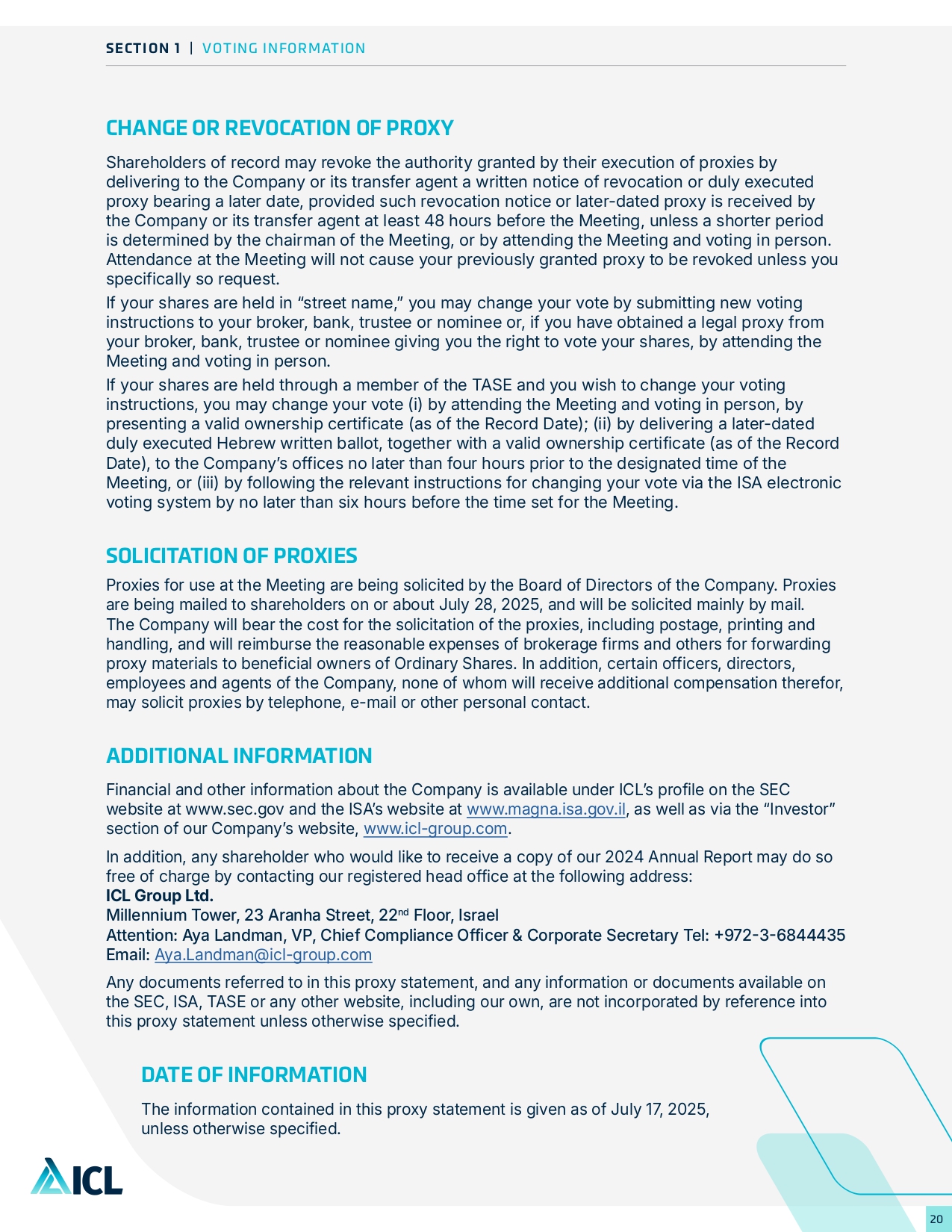 SE C TI O N1 | VO T I N G I N F O R M ATI O N更改或撤销代理,记录在案的股东可以通过向公司或其转让代理人交付书面撤销通知或妥为签立并注明日期的代理撤销其执行代理所授予的权限,但公司或其转让代理人至少在会议召开前48小时收到该撤销通知或较迟签立的代理的,除非会议主席确定更短的期限,或亲自出席会议并投票表决。出席会议不会导致您先前授予的代理被撤销,除非您特别要求。如果你的股份以“街道名称”持有,你可以通过向你的经纪人、银行、受托人或代名人提交新的投票指示来改变你的投票,或者,如果你已经从你的经纪人、银行、受托人或代名人那里获得了给予你对你的股份投票权的法定代理人,你可以通过亲自出席会议和投票来改变你的投票。如果你的股份是通过TASE的成员持有,而你希望改变你的投票指示,你可以(i)通过亲自出席会议并投票,通过出示有效的所有权证书(截至记录日期);(ii)通过不迟于会议指定时间的四小时前向公司办公室交付较晚日期的正式签署的希伯来文书面投票,连同有效的所有权证书(截至记录日期),改变你的投票,或(iii)在不迟于为会议设定的时间前六小时,按照有关指示通过ISA电子投票系统更改投票。公司董事会正在征集在会议上使用的代理代理人。代理将于2025年7月28日或前后邮寄给股东,并将主要通过邮寄方式征集。公司将承担征集代理的费用,包括邮资、印刷和处理,并将补偿券商和其他机构向普通股受益所有人转发代理材料的合理费用。此外,公司的某些高级职员、董事、雇员和代理人,他们都不会因此获得额外补偿,可以通过电话、电子邮件或其他个人联系方式征集代理人。有关公司的更多信息财务和其他信息,请访问SEC网站www.sec.gov和ISA网站www.magna.isa.gov.il上的ICL简介,以及通过我们公司网站www.icl-group.com的“投资者”部分。此外,任何希望获得我们2024年年度报告副本的股东可通过以下地址联系我们的注册总部免费获得:ICL Group Ltd. Millennium Tower,23 Aranha Street,22 Floor,Israel收件人:Aya Landman,副总裁、首席合规官兼公司秘书电话:+ 972-3-6844435电子邮件:Aya.Landman@icl-group.com本代理声明中提及的任何文件,以及SEC、ISA、TASE或任何其他网站(包括我们自己的网站)上提供的任何信息或文件,除非另有说明,否则不会通过引用方式并入本代理声明。信息发布日期本代理声明中包含的信息截至2025年7月17日,除非另有说明。20