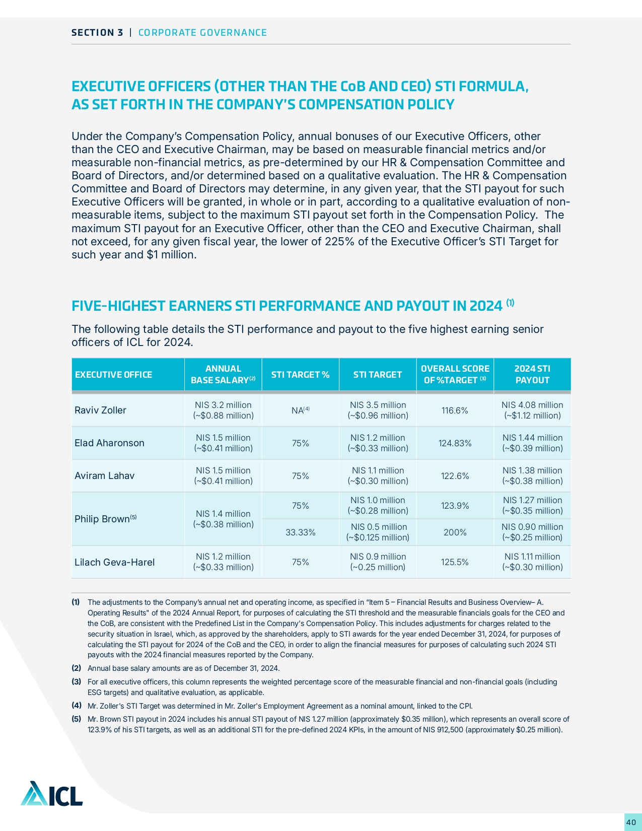 SE C TI O N 3 | C O R P O R at E GOV E R N A N C E Executive Officers(COB和CEO除外)STI Formula,根据公司薪酬政策下的公司薪酬政策规定,我们的执行官(CEO和执行主席除外)的年度奖金可能基于可衡量的财务指标和/或可衡量的非财务指标,由我们的人力资源与薪酬委员会和董事会预先确定,和/或基于定性评估确定。人力资源与薪酬委员会和董事会可在任何特定年份,根据对不可计量项目的定性评估,决定全部或部分授予此类执行官的STI支出,但须遵守薪酬政策中规定的最高STI支出。除首席执行官和执行主席外,执行干事的最高STI支出在任何特定财政年度不得超过该执行干事该年度STI目标的225%和100万美元中的较低者。2024年STI业绩和薪酬最高的五位收入者(1)下表详细列出了2024年STI业绩和向收入最高的五位ICL高级管理人员支付的薪酬。执行办公室年度基本工资(2)STI目标% STI目标% STI目标总得分% TARGET(3)2024年STI支出Raviv Zoller 320万新谢克尔(~0.88万美元)NA(4)350万新谢克尔(~0.96万美元)116.6% 408万新谢克尔(~112万美元)Elad Aharonson 150万新谢克尔(~0.41万美元)75% 120万新谢克尔(~0.33万美元)124.83% 144万新谢克尔(~0.39万美元)Aviram Lahav 150万新谢克尔(~0.41万美元)75% 110万新谢克尔(~0.30美元75% 0.9百万新谢克尔(~0.25百万)125.5% 111万新谢克尔(~0.30百万美元)Philip Brown(5)Lilach Geva-Harel(1)1.4百万新谢克尔(~0.38百万美元)1.2百万新谢克尔(~0.33百万美元)2024年年度报告“项目5 –财务业绩和业务概览– A.经营业绩”中规定的对公司年度净收入和营业收入的调整,用于计算STI阈值和CEO和CoB的可衡量财务目标,与公司薪酬政策中的预定义清单一致。这包括与以色列安全局势相关的费用调整,经股东批准,这些费用适用于截至2024年12月31日止年度的STI奖励,用于计算欧洲央行和首席执行官2024年的STI支出,以便使计算此类2024年STI支出的财务措施与公司报告的2024年财务措施保持一致。(2)年度基薪金额截至2024年12月31日。(3)对于所有执行官,此栏代表可衡量的财务和非财务目标(包括ESG目标)和定性评估的加权百分比得分(如适用)。(4)Zoller先生的STI目标在Zoller先生的雇佣协议中确定为名义金额,与CPI挂钩。(5)Brown先生在2024年的STI支出包括他每年的STI支出127万新谢克尔(约合0.35百万美元),这相当于其STI目标的123.9%的总分,以及针对预先定义的2024年KPI的额外STI,金额为91.25万新谢克尔(约合0.25百万美元)。40