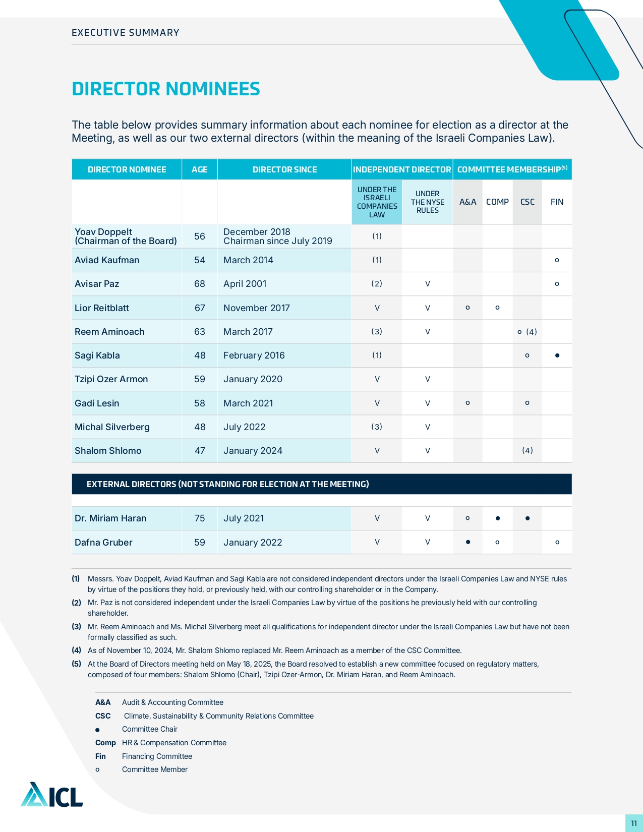 EX EC U T IVE SUM M A RY董事提名人下表提供了有关在会议上被提名为董事的每位被提名人以及我们的两名外部董事(在以色列公司法的含义内)的摘要信息。董事提名年龄董事自独立董事委员会成员资格(5)根据纽约证券交易所规则下的以色列公司法Yoav Doppelt(董事会主席)2018年12月6日主席自2019年7月(1)Aviad Kaufman 2014年3月54日(1)Avisar Paz 2001年4月6日(2)V Lior Reitblatt 2017年11月67日V Reem Aminoach 2017年3月6日(3)V Sagi Kabla 2016年2月8日(1)TERM0 Ozer Armon Tzipi Ozer Armon 2020年1月5日V Gadi Lesin 2021年3月8日V丨米哈尔·西尔弗伯格Michal Silverberg 2022年7月8日(3)V Shalom Shlomo 2024年1月7日V V A & A COMP CSC FIN DV DV DV DV DV DR DV DR DR DR DR DR DR DR DR DR DR DR DR DR DR DR DR DR DR DR DR DR DR DR DR DR DR DR DR DR DR DR DR DR DR DR DR DR DR DR DR根据以色列公司法和纽约证券交易所规则,Dafna Gruber、TERM0和DIFNA Gruber于2022年1月59日V V(1)º º º Messrs. Yoav Doppelt、Aviad Kaufman和Sagi Kabla不被视为以色列公司法和纽约证券交易所规则下的独立董事,因为他们在我们的控股股东中或在公司中担任或以前担任过职务。(2)根据以色列公司法,Paz先生不被视为独立,因为他之前在我们的控股股东中担任过职务。(3)Reem Aminoach先生和Michal Silverberg女士符合以色列公司法规定的所有独立董事资格,但未被正式归类为独立董事。(4)截至2024年11月10日,Shalom Shlomo先生接替Reem Aminoach先生成为CSC委员会成员。(5)在2025年5月18日举行的董事会会议上,董事会决议设立一个新的委员会,专注于监管事务,由四名成员组成:Shalom Shlomo(主席)、Tzipi Ozer-Armon、Miriam Haran博士和Reem Aminoach。A & A Audit & Accounting Committee CSC Climate,Sustainability & Community Relations Committee Committee Chairman Comp HR & Compensation Committee Fin Financing Committee º Committee Member 11