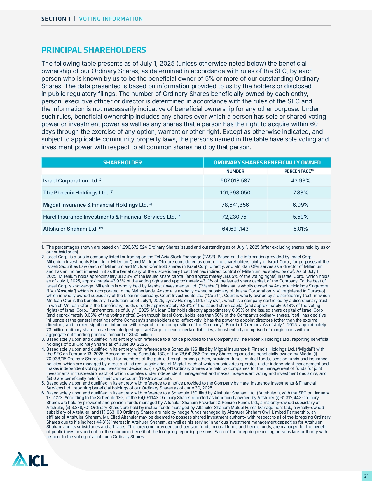 SE C TI O N1 | VO T I N G I N F O R M ATI O N主要股东下表列出了截至2025年7月1日(除非下文另有说明)根据SEC规则确定的我们已知的每一位拥有5%或更多已发行普通股的实益拥有人对我们普通股的实益所有权。所提供的数据基于持有人向我们提供的信息或在公开监管文件中披露的信息。每个实体、个人、执行官或董事实益拥有的普通股数量是根据SEC的规则确定的,这些信息不一定表明出于任何其他目的的实益所有权。根据此类规则,实益所有权包括个人拥有单独或共享投票权或投资权的任何股份,以及个人有权在60天内通过行使任何期权、认股权证或其他权利获得的任何股份。除另有说明外,根据适用的社区财产法,表中所列人员对其持有的所有普通股拥有唯一的投票权和投资权。股东普通股实益拥有数量百分比(1)Israel Corporation Ltd.(2)567,018,58743.93% The Phoenix Holdings Ltd.(3)101,698,0507.88% Migdal Insurance & Financial Holdings Ltd.(4)78,641,3566.09% Harel Insurance Investments & Financial Services Ltd.(5)72,230,7515.59% Altshuler Shaham Ltd.(6)64,691,1435.01% 1。显示的百分比基于截至2025年7月1日已发行和流通的1,290,672,524股普通股(不包括我们或我们的子公司持有的股份)。2.Israel Corp.是一家在特拉维夫证券交易所(TASE)上市交易的上市公司。根据Israel Corp.提供的信息,就以色列证券法而言,Millenium Investments Elad Ltd.(“Millenium”)和Idan Ofer先生被视为共同持有Israel Corp.的控股股东(Millenium和Idan Ofer先生各自直接持有Israel Corp.的股份,Idan Ofer先生担任Millenium的董事,并作为间接控制Millenium的全权信托的受益人在其中拥有间接权益,如下所述)。截至2025年7月1日,Millenium于Israel Corp.持有约38.28%的已发行股本(及约38.65%的投票权),而Israel Corp.于2025年7月1日持有公司约43.93%的投票权及约43.11%的已发行股本。据以色列公司所知,Millenium由Mashat(Investments)Ltd.(“Mashat”)全资持有。Mashat由在荷兰注册成立的Ansonia Holdings Singapore B.V.(“Ansonia”)全资拥有。Ansonia是Jelany Corporation N.V.(在Cura ç ao注册)的全资子公司,后者是利比里亚公司Court Investments Ltd.(“Court”)的全资子公司。Court由全权信托全资拥有,Idan Ofer先生是该信托的受益人。此外,截至2025年7月1日,Lynav Holdings Ltd.(“Lynav”)是一家由Idan Ofer先生为受益人的全权信托控制的公司,直接持有Israel Corp.约9.39%的已发行股本(以及约9.48%的投票权)。此外,截至2025年7月1日,Idan Ofer先生直接持有Israel Corp.约0.05%的已发行股本(以及约0.05%的投票权)。即使Israel Corp.持有公司普通股少于50%,其在公司股东大会上仍具有决定性影响力,并切实有权委派董事(外部董事除外),对公司董事会的组成施加重大影响。截至2025年7月1日,以色列公司已质押约7300万股普通股,以担保某些负债,几乎全部由未偿还本金总额为1.5亿美元的保证金贷款组成。3.完全基于并完全符合参照凤凰控股有限公司向公司提供的通知,报告截至2025年6月30日我们普通股的实益持有量。4.完全基于并完全符合Migdal Insurance & Financial Holdings Ltd.(“Migdal”)于2025年2月13日向SEC提交的附表13G。根据附表13G,Migdal(i)报告为实益拥有的78,641,356股普通股中,70,938,115股普通股是通过(其中包括)公积金、共同基金、养老基金和保险单为公众持有,这些由Migdal的直接和间接子公司管理,每个子公司在独立管理下运营,并做出独立的投票和投资决策, (ii)7,703,241股普通股由公司持有,用于管理共同投资托管的资金,每一股在独立管理下运作并作出独立的投票和投资决策,(iii)0股为自己的账户(Nostro账户)实益持有。5.完全基于且完全符合Harel Insurance Investments & Financial Services Ltd.向公司提供的通知,报告截至2025年6月30日我们普通股的实益持有量。6.完全基于Altshuler Shaham Ltd.(“Altshuler”)于2023年1月17日向SEC提交的附表13G并完全符合其条件。根据附表13G,在报告为Altshuler实益拥有的64,691,143股普通股中,(i)61,312,442股普通股由Altshuler的控股子公司Altshuler Shaham Provident & Pension Funds Ltd.管理的公积金和养老金基金持有,(ii)3,378,701股普通股由Altshuler的全资子公司Altshuler Shaham Mutual Funds Management Ltd.管理的共同基金持有;(iii)263,100股普通股由Altshuler Shaham Owl,Altshuler-Shaham的关联公司有限合伙管理的对冲基金持有。由于Gilad Altshuler先生间接持有Altshuler-Shaham 44.81%的权益,以及担任AltshulerShaham及其子公司和关联公司的各种投资管理职务,可能会被视为对上述所有普通股拥有共同投资权限。上述公积金和养老金基金、共同基金和对冲基金的管理是为了公众投资者的利益,而不是为了上述报告人的经济利益。上述每个报告人在所有此类普通股的投票方面都缺乏权威。21
