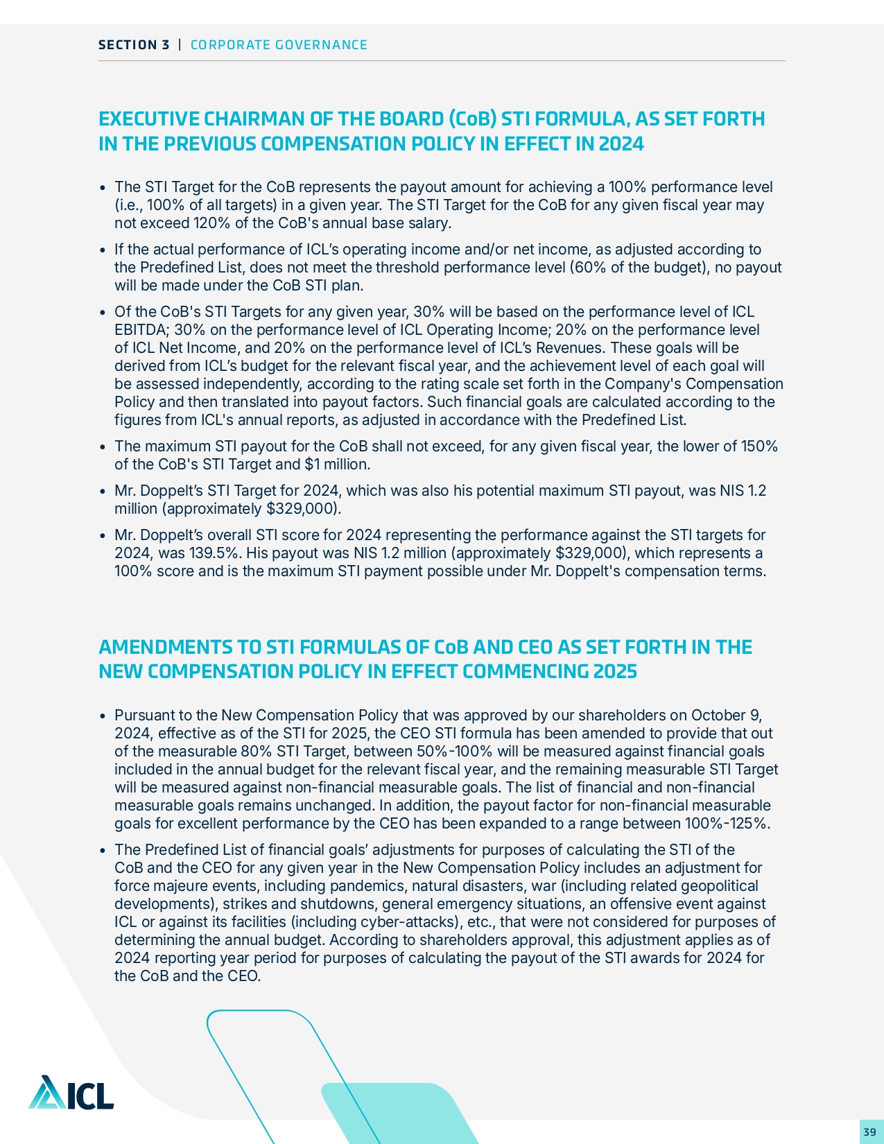 SE C TI O N 3 | C O R P O R at E GOV E R N A N C E董事会执行主席STI公式,如2024年生效的上一个补偿政策中所规定• COB的STI目标代表在给定年份实现100%绩效水平(即所有目标的100%)的支付金额。任何特定财政年度的COB STI目标不得超过COB年基本工资的120%。•如果根据预定名单调整的ICL的营业收入和/或净收入的实际业绩未达到阈值业绩水平(预算的60%),则不会在CoB STI计划下进行支付。•在任何一年的COB STI目标中,30%将基于ICL EBITDA的业绩水平;30%基于ICL营业收入的业绩水平;20%基于ICL净利润的业绩水平,以及20%基于ICL收入的业绩水平。这些目标将来自于ICL在相关财政年度的预算,每个目标的实现水平将根据公司薪酬政策中规定的评级等级进行独立评估,然后转化为支付因子。此类财务目标是根据ICL年度报告中的数字计算得出的,并按照预定名单进行了调整。•在任何特定财政年度,COB的最高STI支出不得超过COB STI目标的150%和100万美元中的较低者。• Doppelt先生的2024年STI目标,也是他潜在的最高STI支出,为120万新谢克尔(约合32.9万美元)。• Doppelt先生的2024年STI总分代表与2024年STI目标相比的表现,为139.5%。他的赔款为120万新谢克尔(约合32.9万美元),这代表了100%的分数,是Doppelt先生赔偿条款下可能的最高STI赔款。新的薪酬政策中规定的对COB和CEO STI公式的修订实际上开始于2025年•根据我们的股东于2024年10月9日批准的新薪酬政策,自STI于2025年生效,CEO STI公式已被修订,规定在可衡量的80% STI目标中,50%-100 %之间将根据相关财政年度年度年度年度预算中包含的财务目标进行衡量,剩余的可衡量STI目标将根据非财务可衡量目标进行衡量。财政和非财政可衡量目标清单保持不变。此外,CEO卓越绩效的非财务可衡量目标的支付系数扩大到100%-125 %之间的范围。•新薪酬政策中为计算欧洲央行和首席执行官在任何特定年份的STI而预先定义的财务目标调整清单包括针对不可抗力事件的调整,包括流行病、自然灾害、战争(包括相关的地缘政治发展)、罢工和停工、一般紧急情况、针对ICL或其设施的进攻性事件(包括网络攻击)等,这些在确定年度预算时并未考虑。根据股东批准,这一调整自2024年报告年度期间起适用,用于计算2024年COB和CEO的STI奖励支出。39