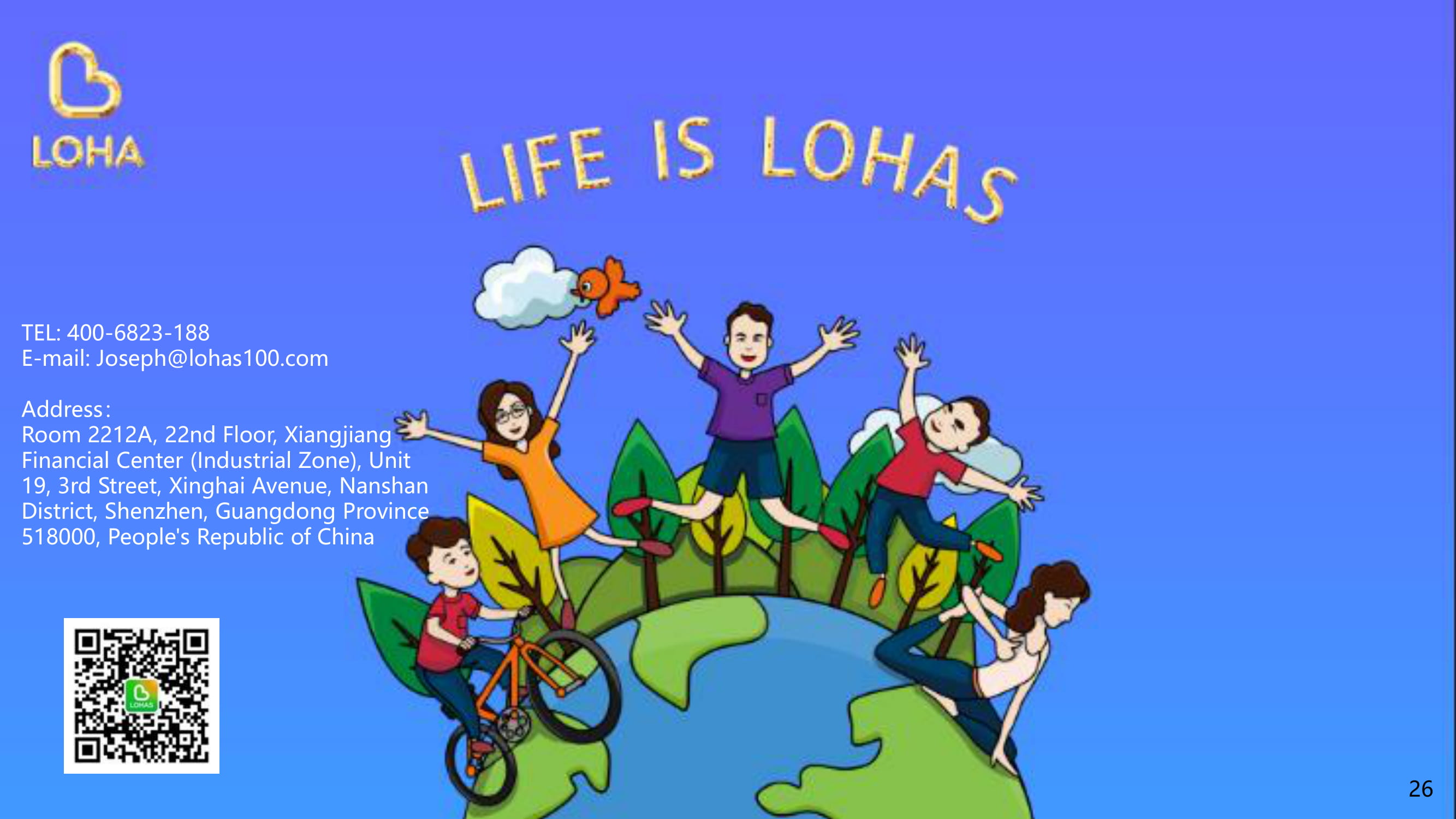 联系电话:400-6823-188E-mail:joseph@lohas100.com地址:广东省深圳市南山区星海大道三街19单元香江金融中心(工业区)22楼2212a室51800中华人民共和国26