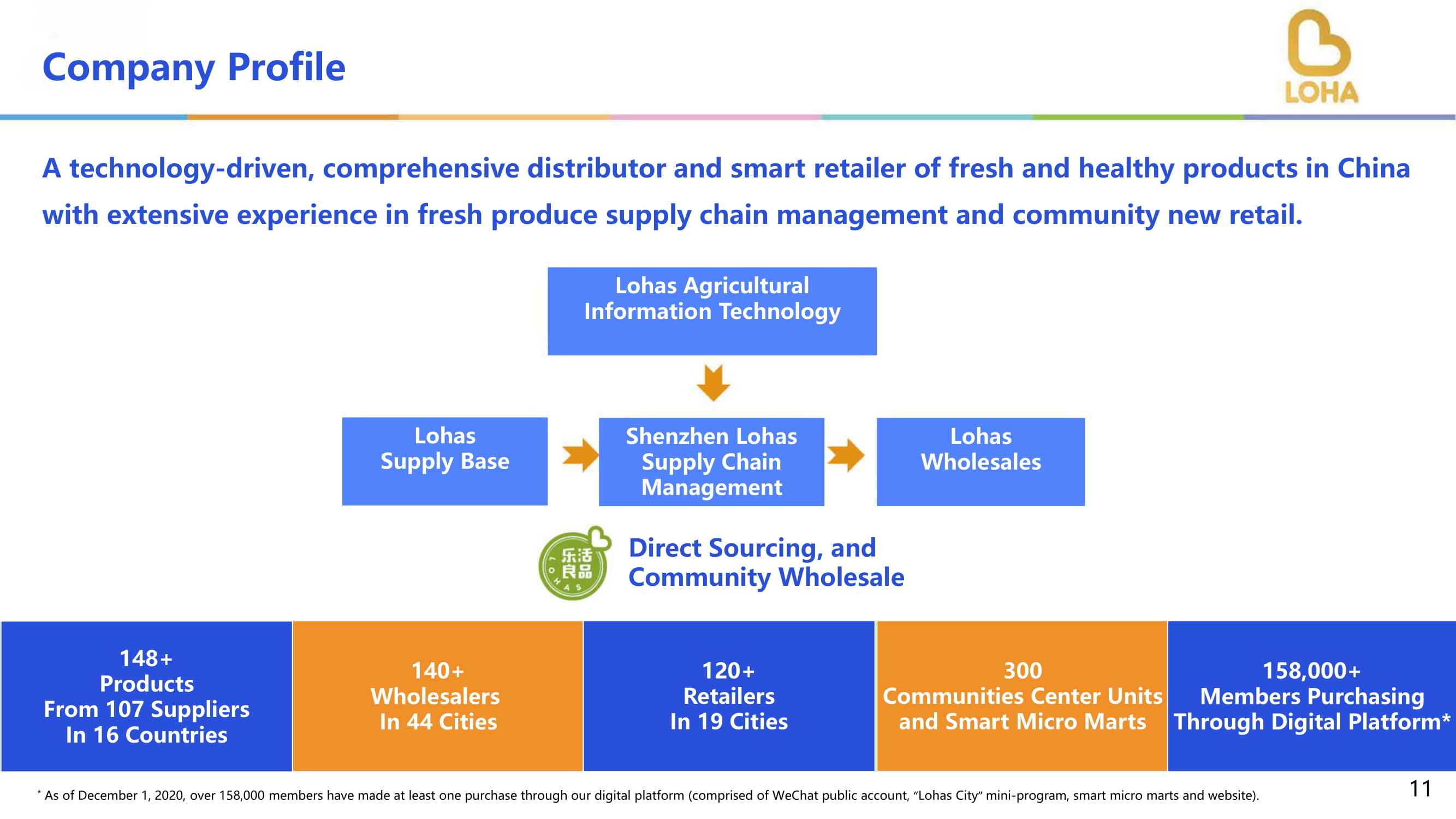 公司简介在生鲜产品供应链管理和社区新零售方面拥有丰富经验的中国生鲜健康产品技术驱动型综合分销商和智慧零售商。乐活农业信息技术乐活供应基地深圳乐活供应链管理乐活批发直采,社区批发148+来自16个国家107家供应商的产品140+44个城市的批发商120+19个城市的零售商300个社区中心单元和智能微集市15.8万+会员通过数字平台采购*11*截至2020202月1日,已有超15.8万会员通过我们的数字平台进行了至少一次采购(由微信公众号、乐活城"小程序、智能微集市和网站)。