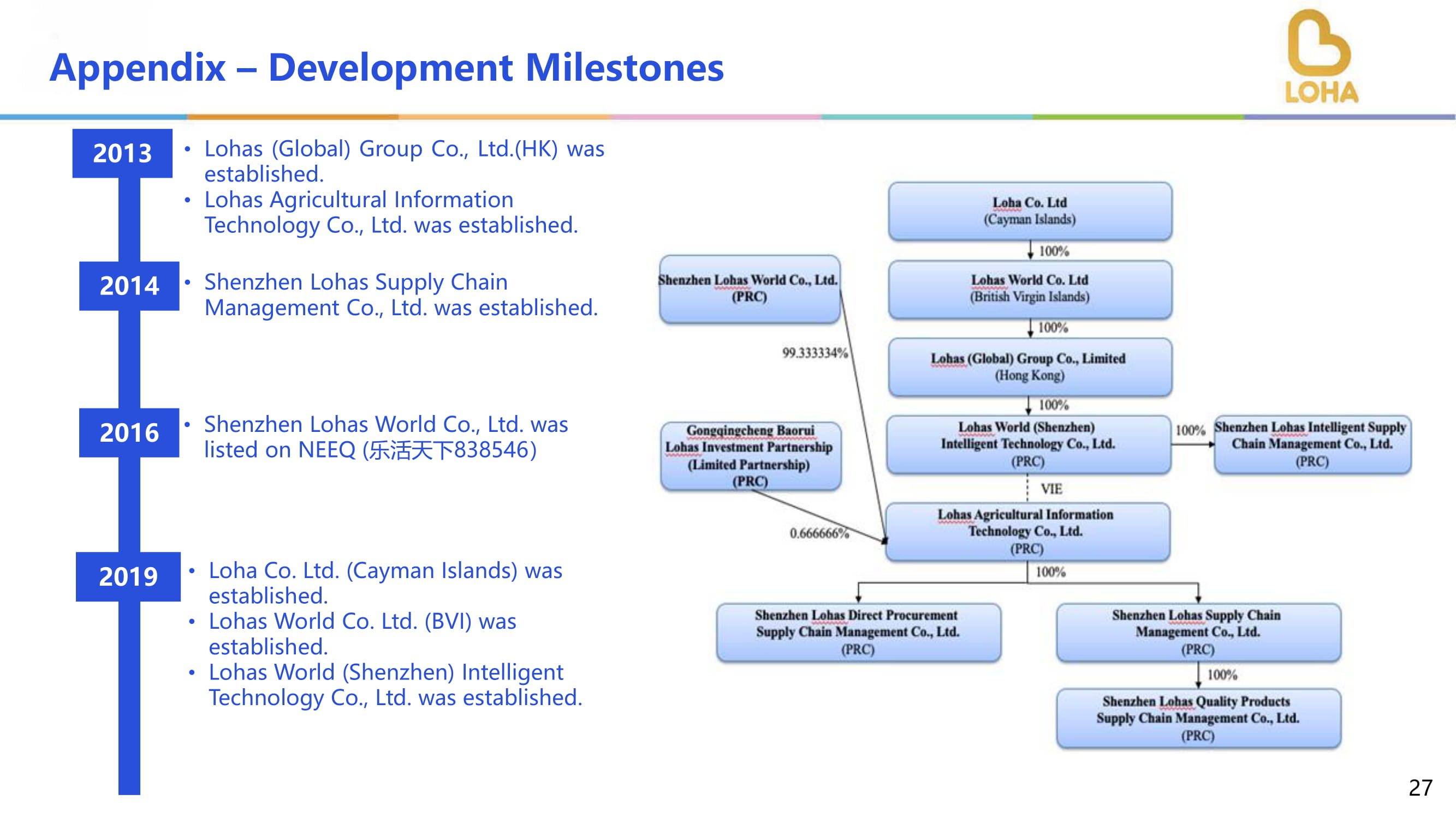 !乐活(全球)集团有限公司。股份有限公司。(HK)成立。!乐活农业信息技术有限公司成立。深圳市乐活供应链管理有限公司成立。2019!洛哈有限公司(开曼群岛)成立。!乐活世界有限公司(BVI)成立。!乐活世界(深圳)智能科技有限公司成立。201320142016!深圳乐活世界股份有限公司在新三板挂牌(乐活天下838546)附录-发展里程碑27