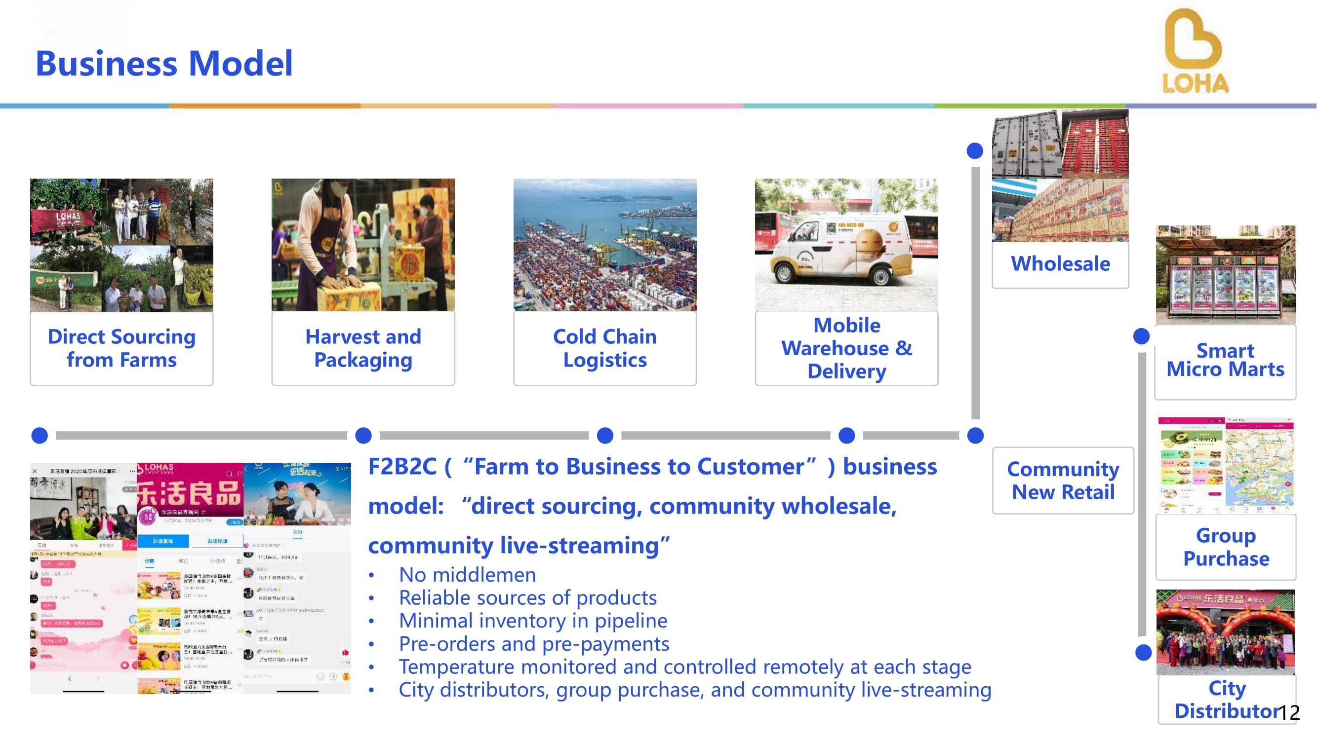 农场直采包装冷链物流移动仓储配送F2B2C(“农场对企业对客户”)商业模式:“直采、社区批发、社区直播”!无中间商可靠货源!流水线中库存最少订单预购和预付款温度每阶段远程监控!城市经销商、团购、及社区直播批发智能微集市团购城分销商社区新零售商业模式12