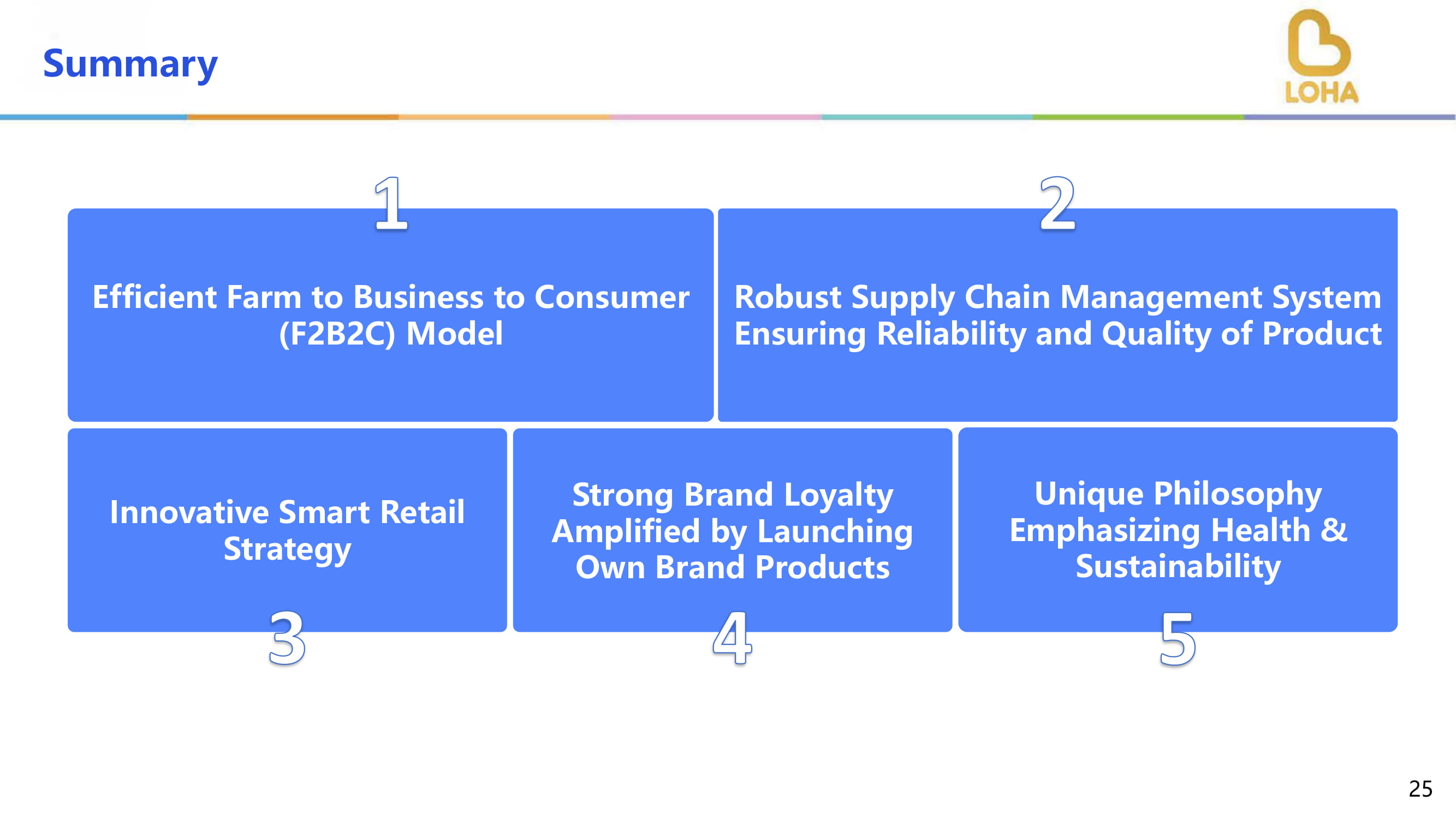 通过推出自有品牌产品增强强大的品牌忠诚度稳健的供应链管理系统确保产品的可靠性和质量高效农场对企业对消费者(F2B2C)模式独特的理念强调健康和可持续性创新的智慧零售战略25