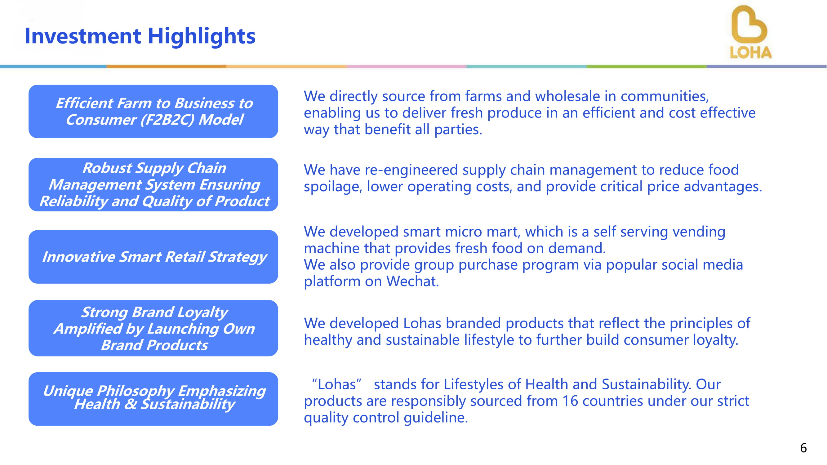我们直接从农场进货,并在社区批发,使我们能够以高效和成本效益高的方式提供新鲜产品,使各方受益。我们重新设计了供应链管理,以减少食品变质,降低运营成本,并提供关键的价格优势。创新的智慧零售战略我们开发了Smart Micro Mart,这是一款自助贩卖机,提供按需生鲜。我们还通过微信上流行的社交媒体平台提供团购计划。“乐活”代表健康和可持续的生活方式。我们的产品是根据我们严格的质量控制方针,负责任地从16个国家采购。投资亮点6强品牌忠诚度放大推出自有品牌产品我们开发了体现健康可持续生活方式原则的乐活品牌产品,以进一步建立消费者忠诚度。强大的供应链管理系统确保产品的可靠性和质量高效农场到企业到消费者(F2B2C)模式强调健康和可持续性的独特理念